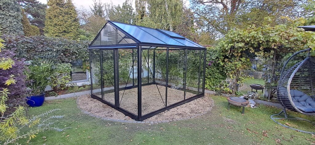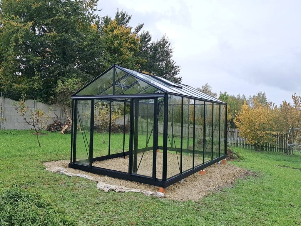 Montaż szklarni ogrodowej Euro Maxi o wymiarach 309cm x 457cm. Aluminiowa konstrukcja w kolorze RAL 9005 – czarny strukturalny została w całości pokryta szybą hartowaną 4mm. Na dachu zamontowano trzy okna z mechanizmem otwierania Spindel. Na krótszej ścianie podwójne drzwi przesuwne o szerokości 2x70cm. Wysokość ścian to 201cm, a wysokość kalenicy 270cm. Miejsce montażu – […]