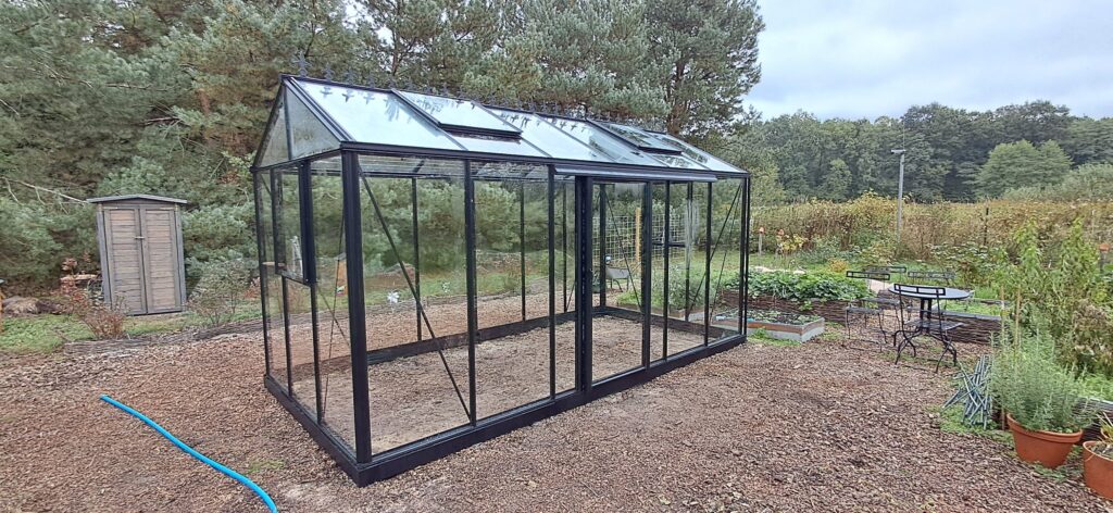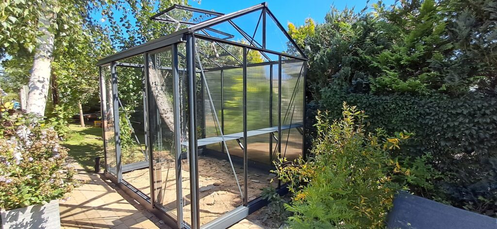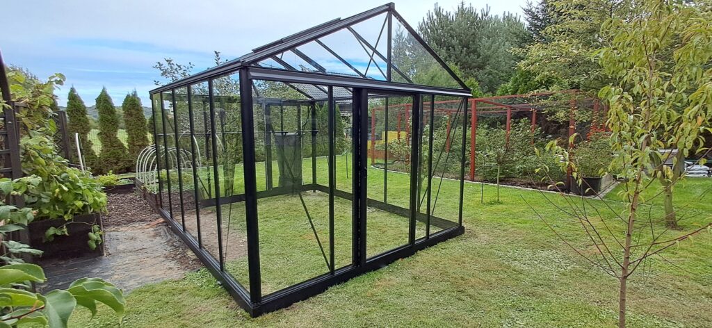 Montaż szklarni ogrodowej Euro Maxi o wymiarach 236cm x 380cm. Aluminiowa konstrukcja w kolorze RAL 9005 – czarny głęboki strukturalny została w całości pokryta szybą hartowaną 4mm. Na dachu zamontowano dwa okna z automatycznym mechanizmem otwierania. Na krótszej ścianie pojedyncze drzwi przesuwne o szerokości 84cm. Na przeciwnej ścianie okno ścienne uchylne z systemem AXA-FLEX. Wewnątrz […]