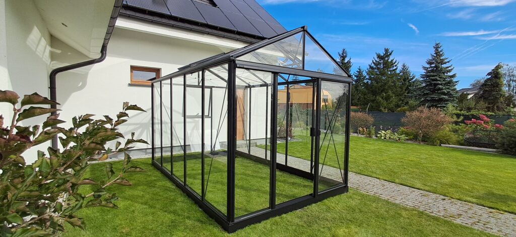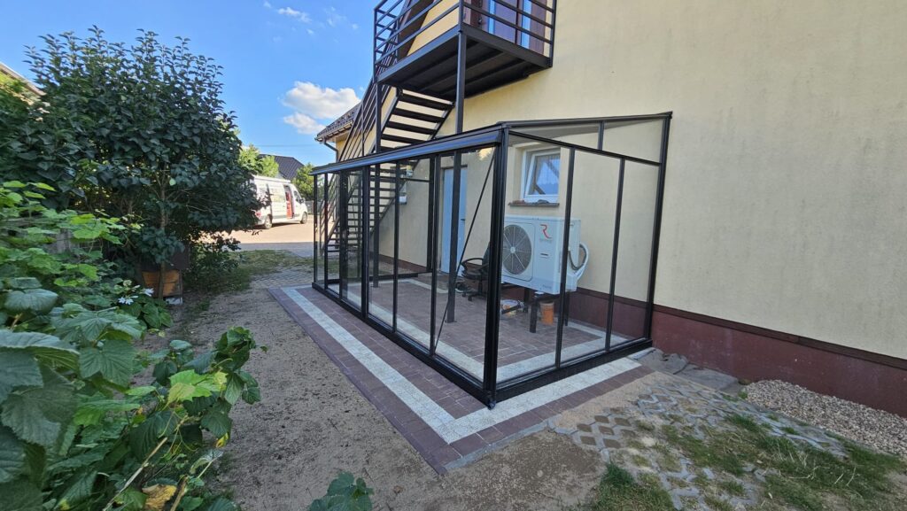 Montaż szklarni przyściennej Euro Veranda o wymiarach 233cm x 457cm. Aluminiowa konstrukcja w kolorze RAL 9005 – czarny głęboki strukturalny została w całości pokryta szybą hartowaną 4mm. Na dłuższej ścianie zamontowano pojedyncze drzwi przesuwne o szerokości 84cm. Wysokość ścian to 201cm, a wysokość kalenicy 252cm. Miejsce montażu – Przystajń w województwie śląskim.