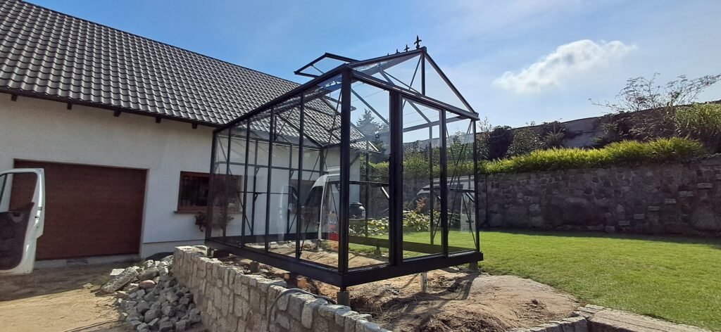 Montaż szklarni ogrodowej Euro Maxi o wymiarach 236cm x 380cm. Aluminiowa konstrukcja w kolorze RAL 9005 – czarny głęboki strukturalny została w całości pokryta szybą hartowaną 4mm. Na dachu zamontowano dwa okna z automatycznym mechanizmem otwierania. Na krótszej ścianie pojedyncze drzwi przesuwne o szerokości 84cm. Na kalenicy zdobienie szczytu w wiktoriańskim stylu. Wewnątrz dwie trzyelementowe […]