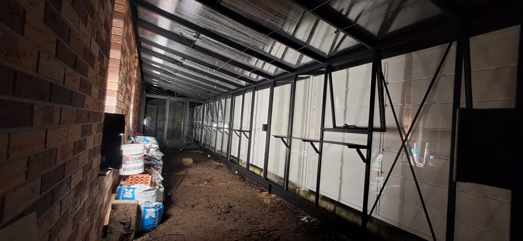 Montaż szklarni przyściennej Euro Muurserre o wymiarach 233cm x 977cm. Aluminiowa konstrukcja w kolorze RAL 9005 – czarny głęboki strukturalny została na dachu pokryta poliwęglanem komorowym 8mm bezbarwnym, a na ścianach szybą hartowaną 4mm. Na dachu zamontowano pięć okien z automatycznym mechanizmem otwierania. Na obu krótszych ścianach pojedyncze drzwi przesuwne o szerokości 84cm. Na dłuższej […]