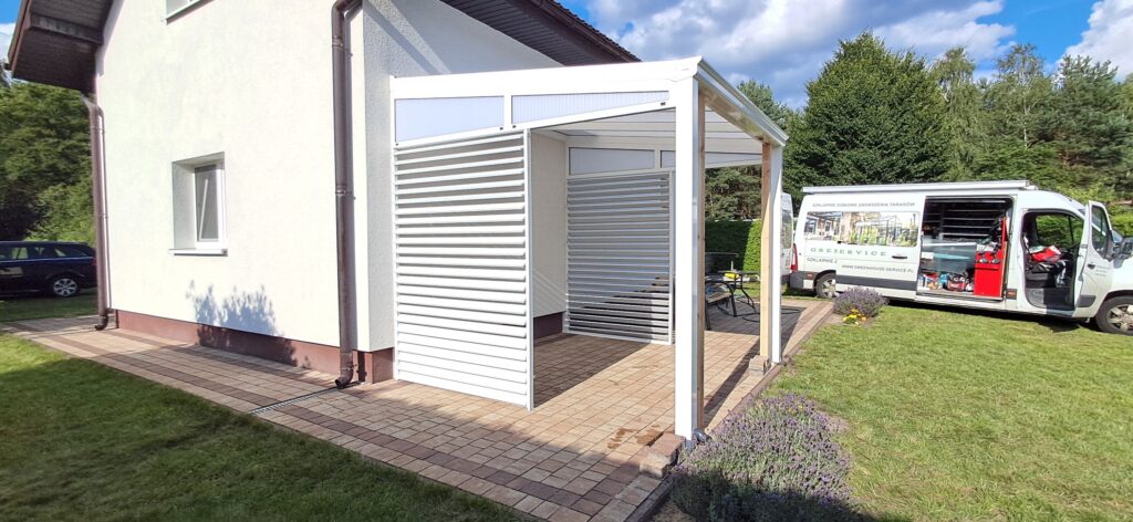 Montaż zadaszenia tarasu V905 o wymiarach 287cm x 300cm. Aluminiowa konstrukcja w kolorze RAL 9010 – biały alpejski została pokryta poliwęglanem komorowym 16mm mlecznym. Po lewej i prawej stronie zamontowano ściany szczytowe Serena wypełnione poliwęglanem komorowym 16mm mlecznym oraz ruchome żaluzje ogrodowe o szerokości 150cm. Zadaszenie podparte dwoma słupami. Profil rynny zamontowano na wysokości 233cm, […]