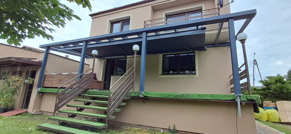 Montaż zadaszenia tarasu V908 o wymiarach 300cm x 926cm. Aluminiowa konstrukcja w kolorze VS716 – antracytowy strukturalny została pokryta szybą bezpieczną laminowaną 44.2 obustronnie hartowaną. Zadaszenie podparte czterema słupami. Profil szczytowy zamontowano na wysokości 235cm, a profil rynny na wysokości 210cm. Pod zadaszeniem zamontowana została markiza tarasowa marki SELT o wymiarach 260cm x 700cm sterowana […]