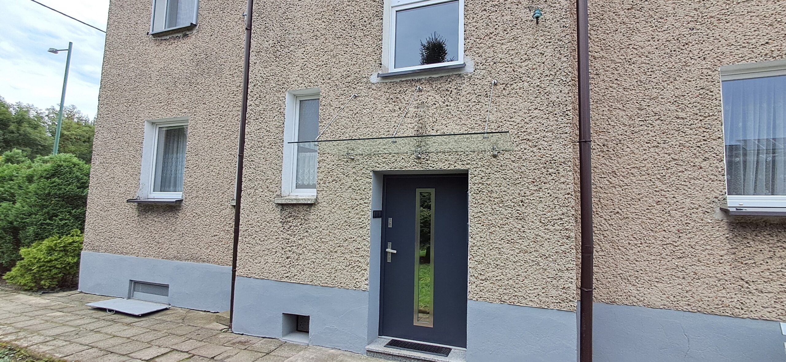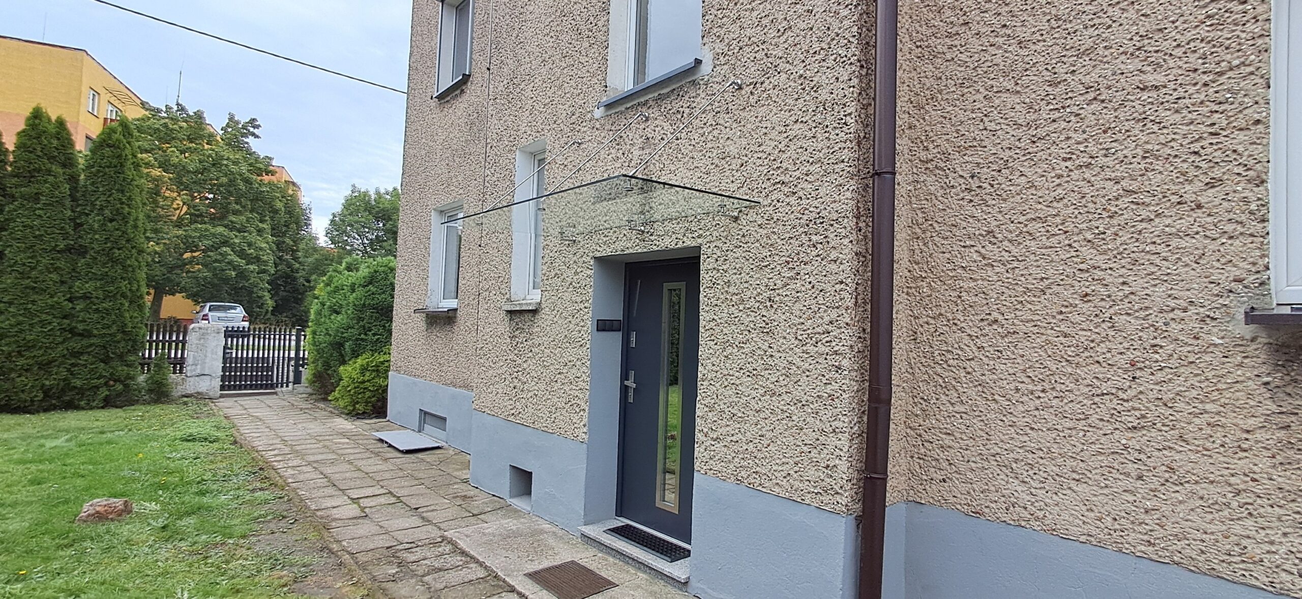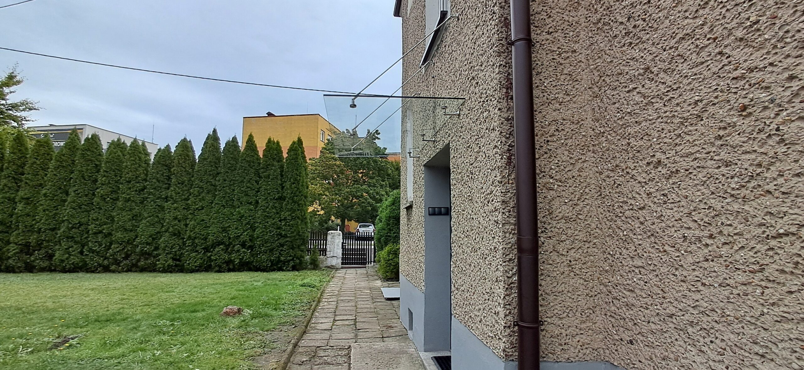Montaż szklanego daszku podwieszanego o wymiarach 100cm x 210cm. Zadaszenie wykonane ze szkła laminowanego 66.2 obustronnie hartowanego zostało podwieszone za pomocą trzech cięgien ze stali nierdzewnej. Miejsce montażu – Lubliniec w województwie śląskim.