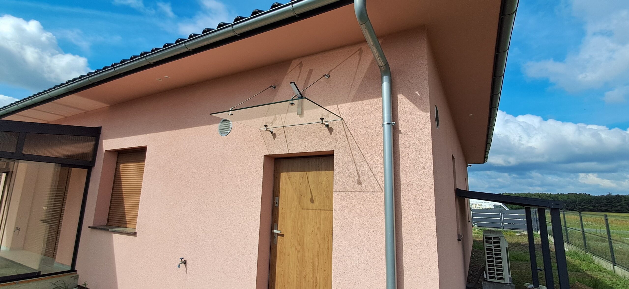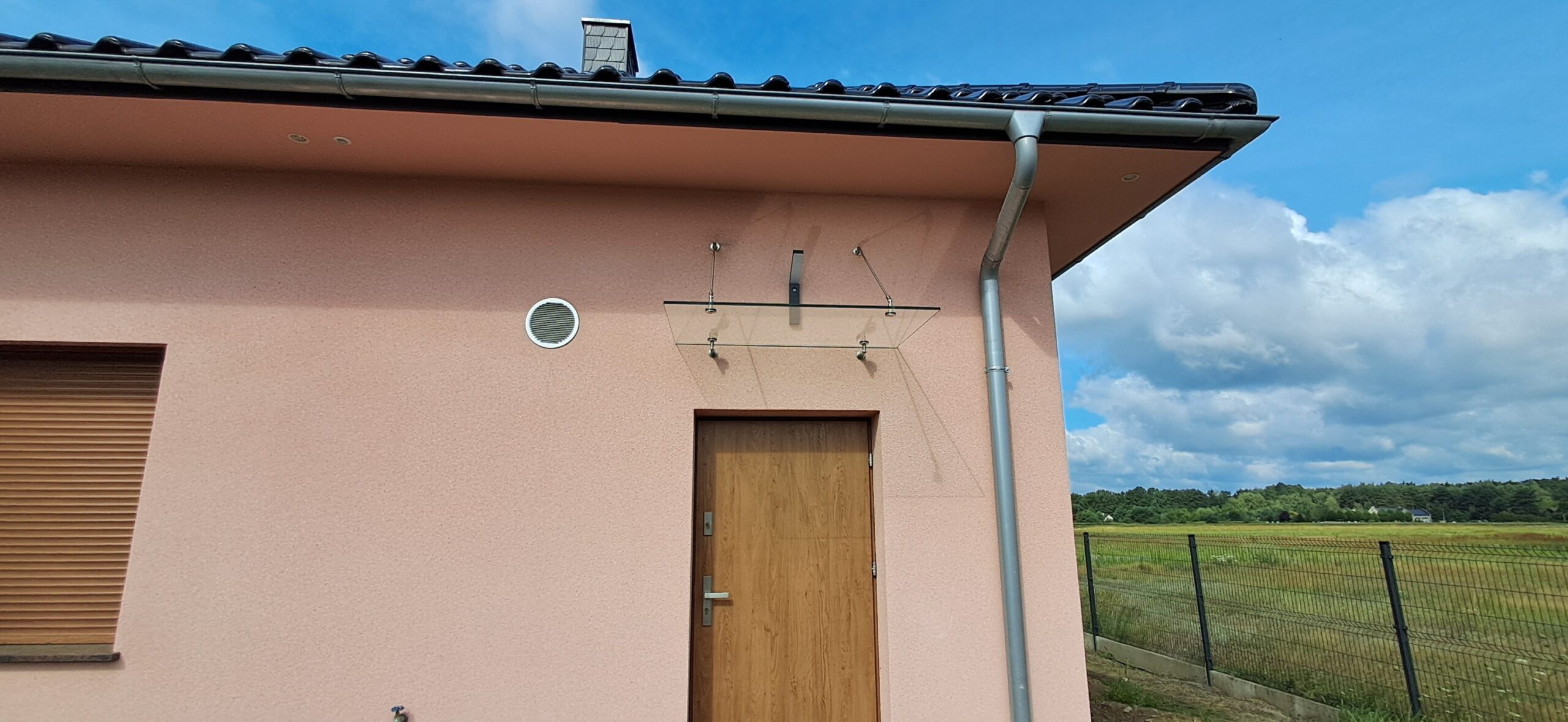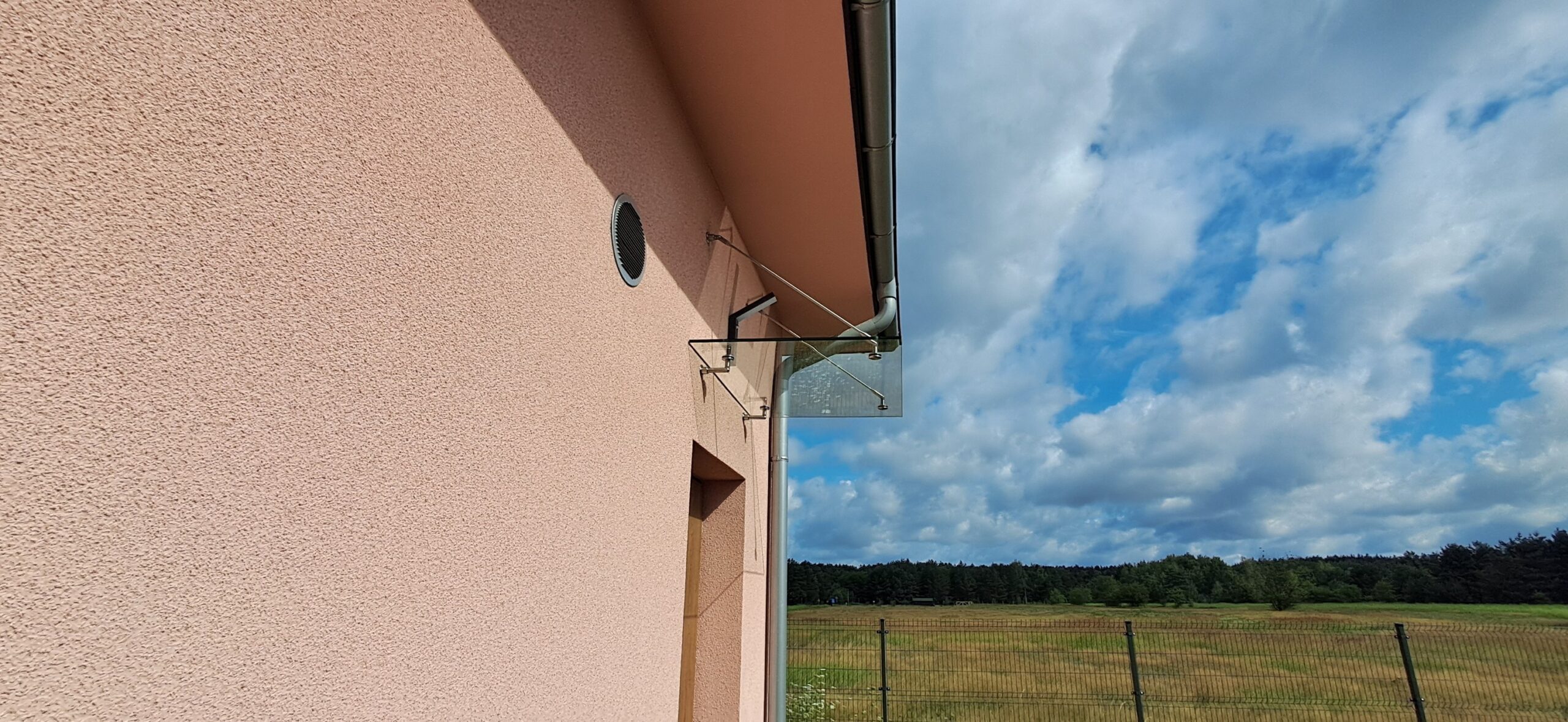 Montaż daszku szklanego o wymiarach 80cm x 120cm podwieszanego na cięgnach ze stali nierdzewnej. Miejsce montażu – Niwki w województwie opolskim.