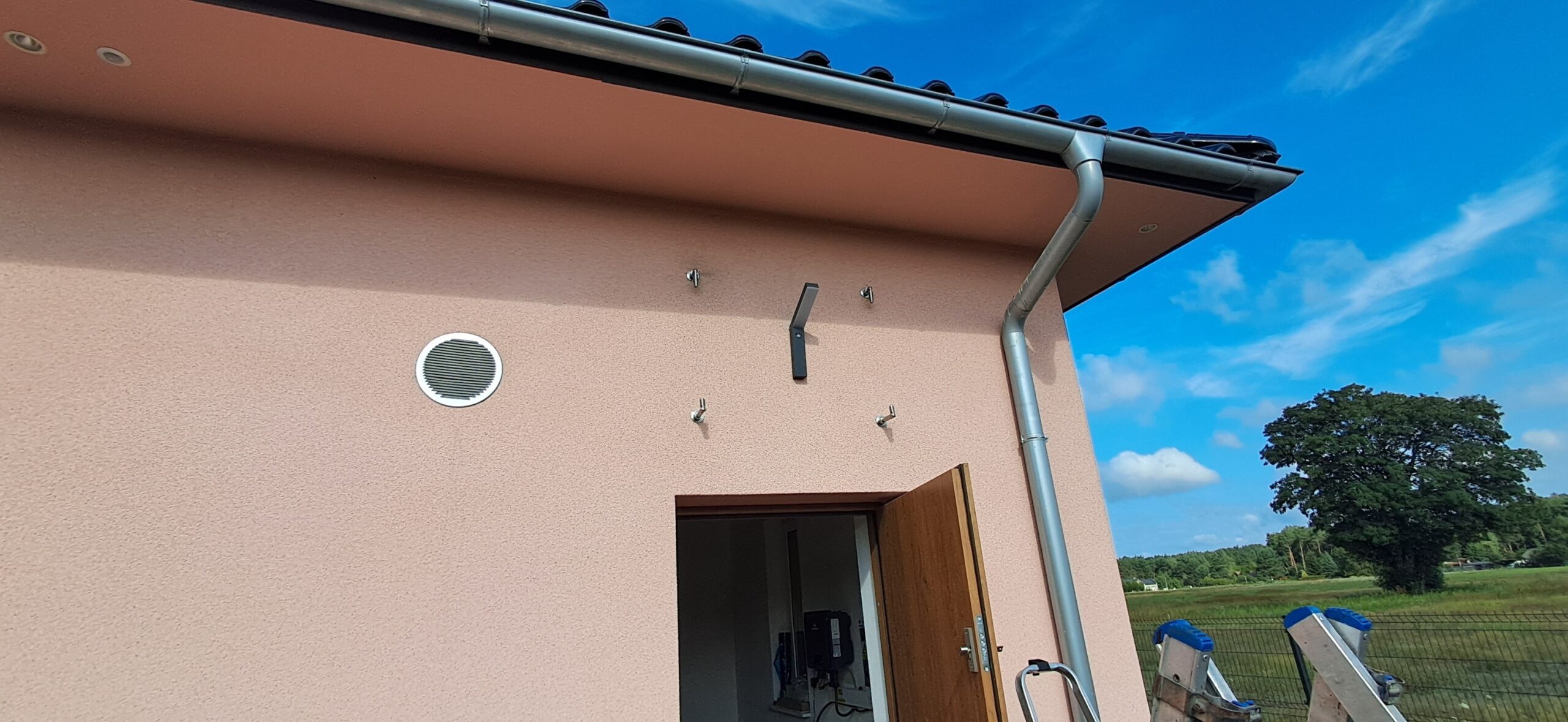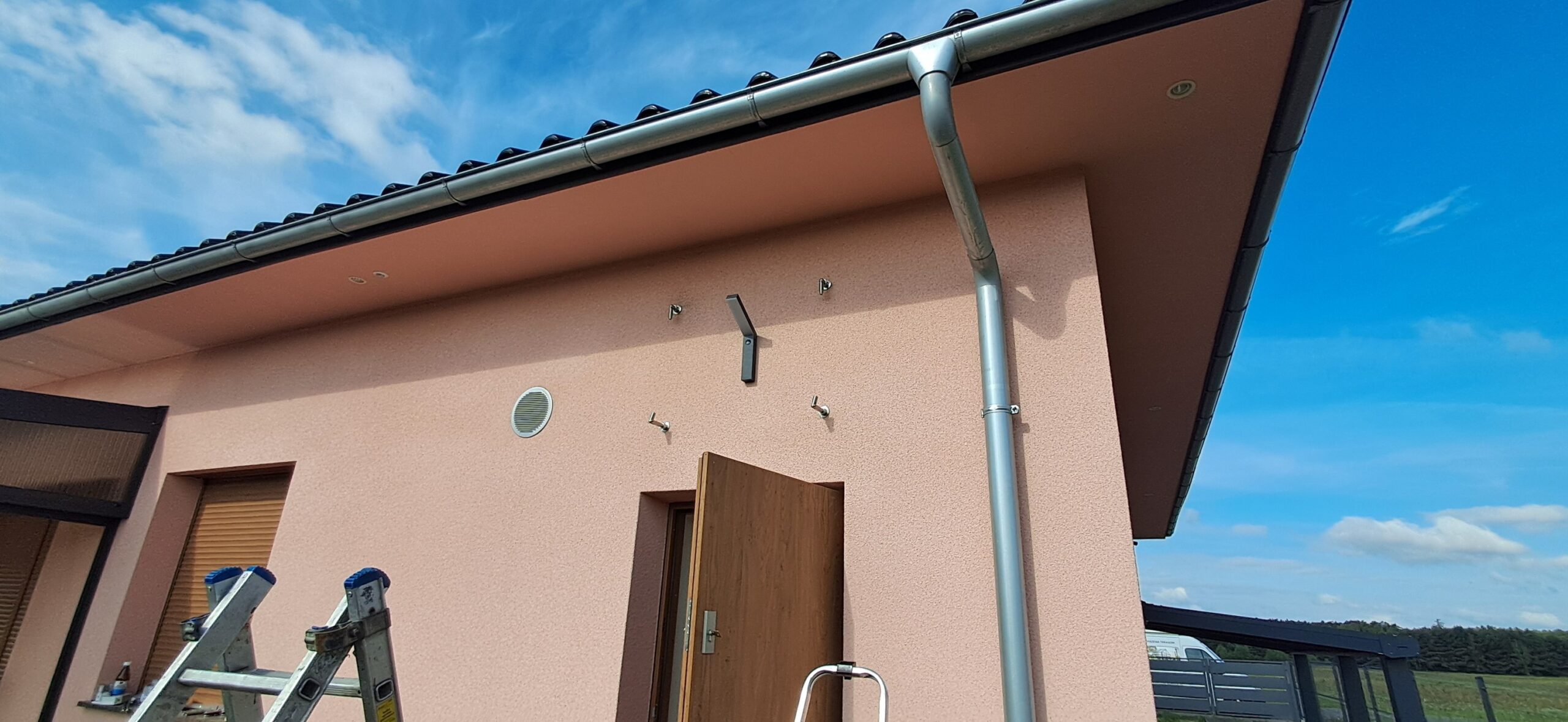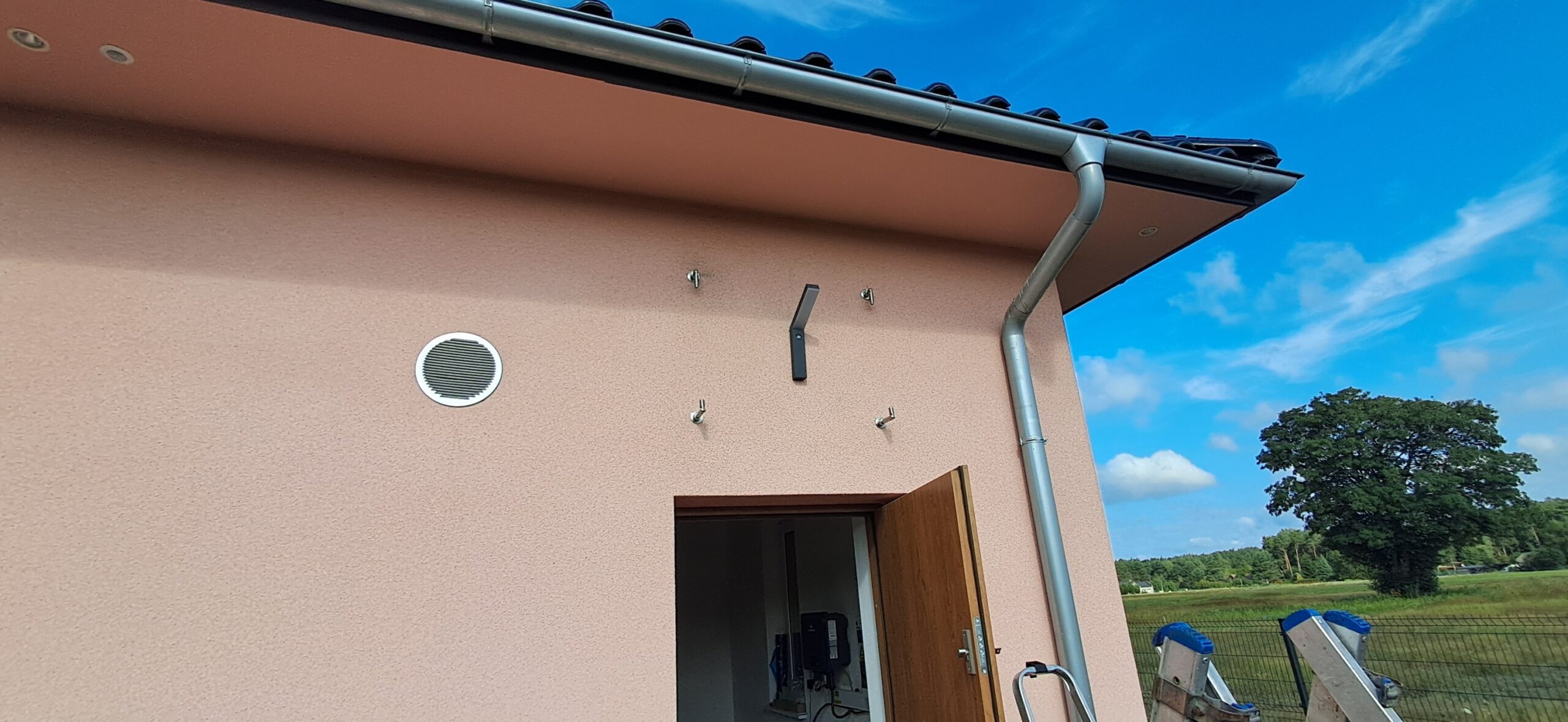 Montaż daszku szklanego o wymiarach 80cm x 120cm podwieszanego na cięgnach ze stali nierdzewnej. Miejsce montażu – Niwki w województwie opolskim.