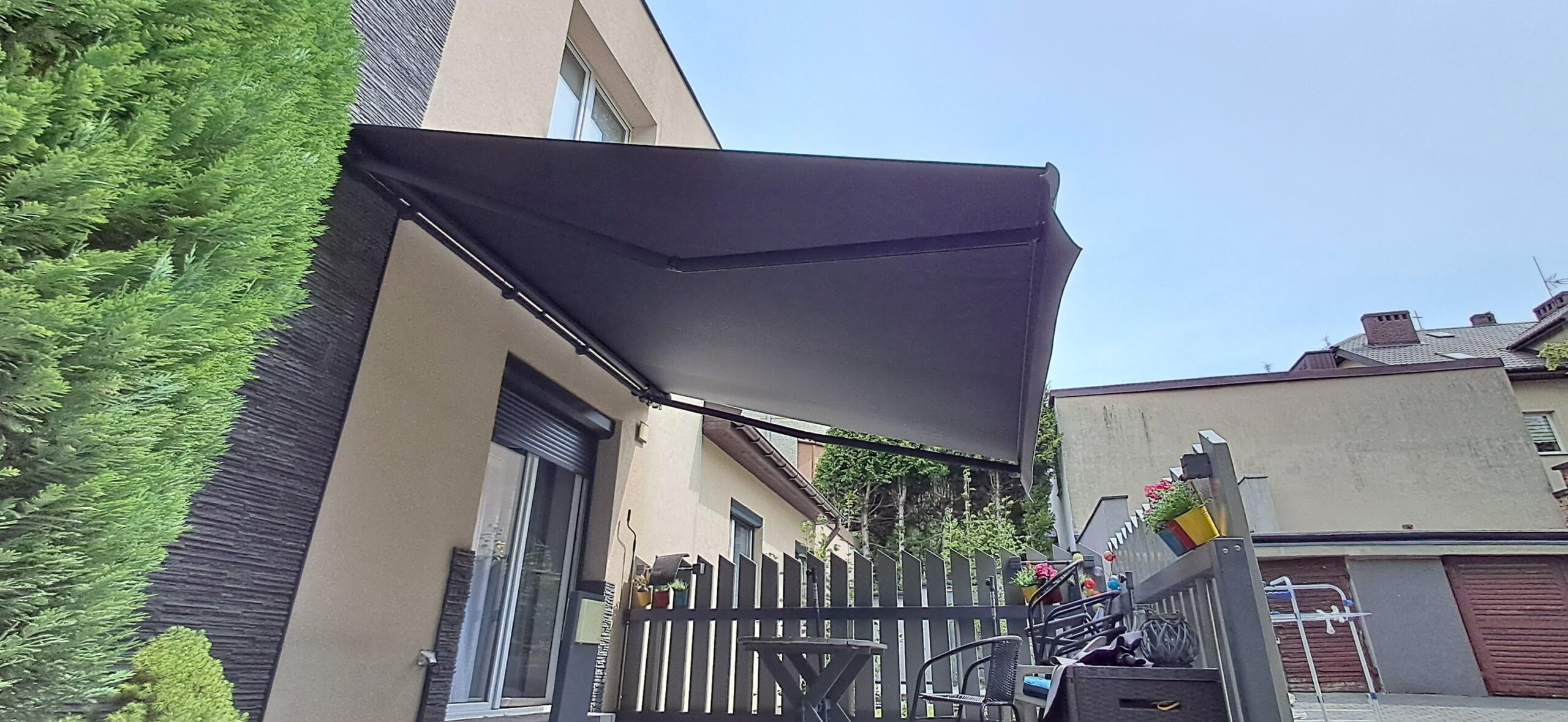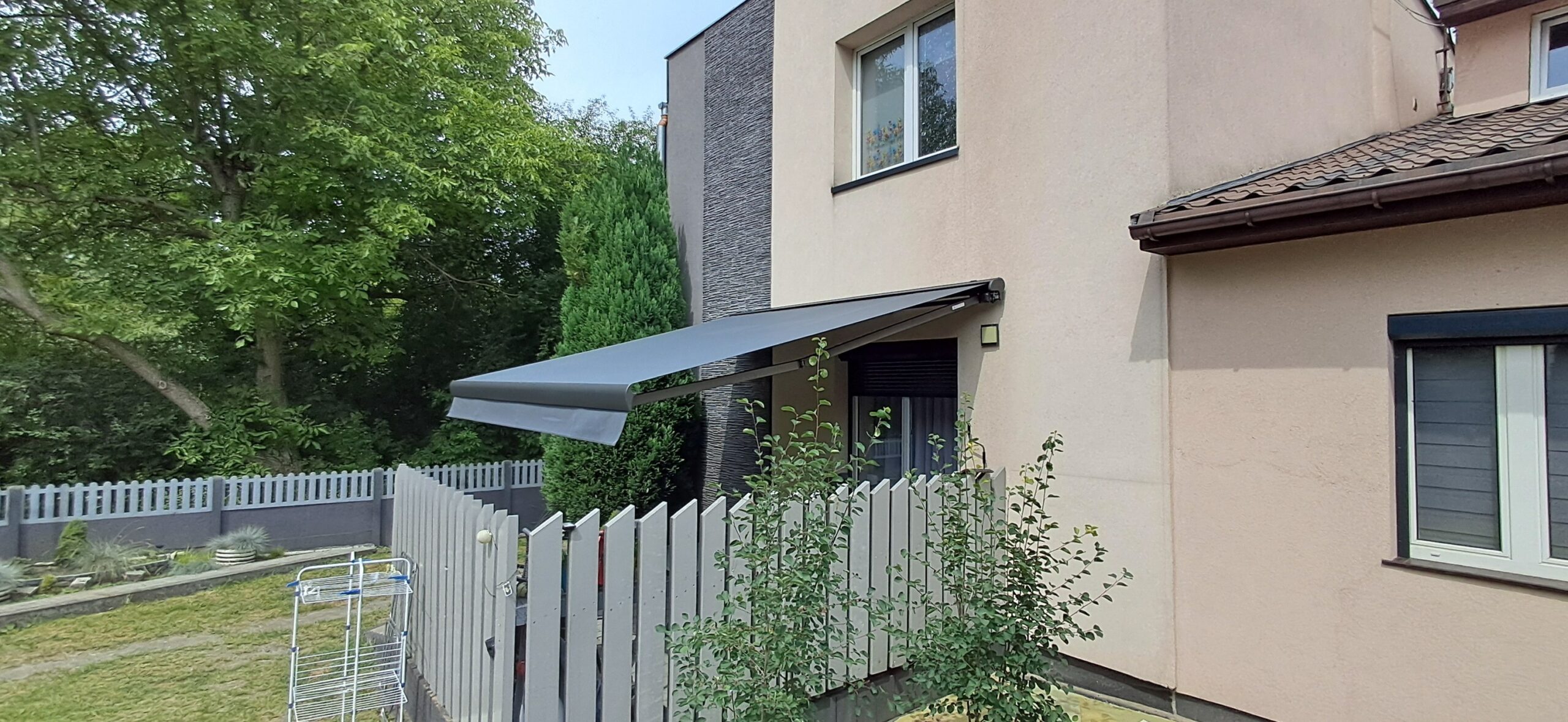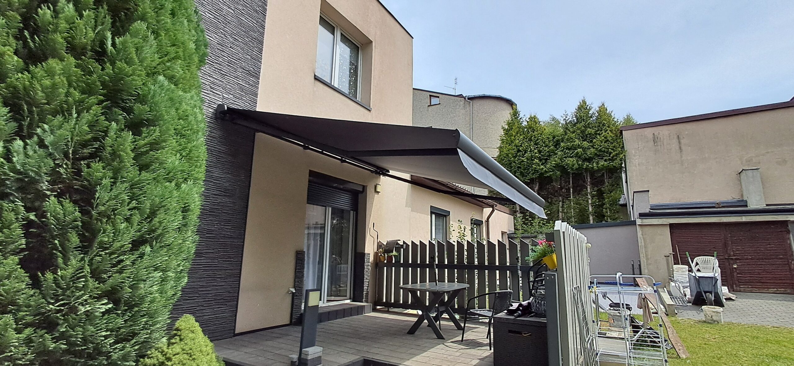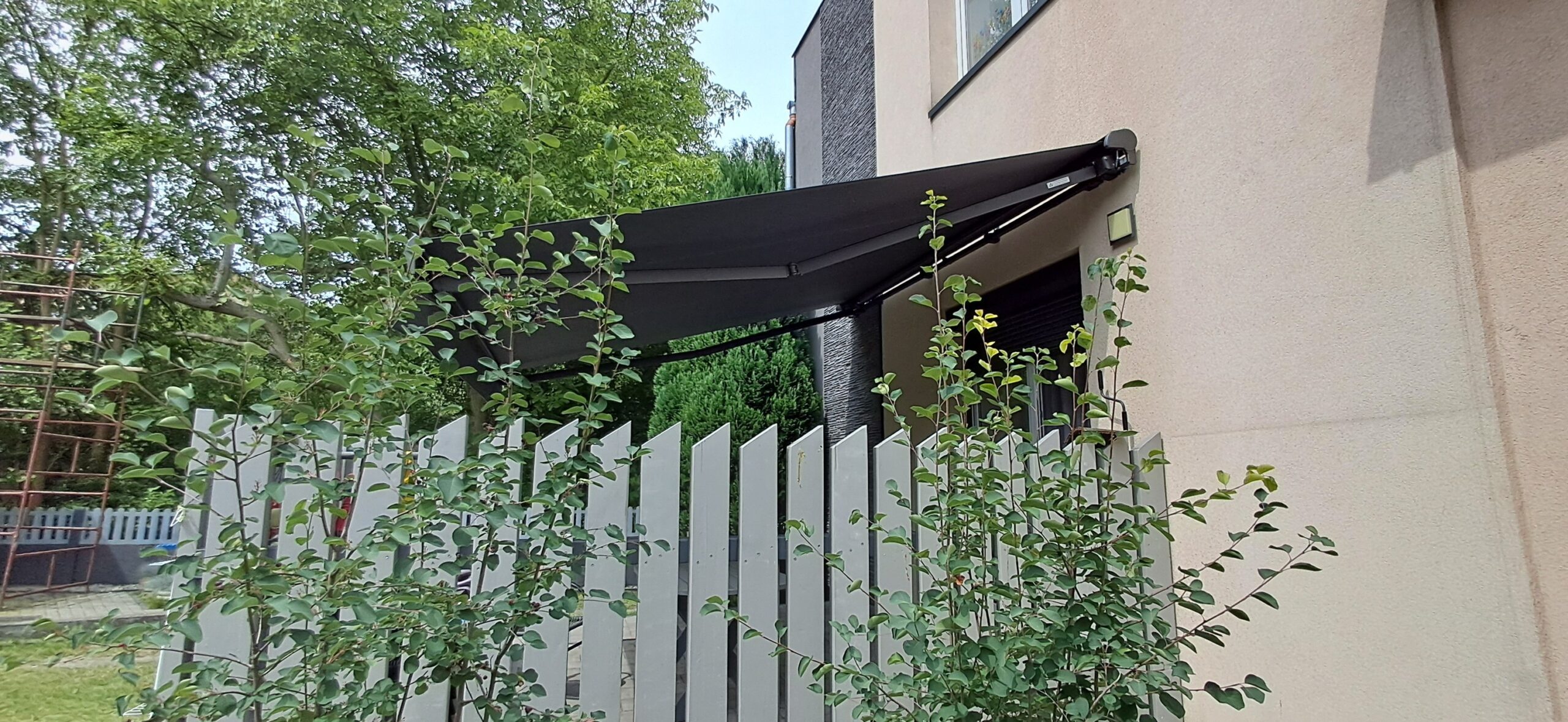 Montaż markizy tarasowej Palladio marki Selt. Markiza o wymiarach 410cm x 360cm w kasecie aluminiowej w kolorze antracytowym została zamontowana na czterech uchwytach. Sterowanie za pomocą pilota Somfy oraz możliwość ręcznego zwijania za pomocą korby. Jako dodatek zamontowano czujnik wiatru Somfy Eolis 3D. Miejsce montażu – Częstochowa w województwie śląskim.