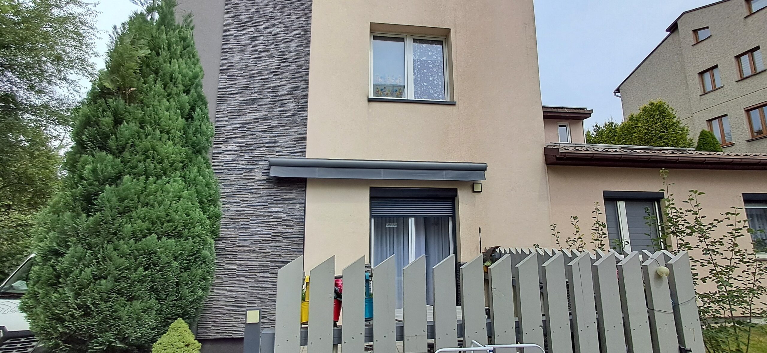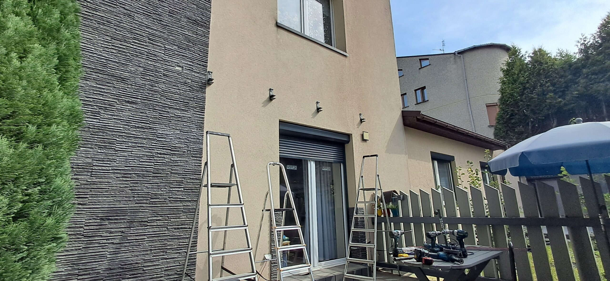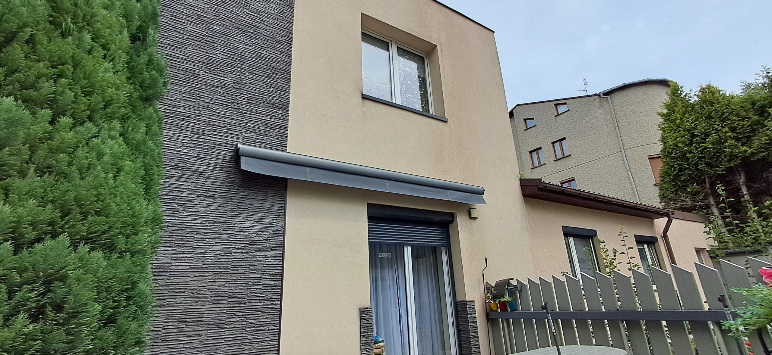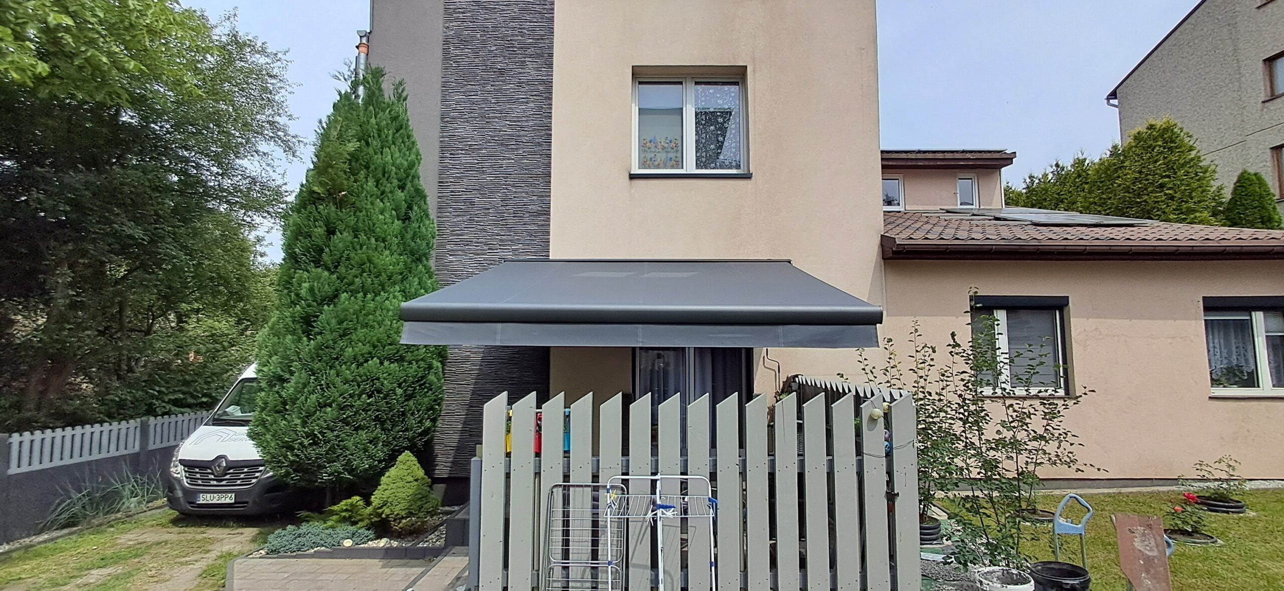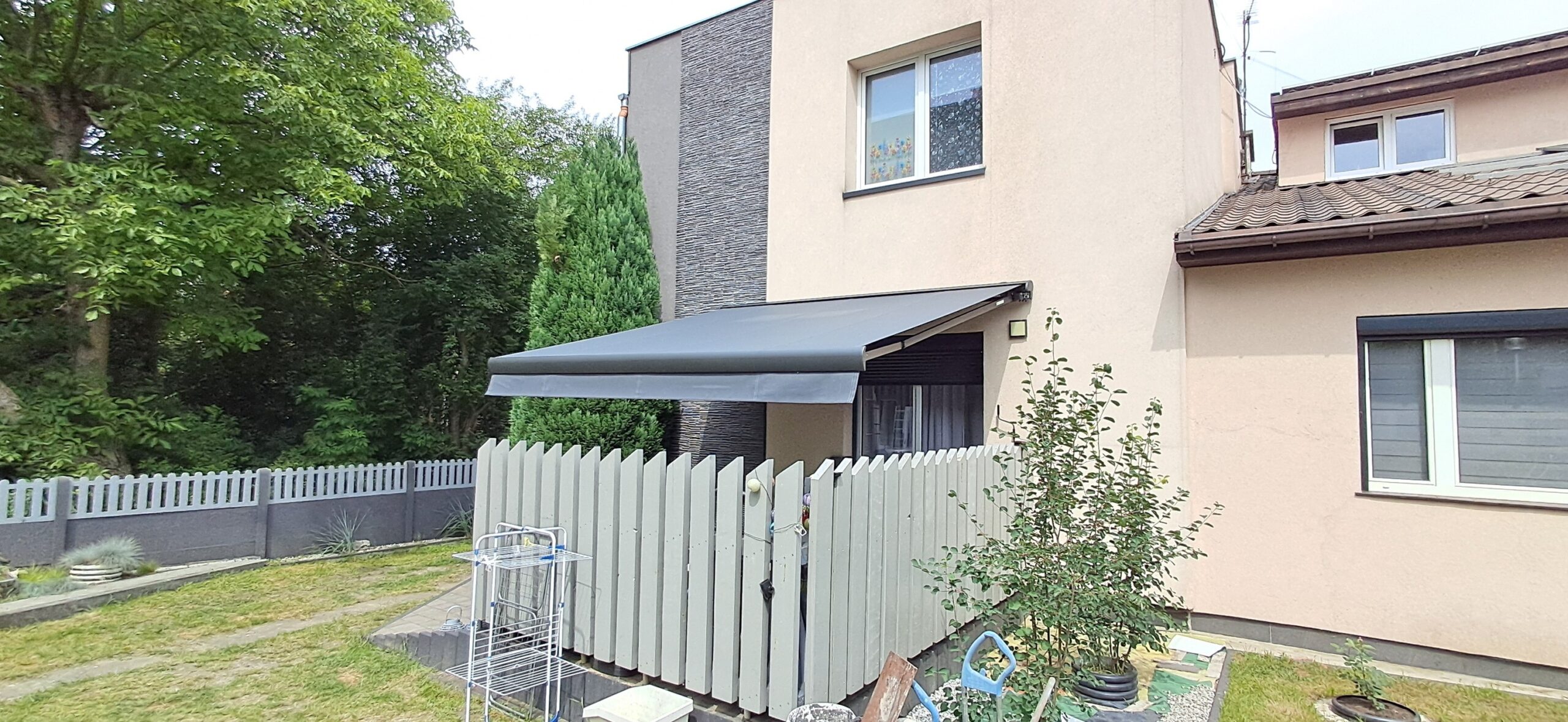 Montaż markizy tarasowej Palladio marki Selt. Markiza o wymiarach 410cm x 360cm w kasecie aluminiowej w kolorze antracytowym została zamontowana na czterech uchwytach. Sterowanie za pomocą pilota Somfy oraz możliwość ręcznego zwijania za pomocą korby. Jako dodatek zamontowano czujnik wiatru Somfy Eolis 3D. Miejsce montażu – Częstochowa w województwie śląskim.