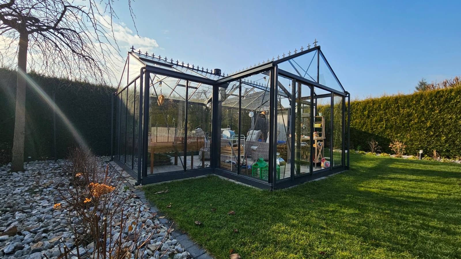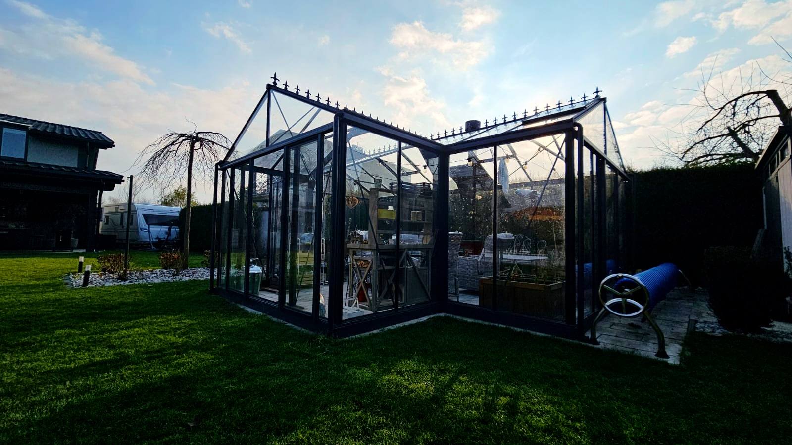 Montaż oranżerii T-Classic od Euro-Serre o wymiarach 309cm x 604cm x 309cm. Aluminiowa konstrukcja w kolorze RAL 7016 – szary antracytowy została w całości pokryta szybą hartowaną 4mm. Na dachu zamontowano cztery okna z automatycznym mechanizmem otwierania. Na frontowej ścianie podwójne drzwi przesuwne o szerokości 2x70cm. Na prawej ścianie pojedyncze drzwi przesuwne o szerokości 84cm. Na kalenicy zdobienie szczytu w wiktoriańskim stylu. Wewnątrz cztery rzędy linek do uprawy warzyw wysokopiennych. Wysokość ścian to 205cm, a wysokość kalenicy 273cm.