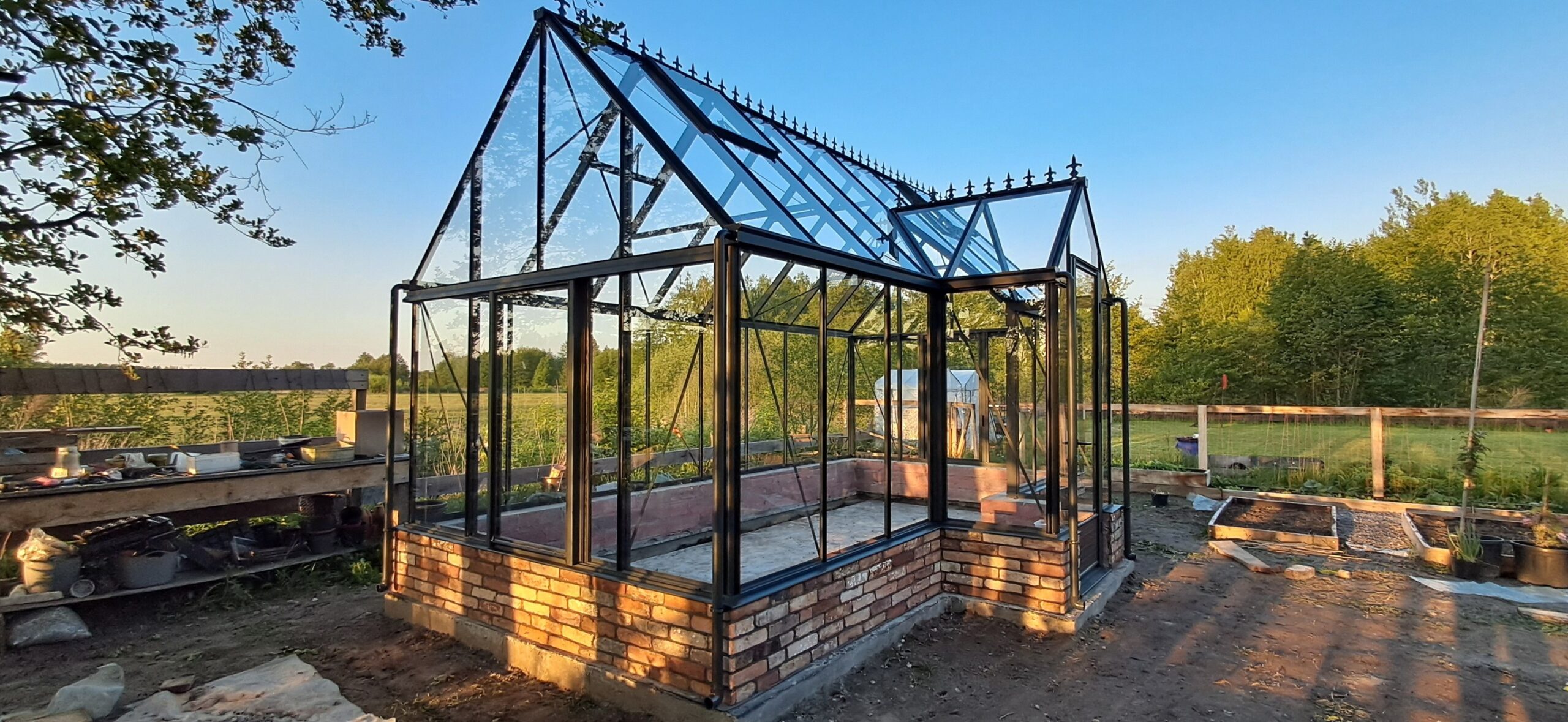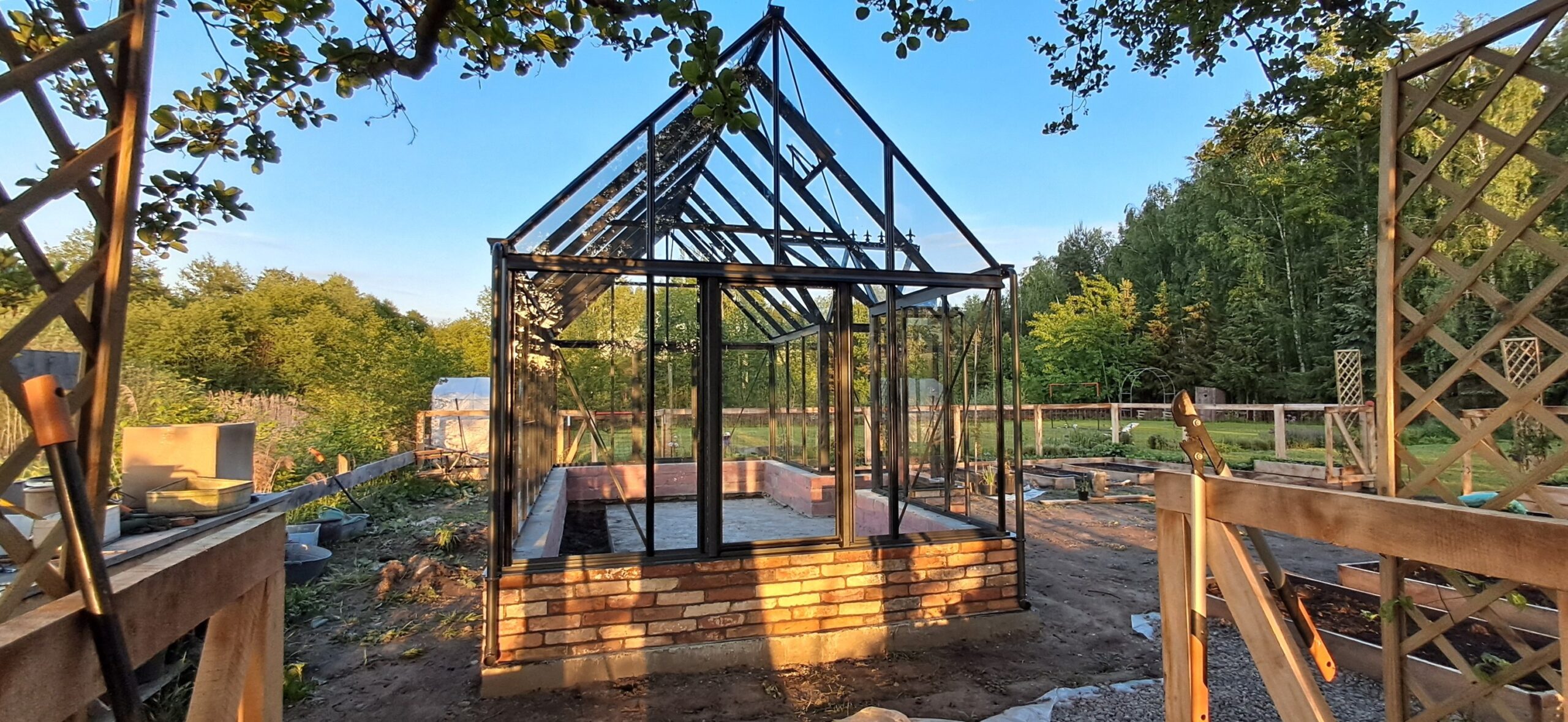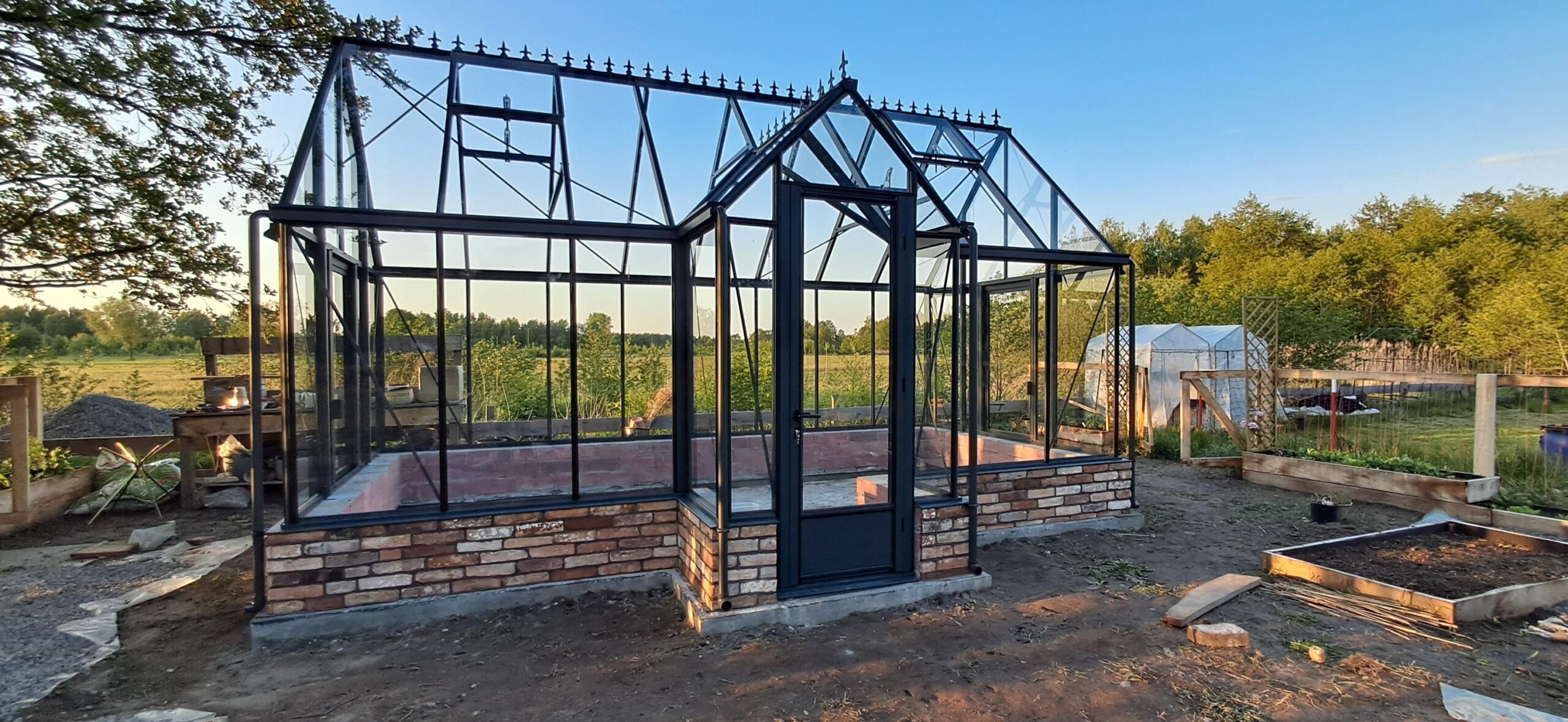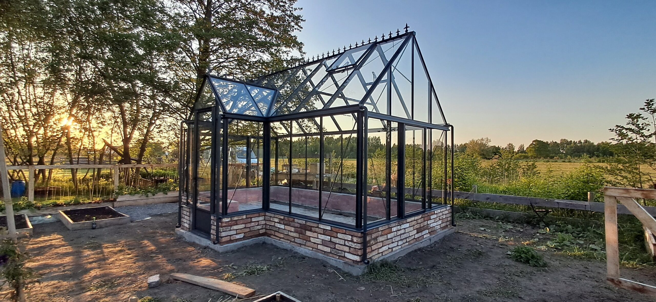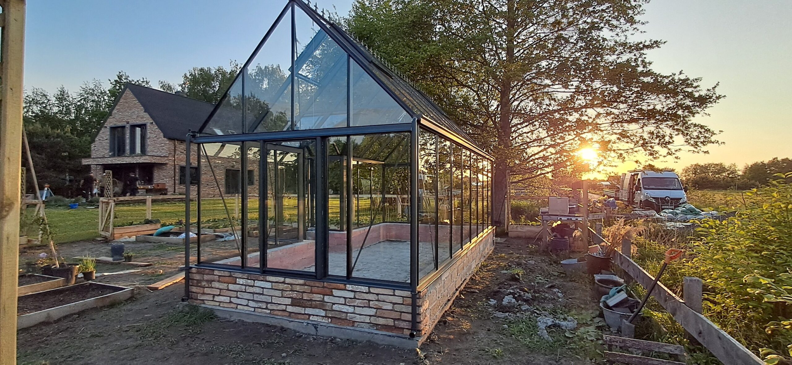Montaż oranżerii Euro Victorian On Wall o wymiarach 161cm x 604cm na podmurówce o wysokości 43cm. Aluminiowa konstrukcja w kolorze RAL 7016 – antracytowy strukturalny została w całości pokryta szybą hartowaną 4mm. Na dachu zamontowano cztery okna z automatycznym mechanizmem otwierania. Na froncie pojedyncze drzwi na zawiasach o szerokości 73cm. Na lewej i prawej ścianie pojedyncze okno przesuwne o szerokości 84cm. Na kalenicy zdobienie szczytu w wiktoriańskim stylu. Wewnątrz dwie linki do uprawy warzyw wysokopiennych. Wysokość ścian to 218cm, a wysokość kalenicy 368cm/295cm. Miejsce montażu – Hipolitów w województwie mazowieckim.