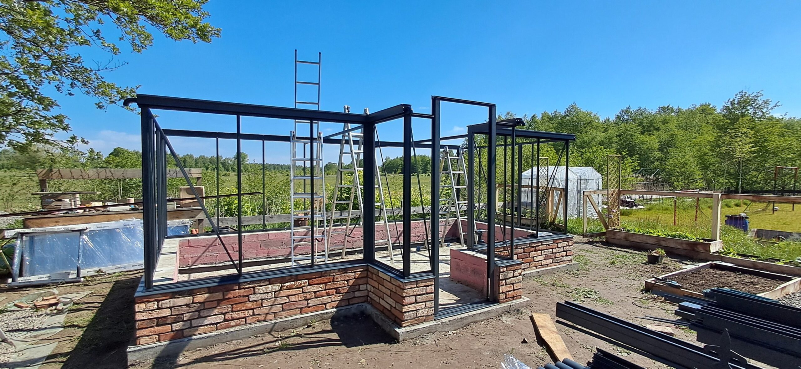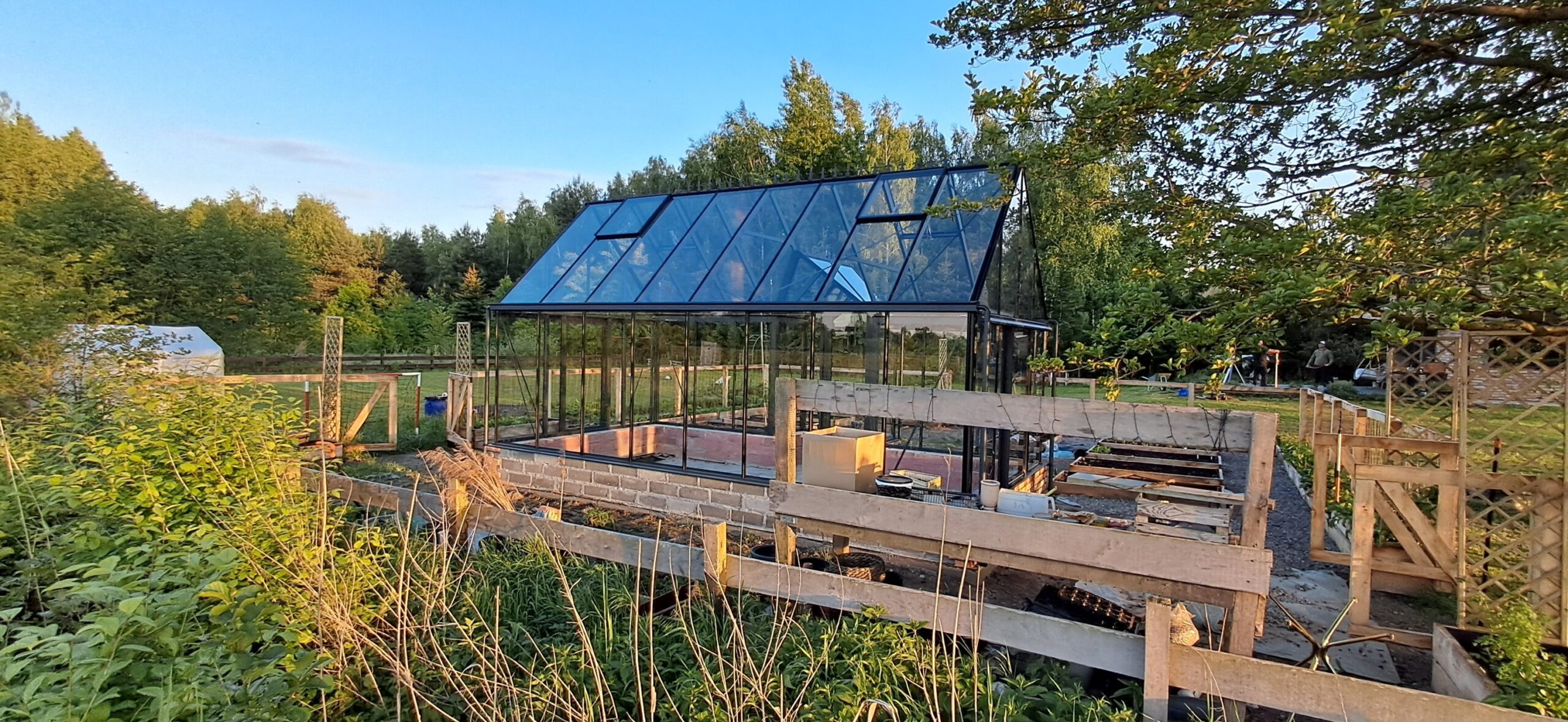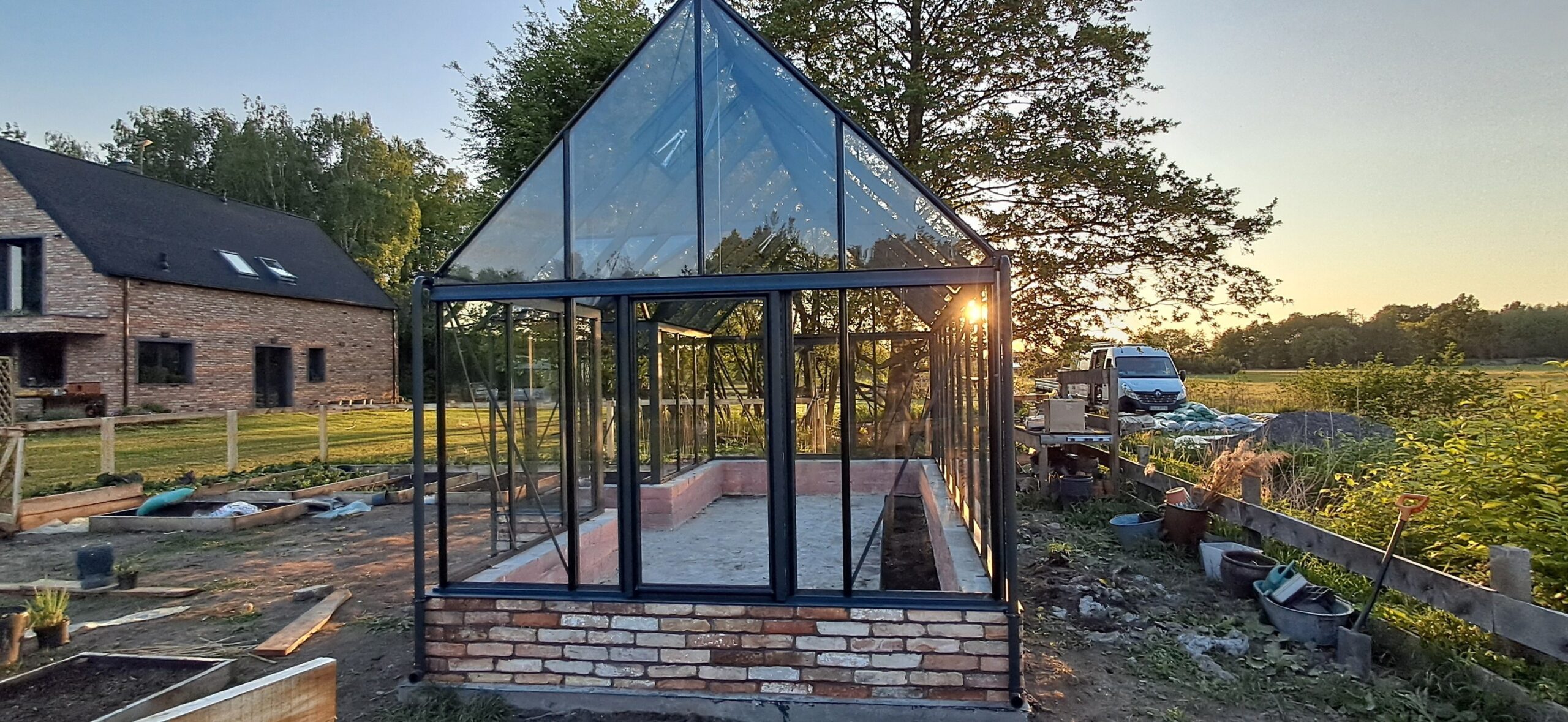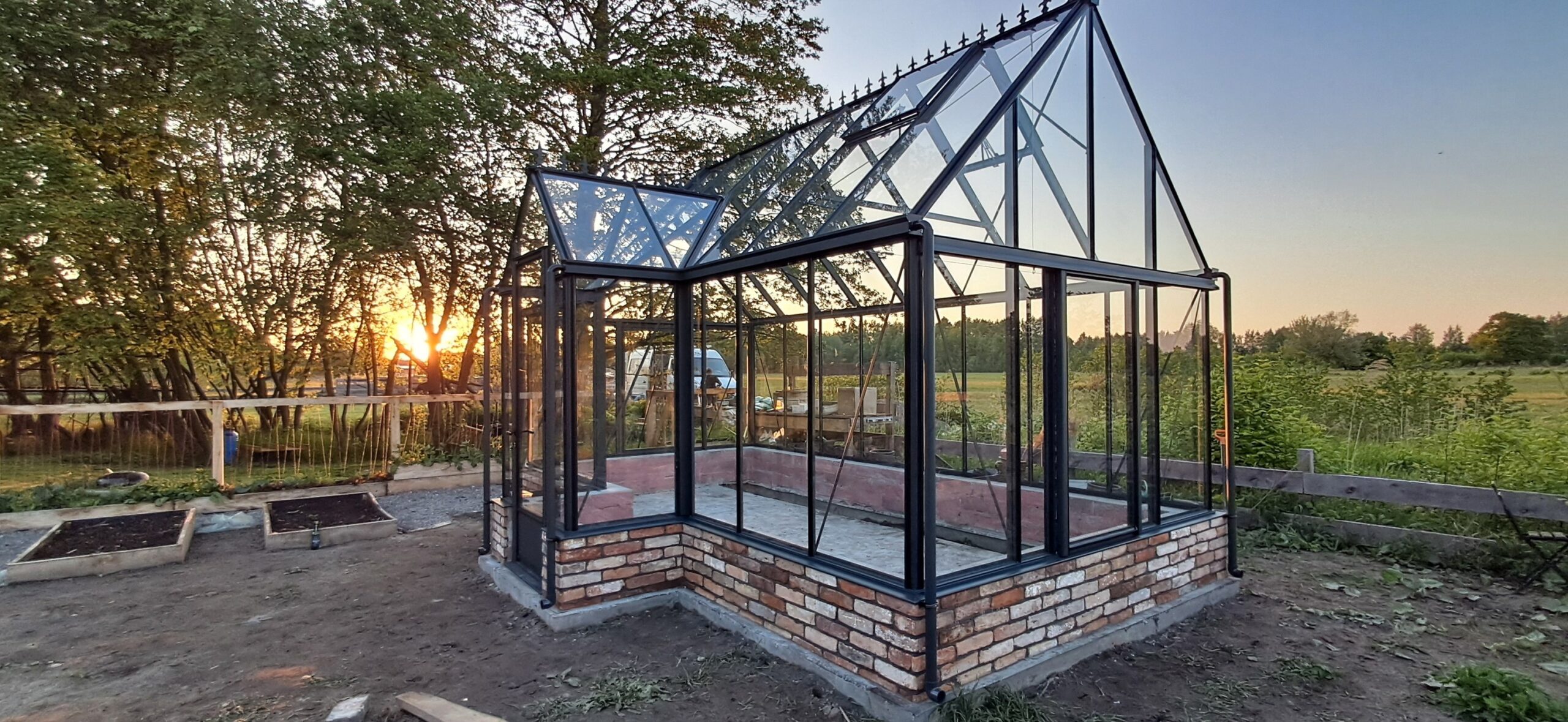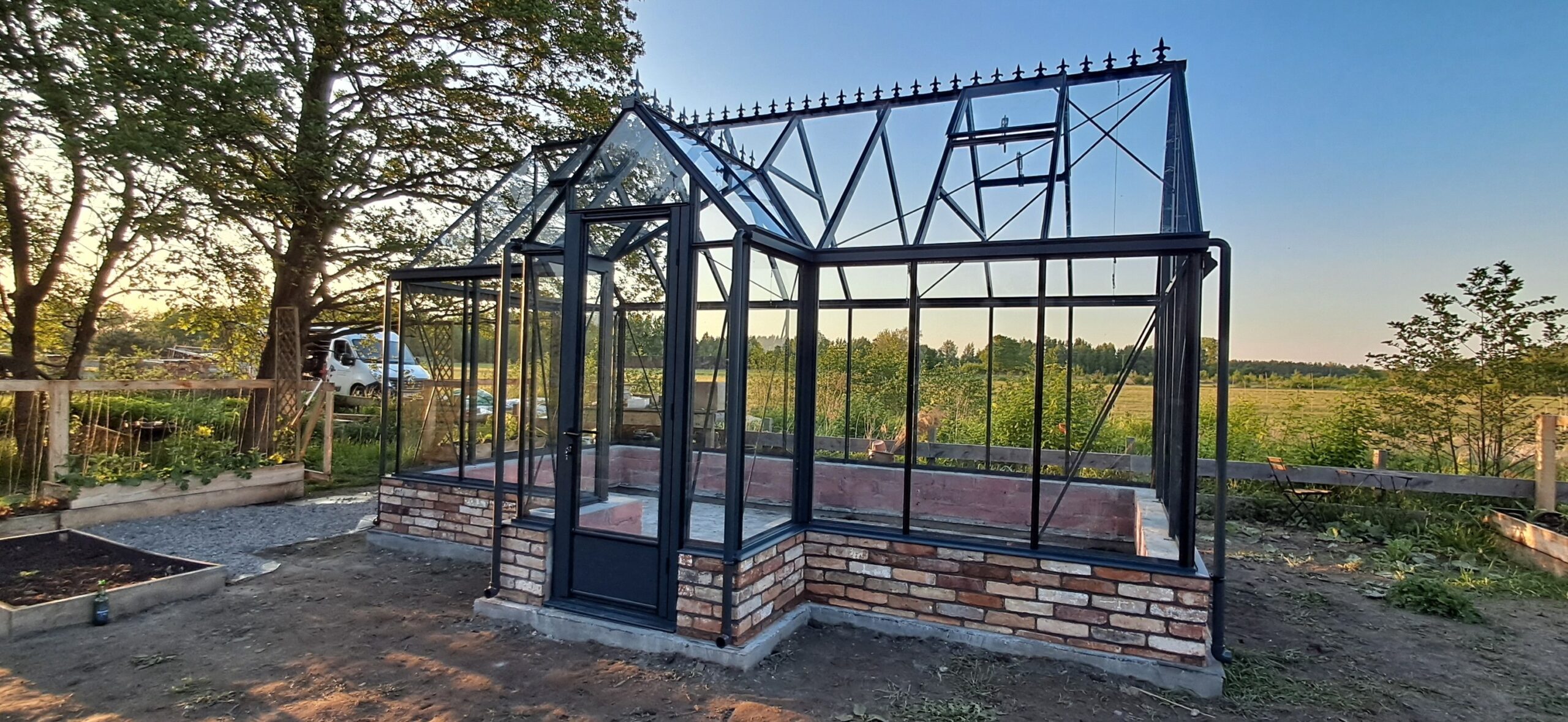 Montaż oranżerii Euro Victorian On Wall o wymiarach 161cm x 604cm na podmurówce o wysokości 43cm. Aluminiowa konstrukcja w kolorze RAL 7016 – antracytowy strukturalny została w całości pokryta szybą hartowaną 4mm. Na dachu zamontowano cztery okna z automatycznym mechanizmem otwierania. Na froncie pojedyncze drzwi na zawiasach o szerokości 73cm. Na lewej i prawej ścianie pojedyncze okno przesuwne o szerokości 84cm. Na kalenicy zdobienie szczytu w wiktoriańskim stylu. Wewnątrz dwie linki do uprawy warzyw wysokopiennych. Wysokość ścian to 218cm, a wysokość kalenicy 368cm/295cm. Miejsce montażu – Hipolitów w województwie mazowieckim.