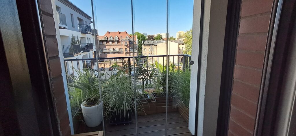 Zabudowa wnęki na balkonie systemem szklanych drzwi przesuwnych. Otwór o wymiarach 171cm x 215cm został zamknięty czterema panelami ze szkła hartowanego o grubości 10mm. Realizacja na piątej kondygnacji. Miejsce montażu – Gliwice w województwie śląskim.