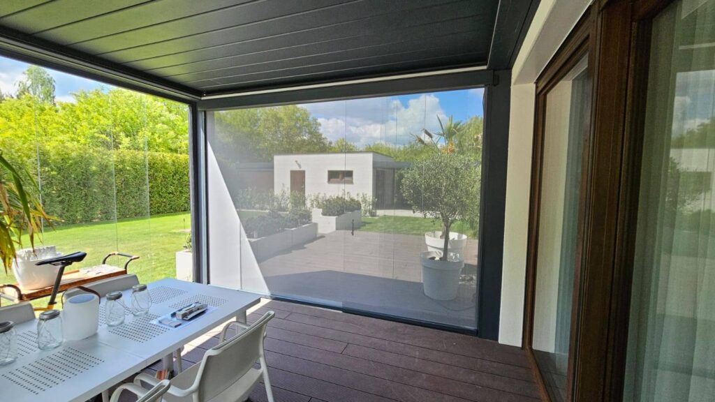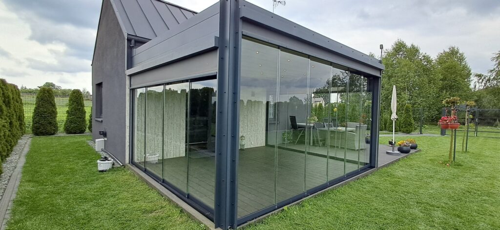 Montaż drzwi przesuwnych bezramowych V764 w istniejącej pergoli. Projekt zakładał demontaż istniejących markiz ściennych, montaż drzwi przesuwnych kurtynowych ze szkła hartowanego o grubości 10mm w otworach na froncie oraz po lewej i prawej stronie pergoli oraz ponowny montaż markiz ściennych po zewnętrznej stronie zabudowy i ponowne ustawienie położeń krańcowych. Miejsce realizacji – Trębaczew w województwie […]
