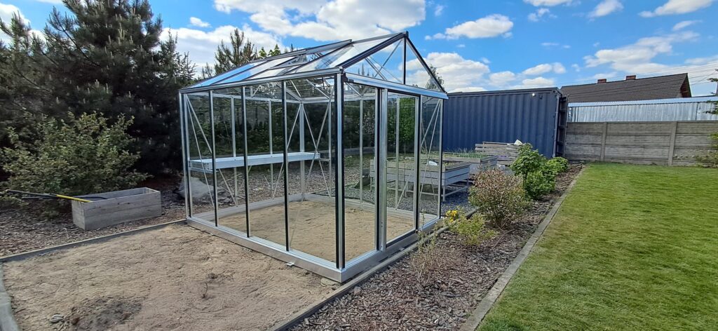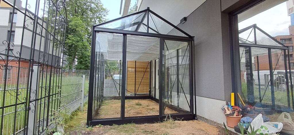 Montaż szklarni ogrodowej Euro Maxi o wymiarach 236cm x 309cm. Aluminiowa konstrukcja w kolorze RAL 9005 – czarny głęboki strukturalny została w całości pokryta szybą hartowaną 4mm. Na dachu zamontowano dwa okna z automatycznym mechanizmem otwierania. Na krótszej ścianie pojedyncze drzwi przesuwne o szerokości 84cm. Wewnątrz cztery rzędy linek do uprawy warzyw wysokopiennych oraz trzyelementowa […]