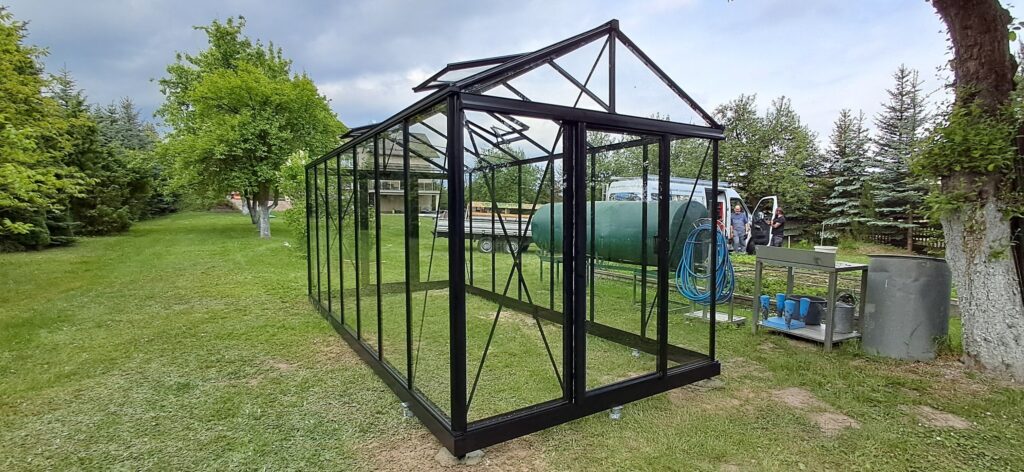 Montaż szklarni ogrodowej Euro Maxi o wymiarach 236cm x 530cm. Aluminiowa konstrukcja w kolorze RAL 9005 – czarny głęboki została w całości pokryta szybą hartowaną 4mm. Na dachu zamontowano trzy okna z automatycznym mechanizmem otwierania. Na obu krótszych ścianach pojedyncze drzwi przesuwne o szerokości 84cm. Wysokość ścian to 201cm, a wysokość kalenicy 256cm. Miejsce montażu […]