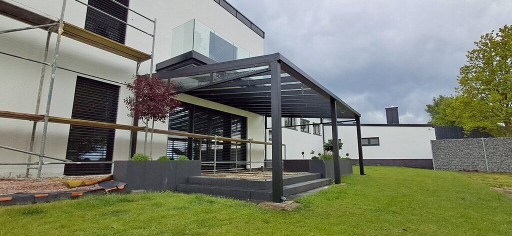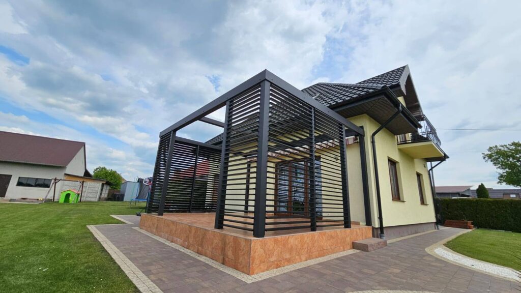 Zabudowa ścian stalowej pergoli systemem ruchomych deseczek. Cztery otwory o wymiarach 140cm x 260cm oraz dwa otwory o wymiarach 100cm x 260cm zostały zabudowane deseczkami aluminiowymi w kolorze RAL 9005 – czarny strukturalny. Miejsce montażu – Solarnia w województwie śląskim.