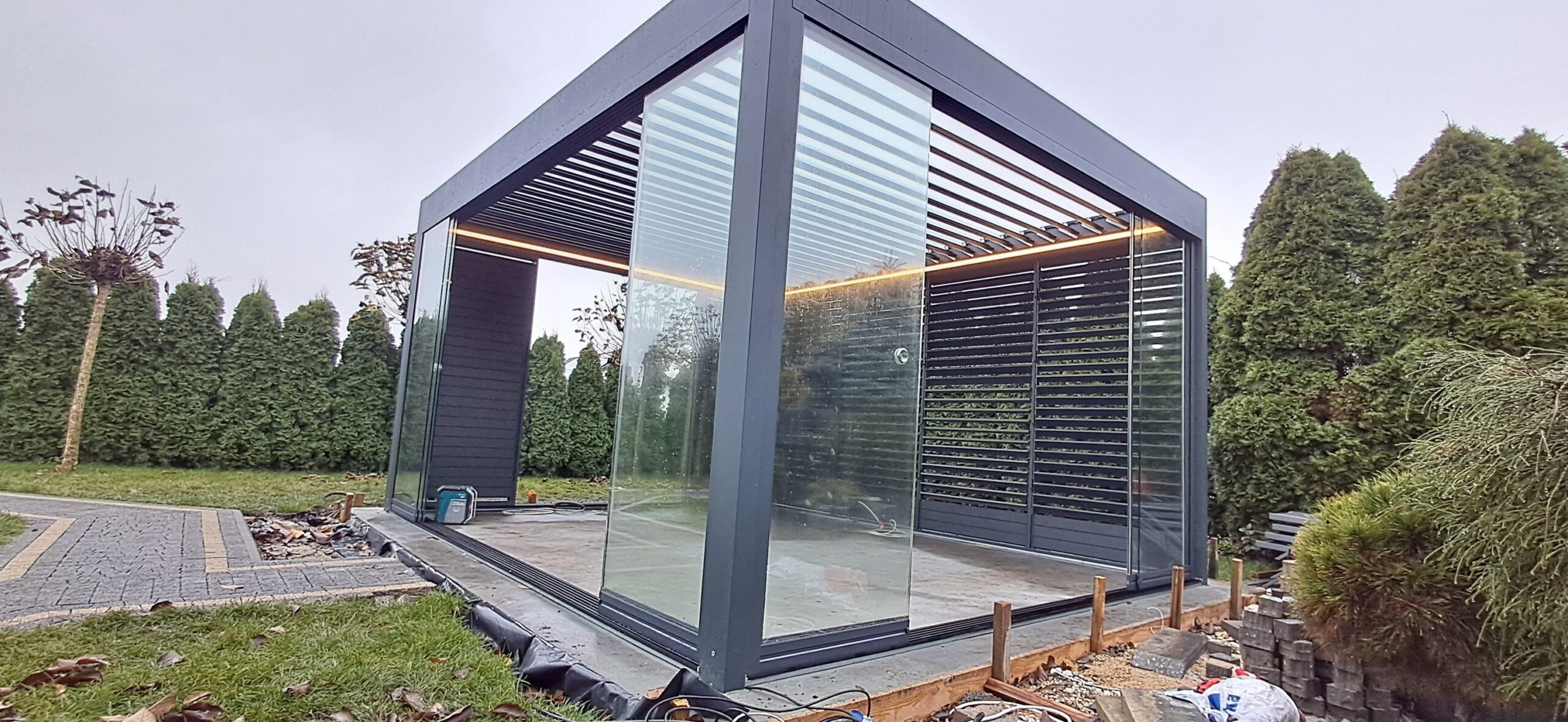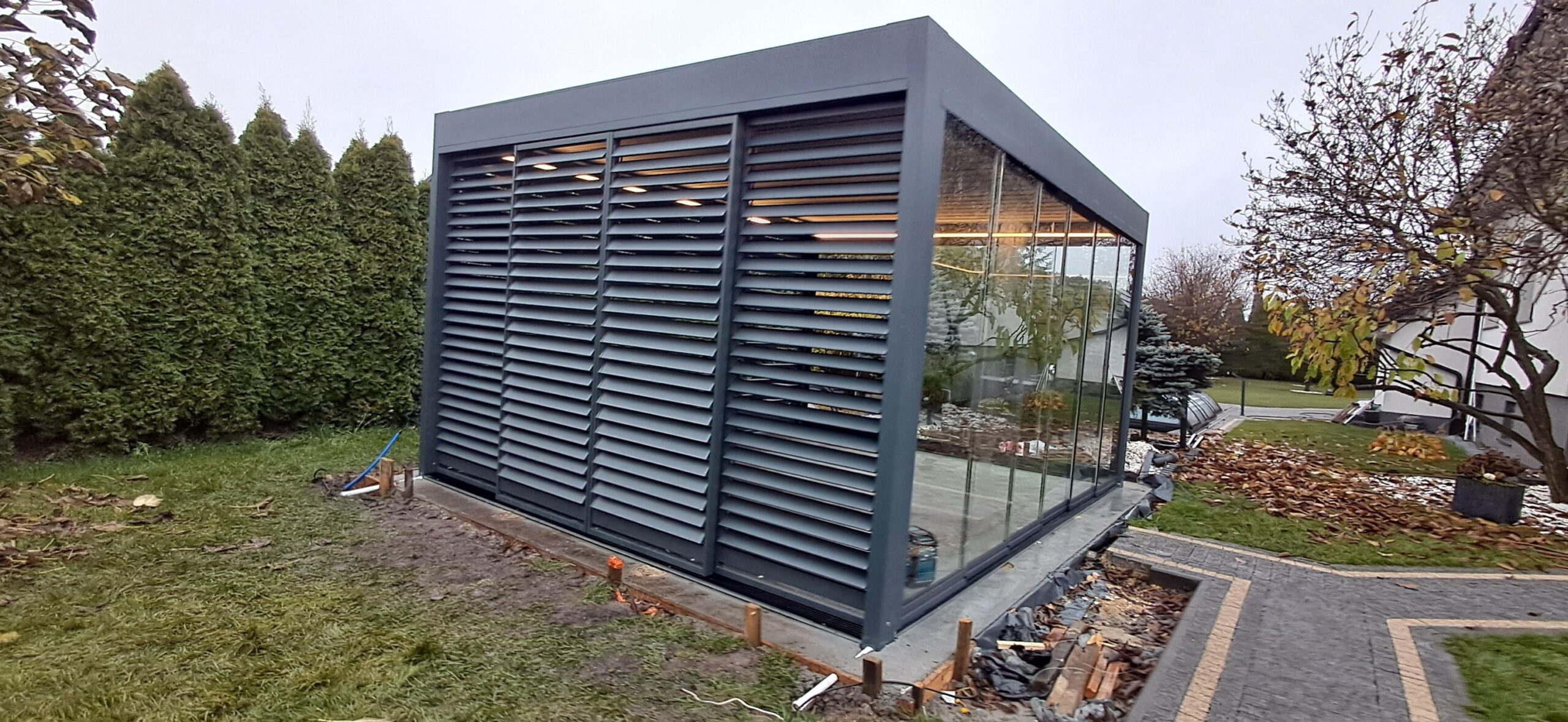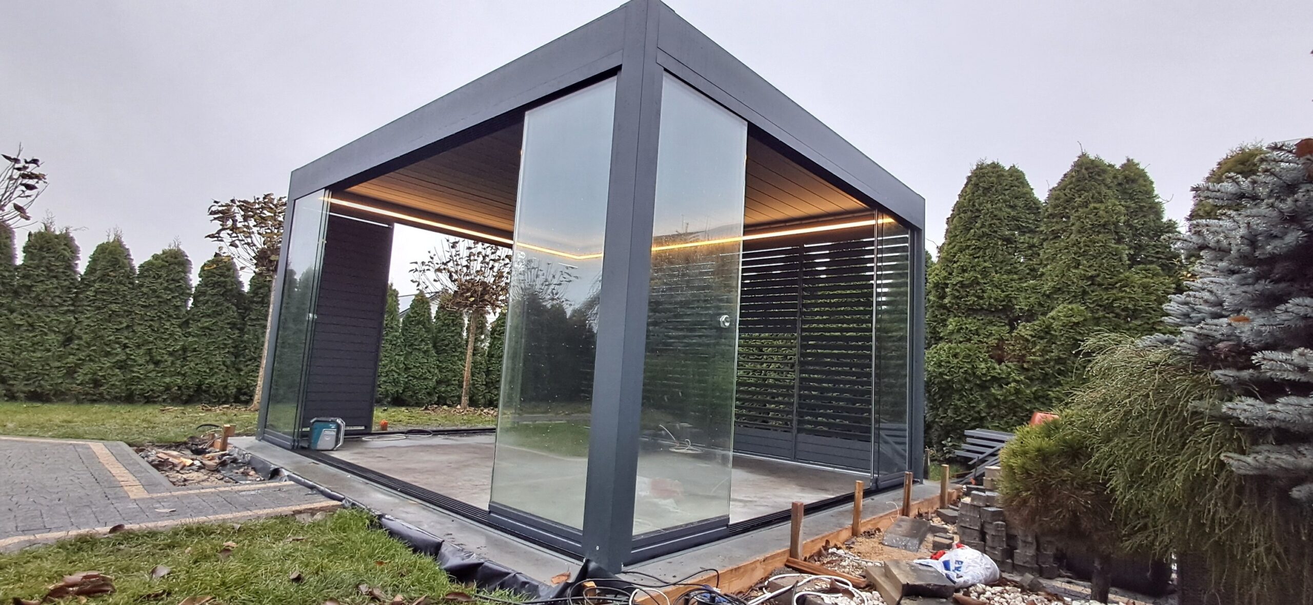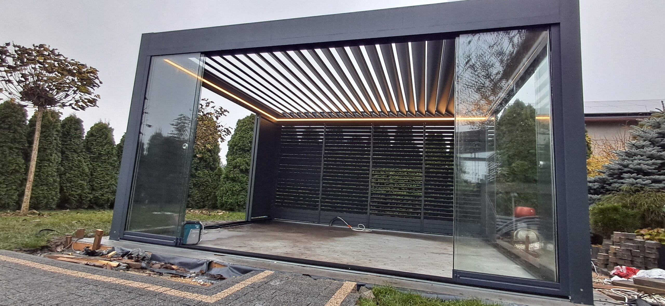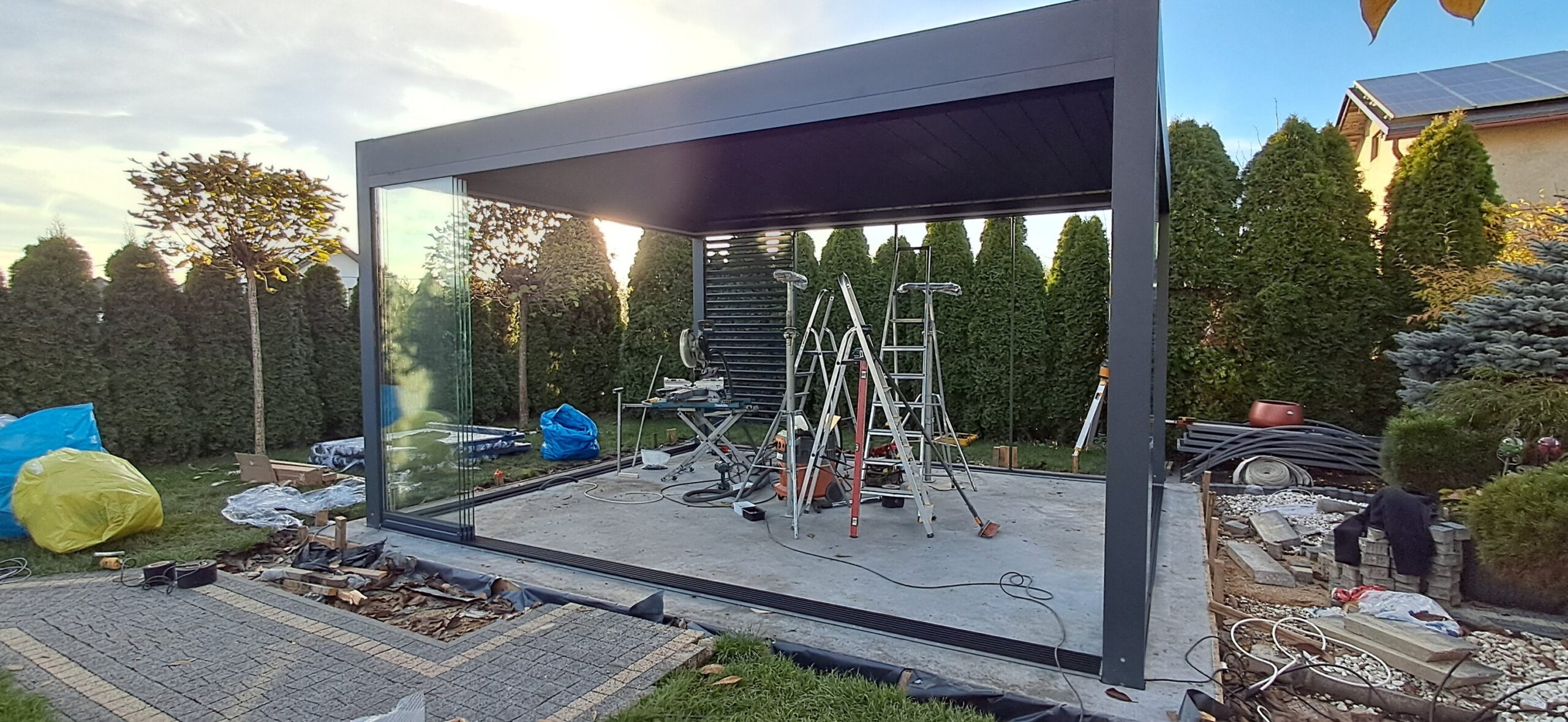 Montaż pergoli lamelowej SB 400 PRO od firmy SELT o wymiarach 400cm x 500cm. Aluminiowa konstrukcja w kolorze RAL 7016- antracytowy strukturalny została na jednej z dłuższych ścian zabudowana systemem szklanych drzwi przesuwnych V768 składającym się z 6 paneli o grubości 10mm otwieranych na dwie strony. Na jednej z krótszych ścian zamontowano pięć paneli szklanych otwieranych na dwie strony. Druga dłuższa ściana została zabudowana systemem ruchomych żaluzji ogrodowych w kolorze RAL 7016 – antracytowy strukturalny, natomiast druga krótsza ściana wypełniona jest systemem przesuwnym składającym się z czterech paneli z ruchomymi żaluzjami ogrodowymi. Pergola podparta czterema słupami o wysokości 250cm. Wewnątrz oświetlenie LED sterowane pilotem Somfy. Miejsce montażu – Psary Śląskie w województwie śląskim.
