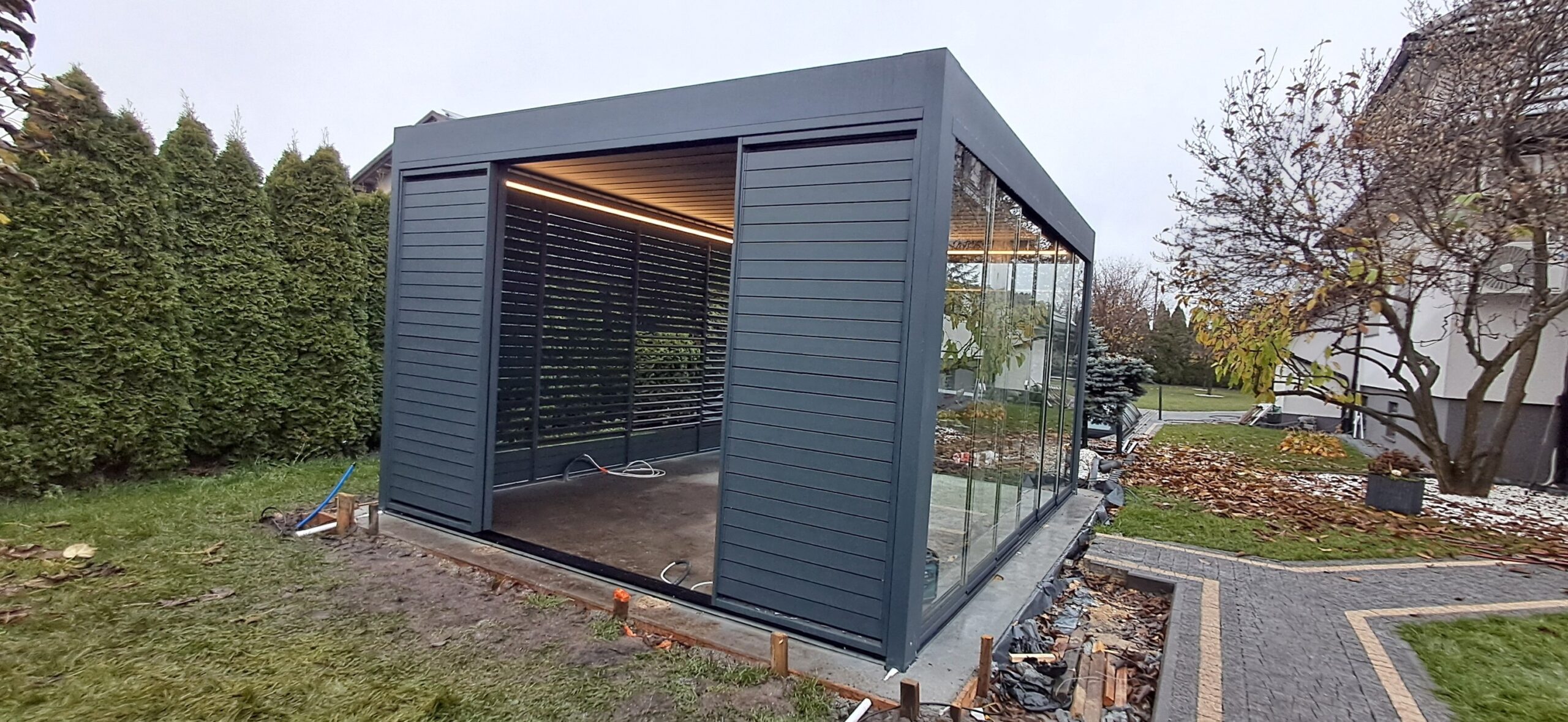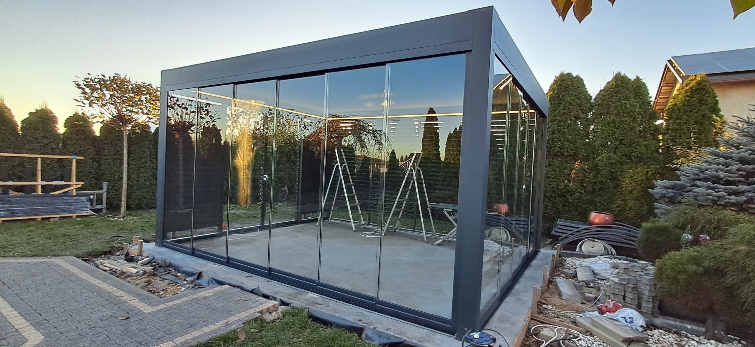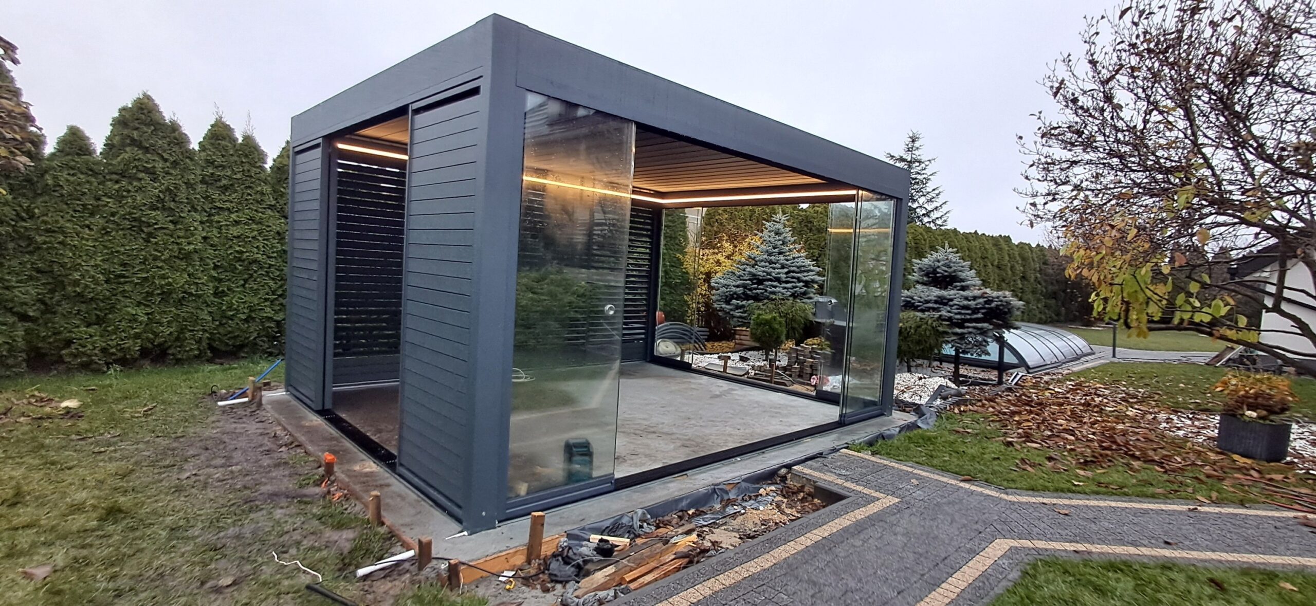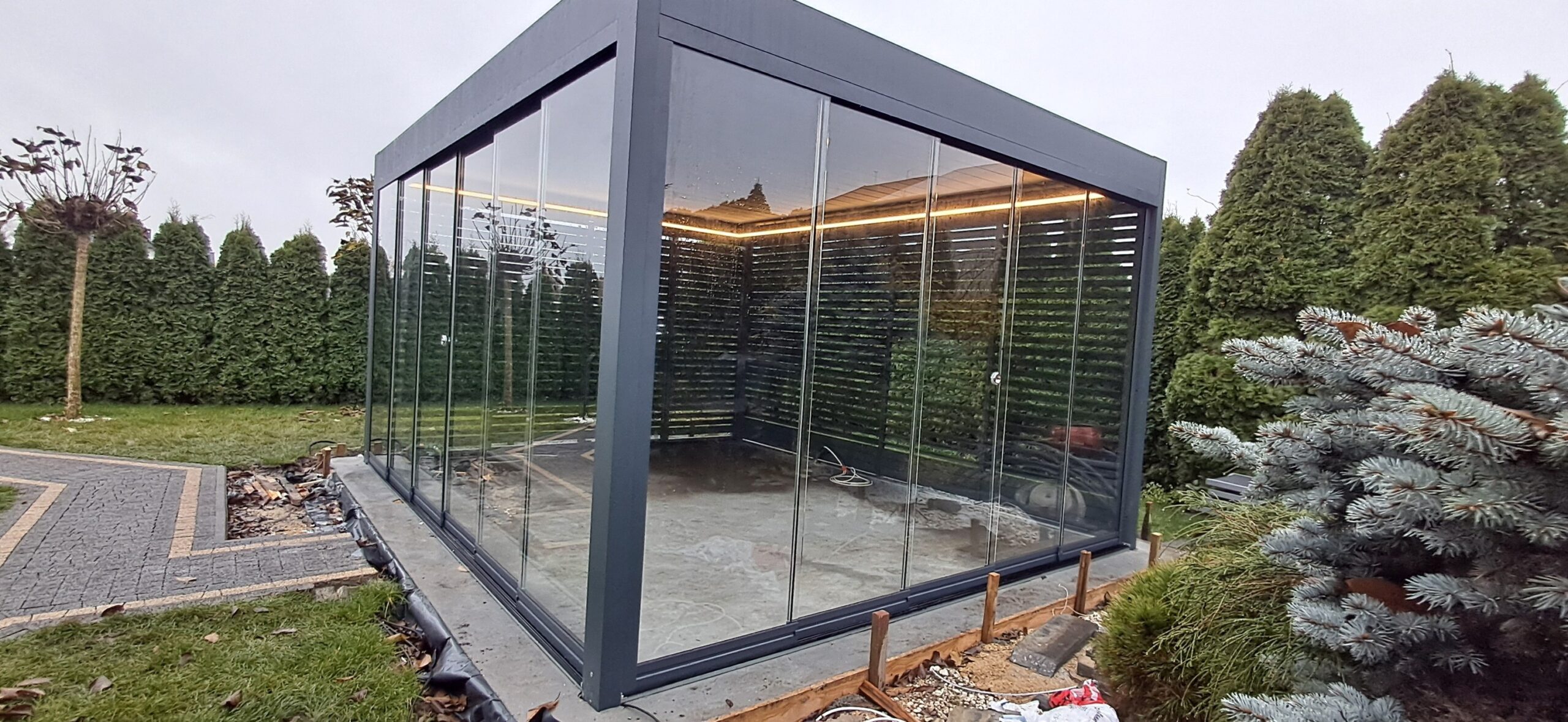 Montaż pergoli lamelowej SB 400 PRO od firmy SELT o wymiarach 400cm x 500cm. Aluminiowa konstrukcja w kolorze RAL 7016- antracytowy strukturalny została na jednej z dłuższych ścian zabudowana systemem szklanych drzwi przesuwnych V768 składającym się z 6 paneli o grubości 10mm otwieranych na dwie strony. Na jednej z krótszych ścian zamontowano pięć paneli szklanych otwieranych na dwie strony. Druga dłuższa ściana została zabudowana systemem ruchomych żaluzji ogrodowych w kolorze RAL 7016 – antracytowy strukturalny, natomiast druga krótsza ściana wypełniona jest systemem przesuwnym składającym się z czterech paneli z ruchomymi żaluzjami ogrodowymi. Pergola podparta czterema słupami o wysokości 250cm. Wewnątrz oświetlenie LED sterowane pilotem Somfy. Miejsce montażu – Psary Śląskie w województwie śląskim.
