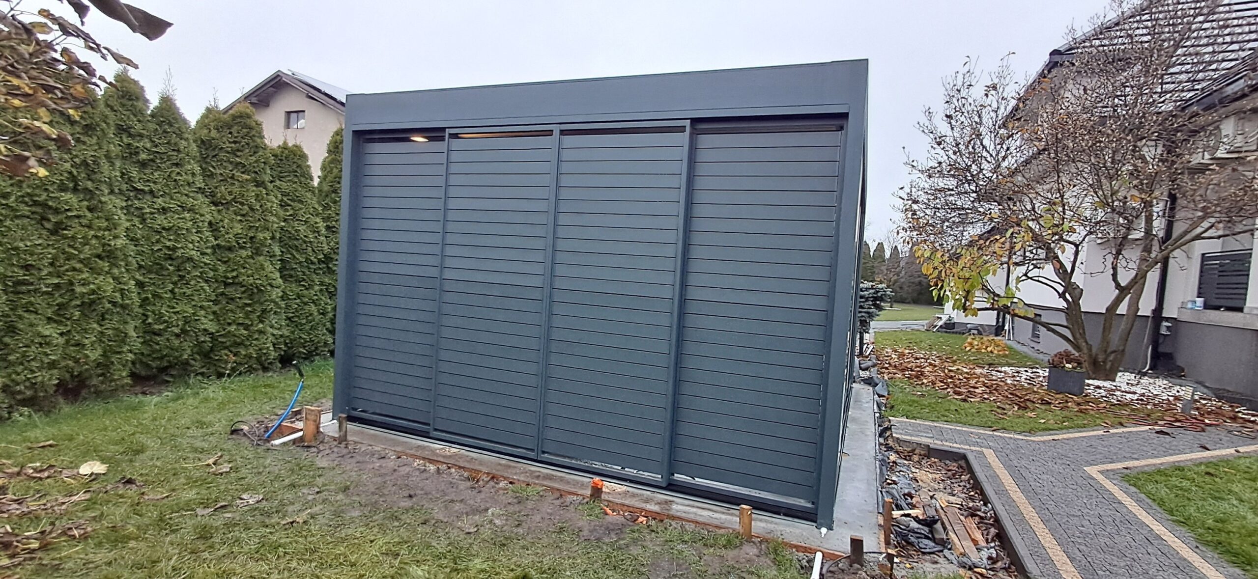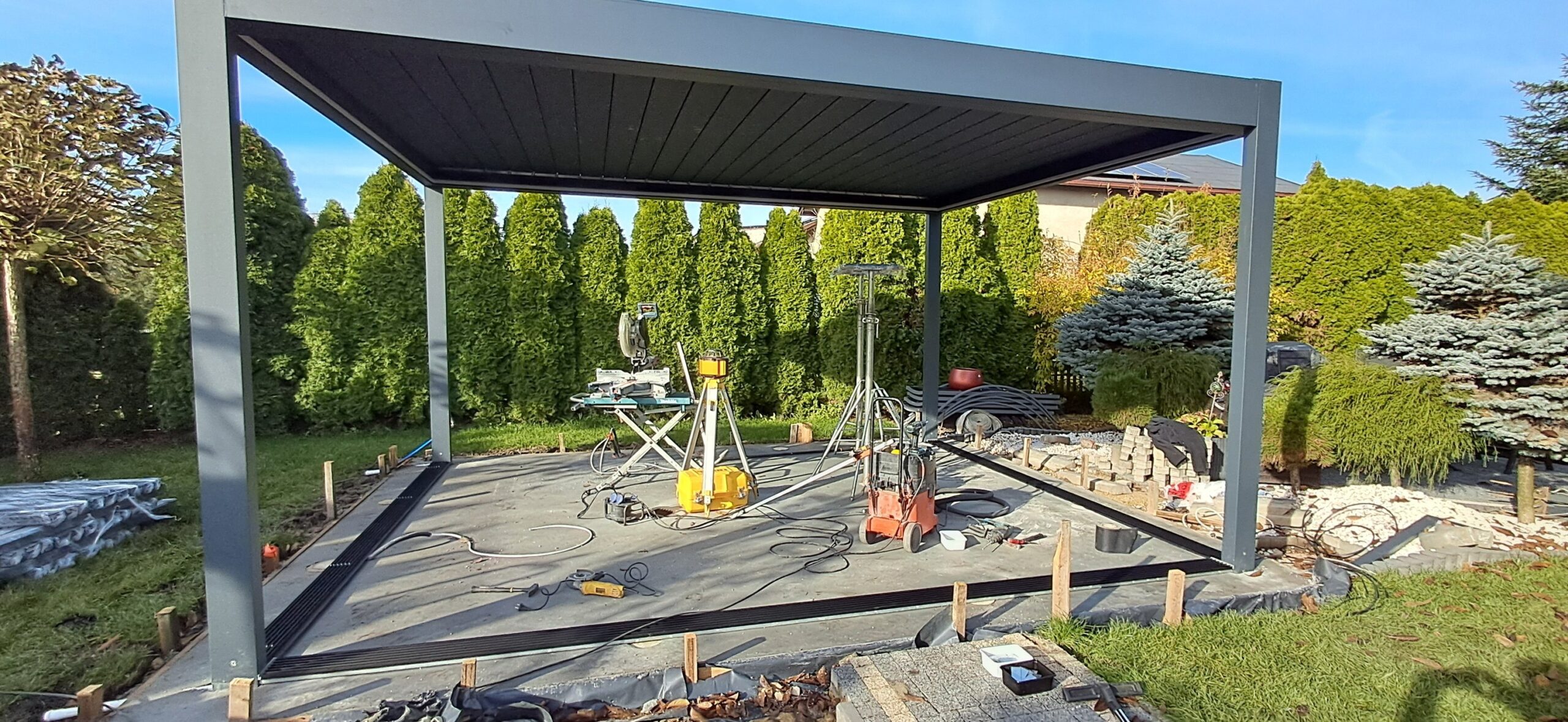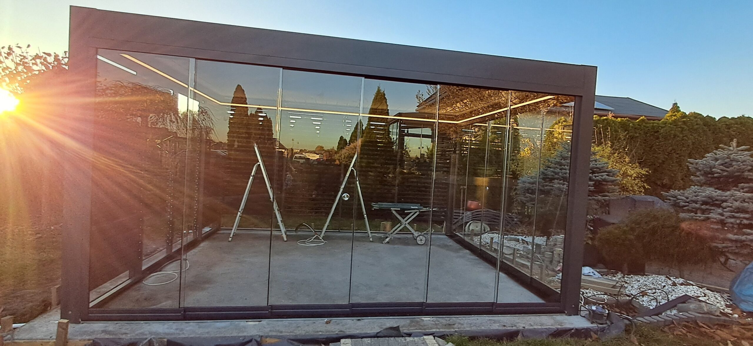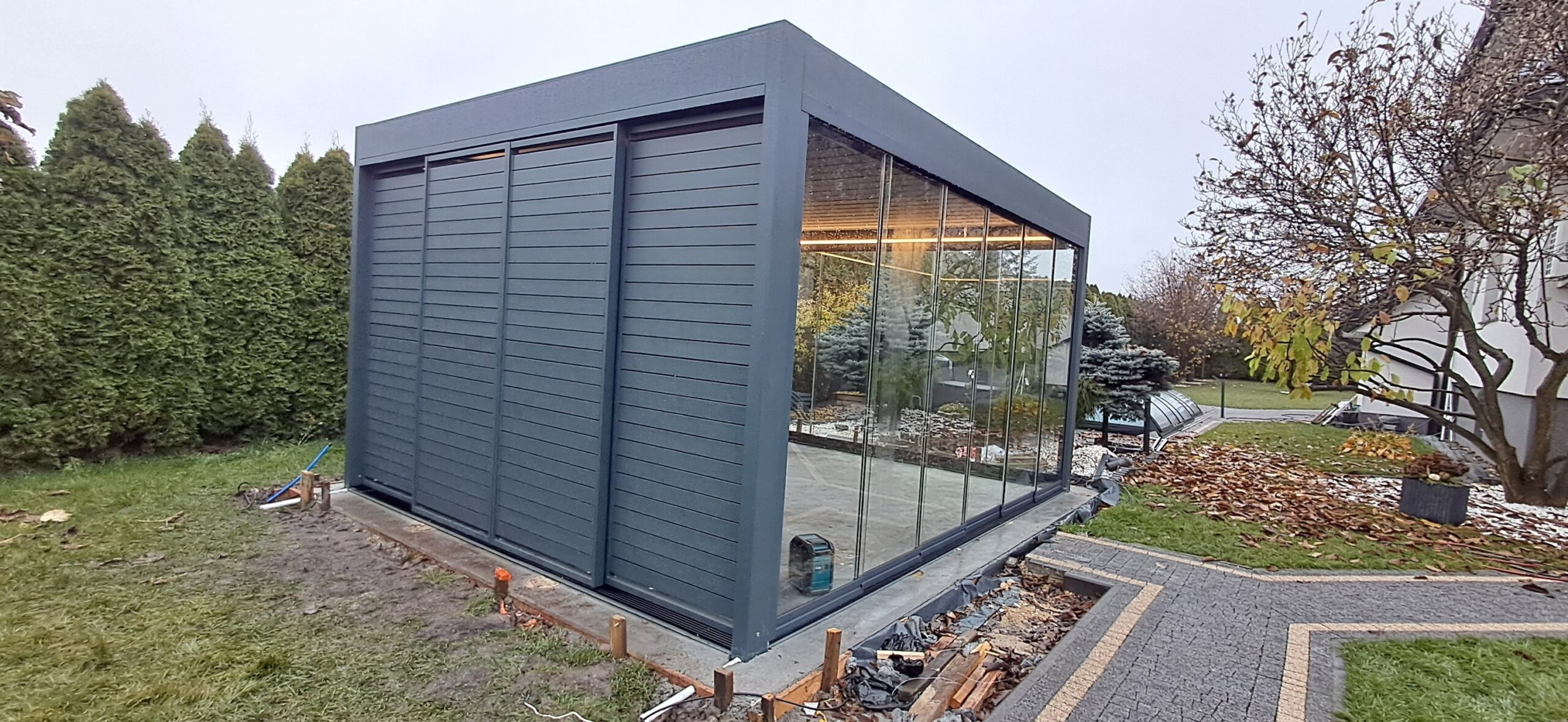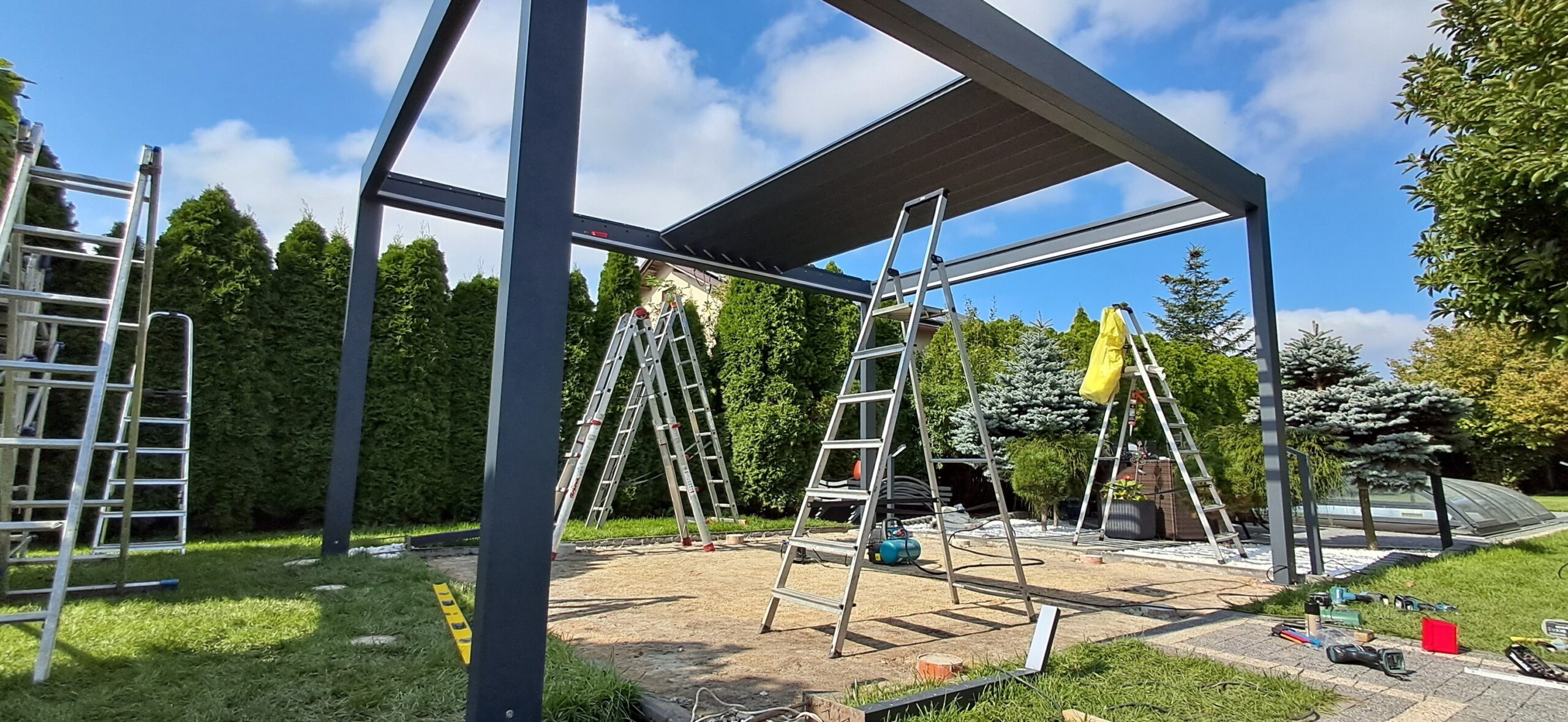Montaż pergoli lamelowej SB 400 PRO od firmy SELT o wymiarach 400cm x 500cm. Aluminiowa konstrukcja w kolorze RAL 7016- antracytowy strukturalny została na jednej z dłuższych ścian zabudowana systemem szklanych drzwi przesuwnych V768 składającym się z 6 paneli o grubości 10mm otwieranych na dwie strony. Na jednej z krótszych ścian zamontowano pięć paneli szklanych otwieranych na dwie strony. Druga dłuższa ściana została zabudowana systemem ruchomych żaluzji ogrodowych w kolorze RAL 7016 – antracytowy strukturalny, natomiast druga krótsza ściana wypełniona jest systemem przesuwnym składającym się z czterech paneli z ruchomymi żaluzjami ogrodowymi. Pergola podparta czterema słupami o wysokości 250cm. Wewnątrz oświetlenie LED sterowane pilotem Somfy. Miejsce montażu – Psary Śląskie w województwie śląskim.