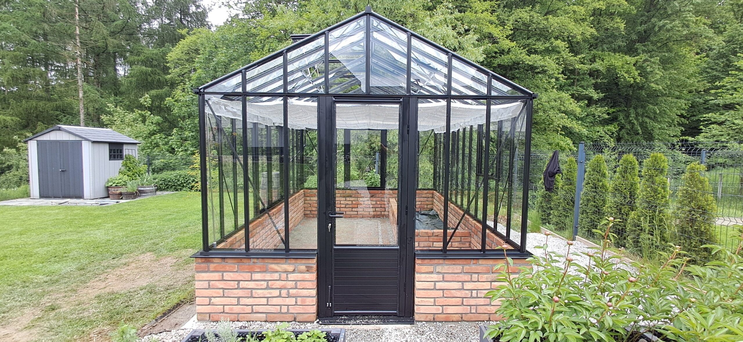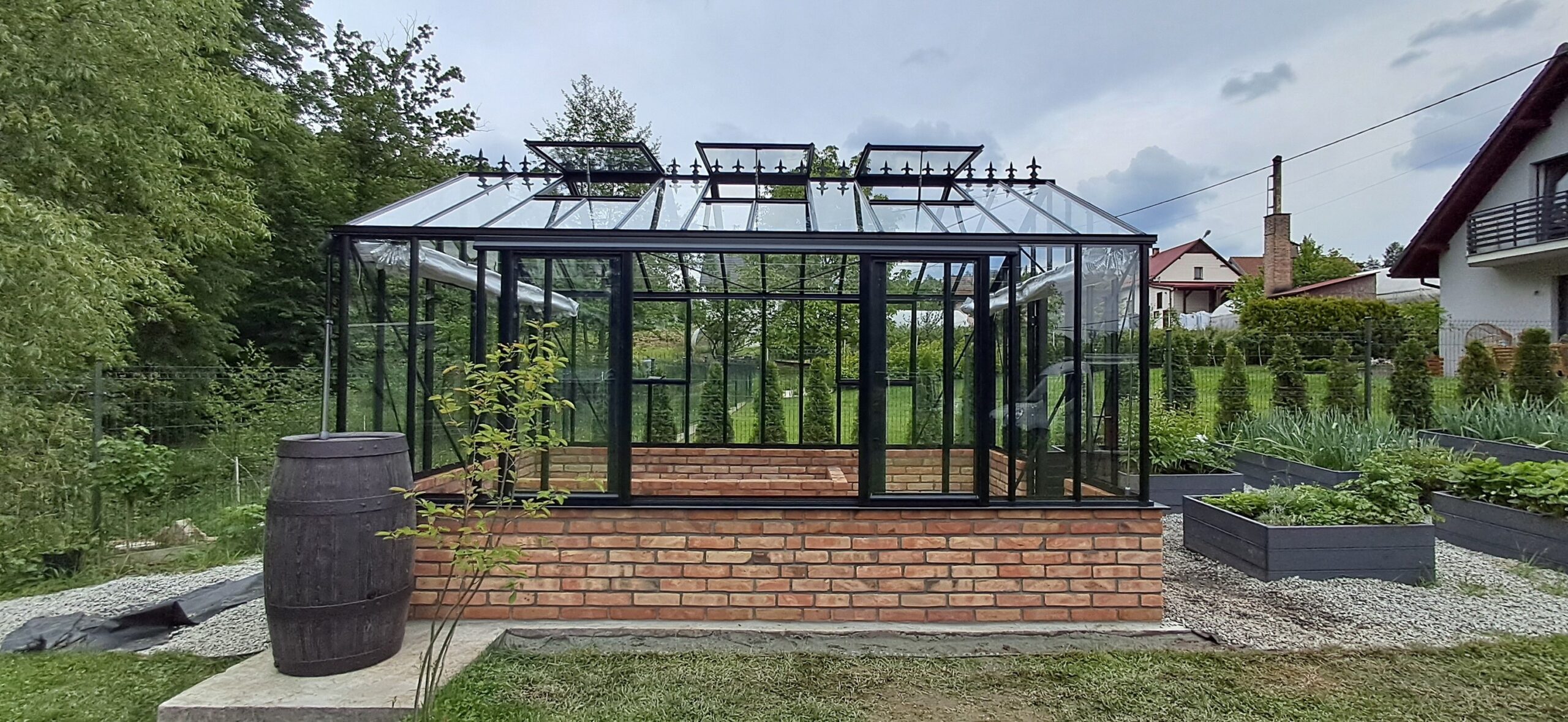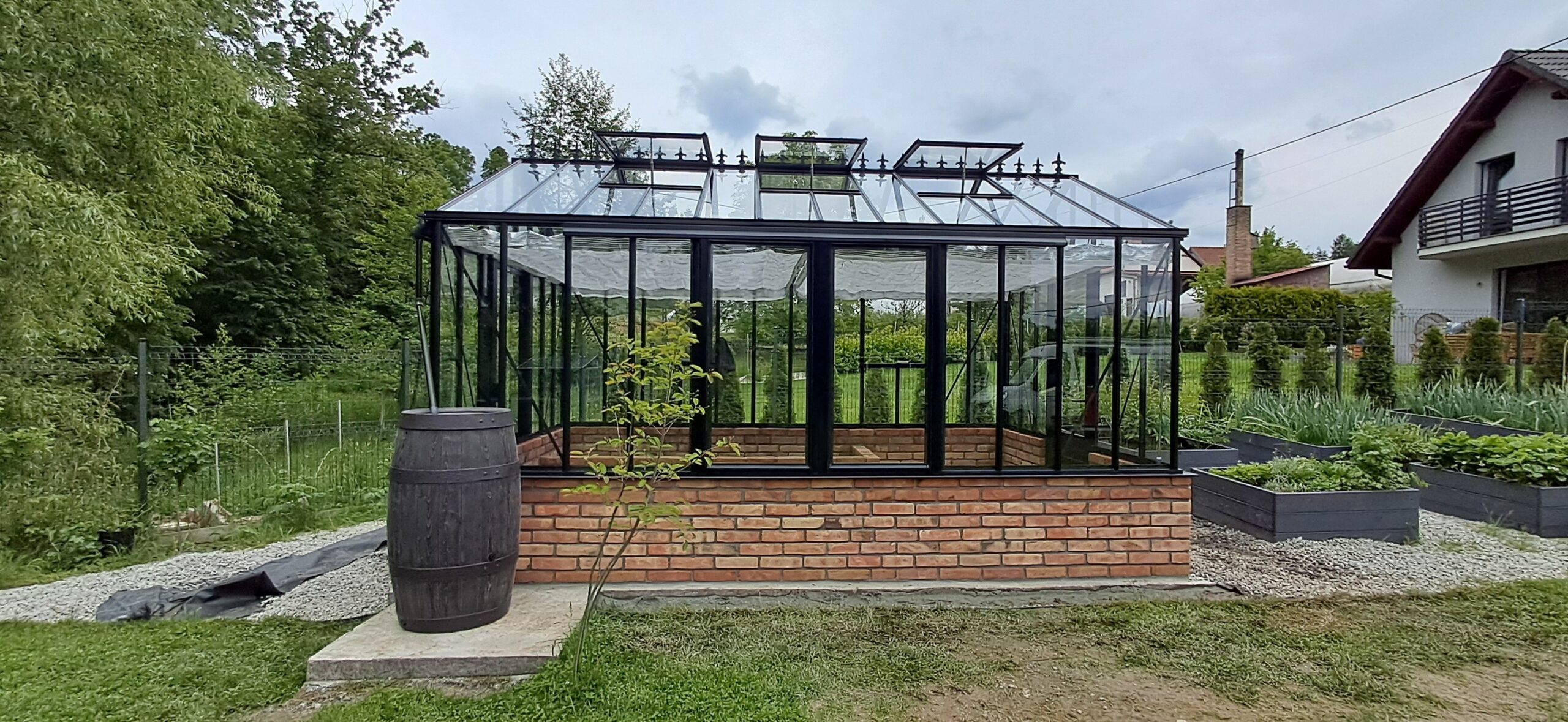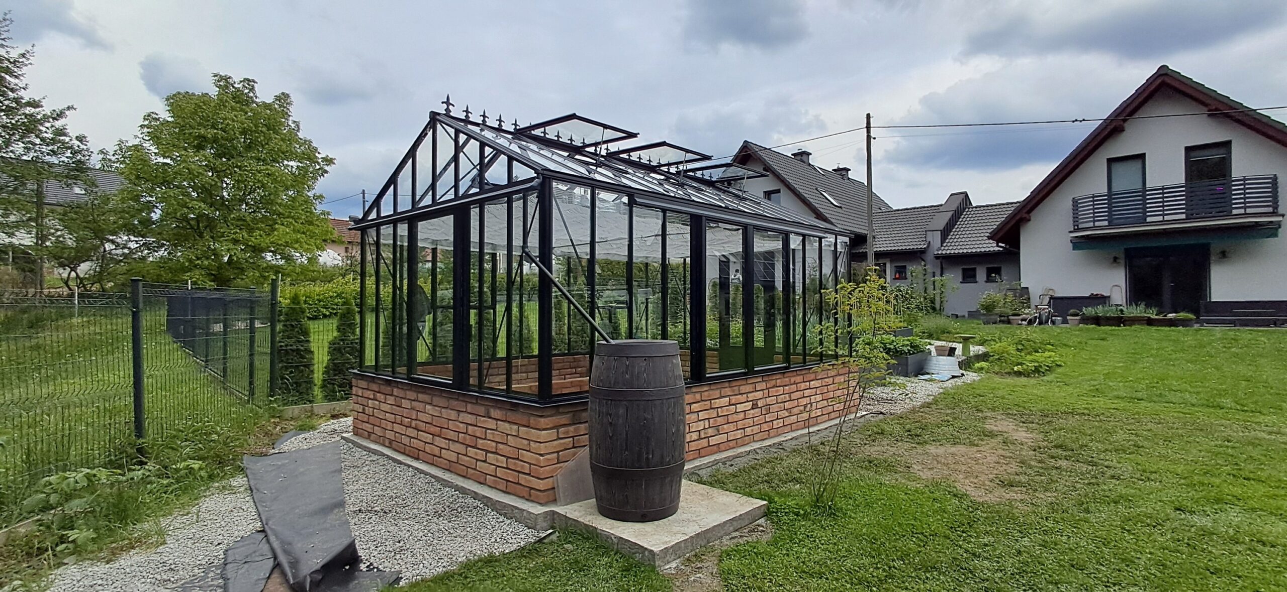 Montaż szklarni ogrodowej Euro Gothic o wymiarach 309cm x 457cm na podmurówce o wysokości 63cm. Aluminiowa konstrukcja w kolorze RAL 9005 – czarny głęboki została w całości pokryta szybą hartowaną 4mm. Na dachu zamontowano sześć okien z czego trzy z automatycznym mechanizmem otwierania i trzy z mechanizmem otwierania Spindel. Na krótszej ścianie pojedyncze drzwi na zawiasach o szerokości 73cm z zamkiem. Na przeciwnej ścianie pojedyncze okno ścienne przesuwne o szerokości 84cm. Na dłuższej ścianie podwójne okno ścienne przesuwne o szerokości 2x70cm oraz dwa okna ścienne uchylne z systemem AXA-FLEX. Wewnątrz kurtyna cieniującą. Woda deszczowa odprowadzana jest do zbiornika na deszczówkę za pomocą systemu połączonych rur spustowych. Wysokość ścian to 212cm, a wysokość kalenicy 284cm. Miejsce montażu – Pisarzowice w województwie śląskim.