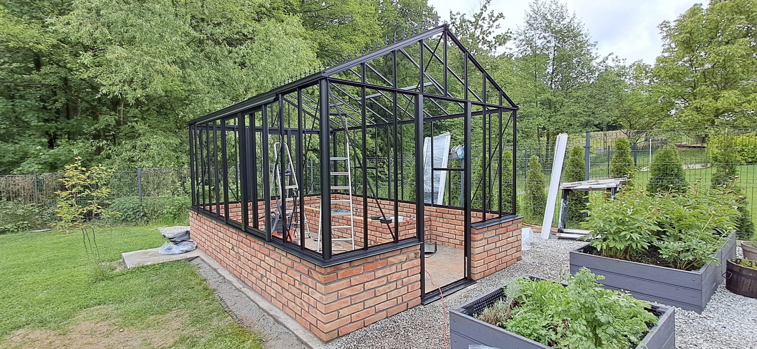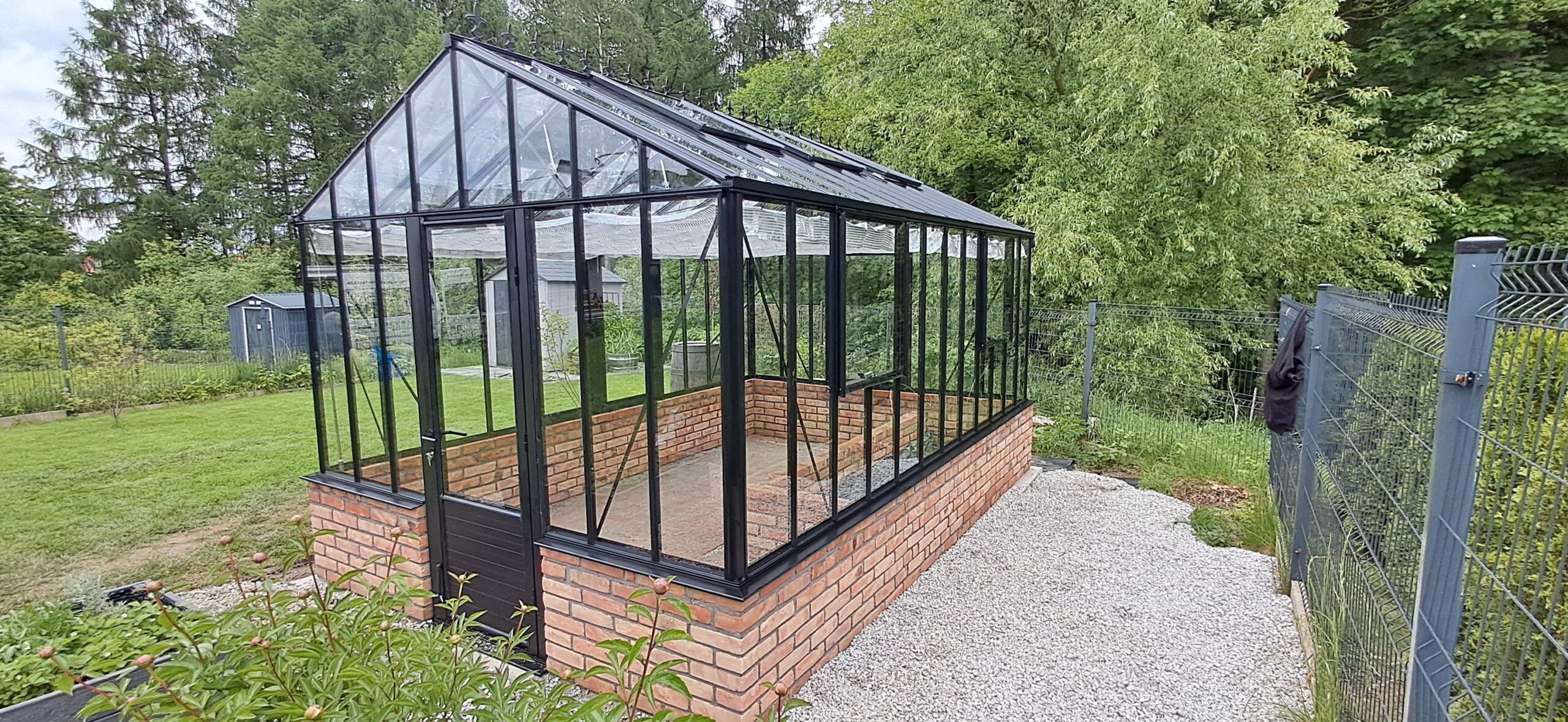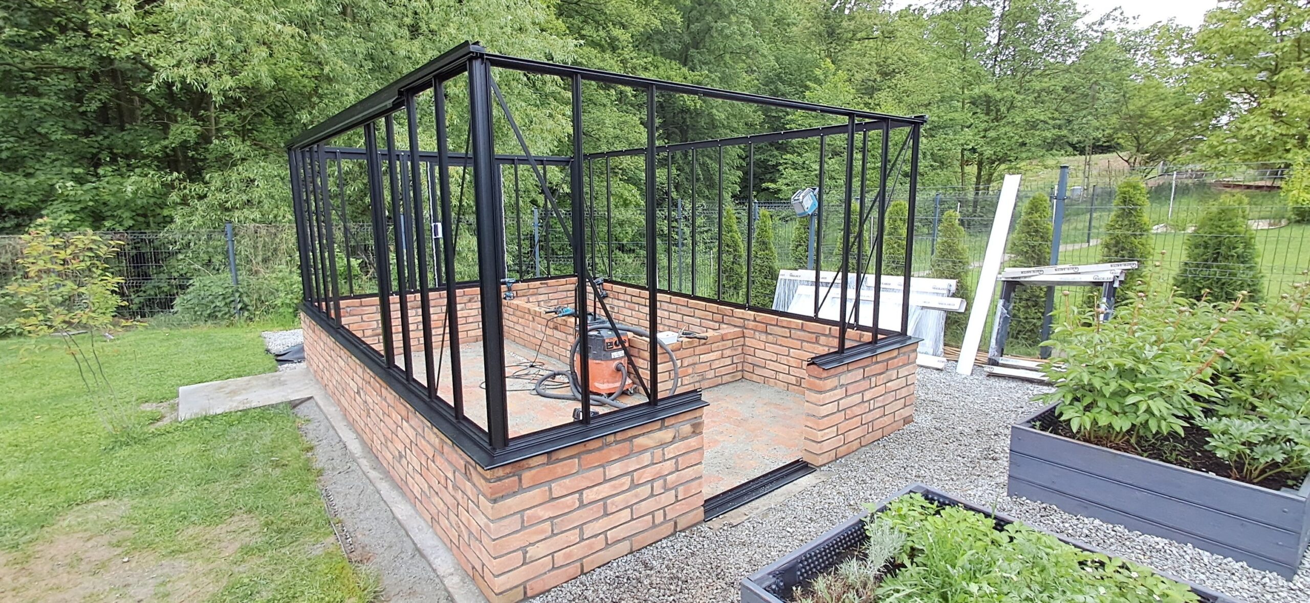 Montaż szklarni ogrodowej Euro Gothic o wymiarach 309cm x 457cm na podmurówce o wysokości 63cm. Aluminiowa konstrukcja w kolorze RAL 9005 – czarny głęboki została w całości pokryta szybą hartowaną 4mm. Na dachu zamontowano sześć okien z czego trzy z automatycznym mechanizmem otwierania i trzy z mechanizmem otwierania Spindel. Na krótszej ścianie pojedyncze drzwi na zawiasach o szerokości 73cm z zamkiem. Na przeciwnej ścianie pojedyncze okno ścienne przesuwne o szerokości 84cm. Na dłuższej ścianie podwójne okno ścienne przesuwne o szerokości 2x70cm oraz dwa okna ścienne uchylne z systemem AXA-FLEX. Wewnątrz kurtyna cieniującą. Woda deszczowa odprowadzana jest do zbiornika na deszczówkę za pomocą systemu połączonych rur spustowych. Wysokość ścian to 212cm, a wysokość kalenicy 284cm. Miejsce montażu – Pisarzowice w województwie śląskim.