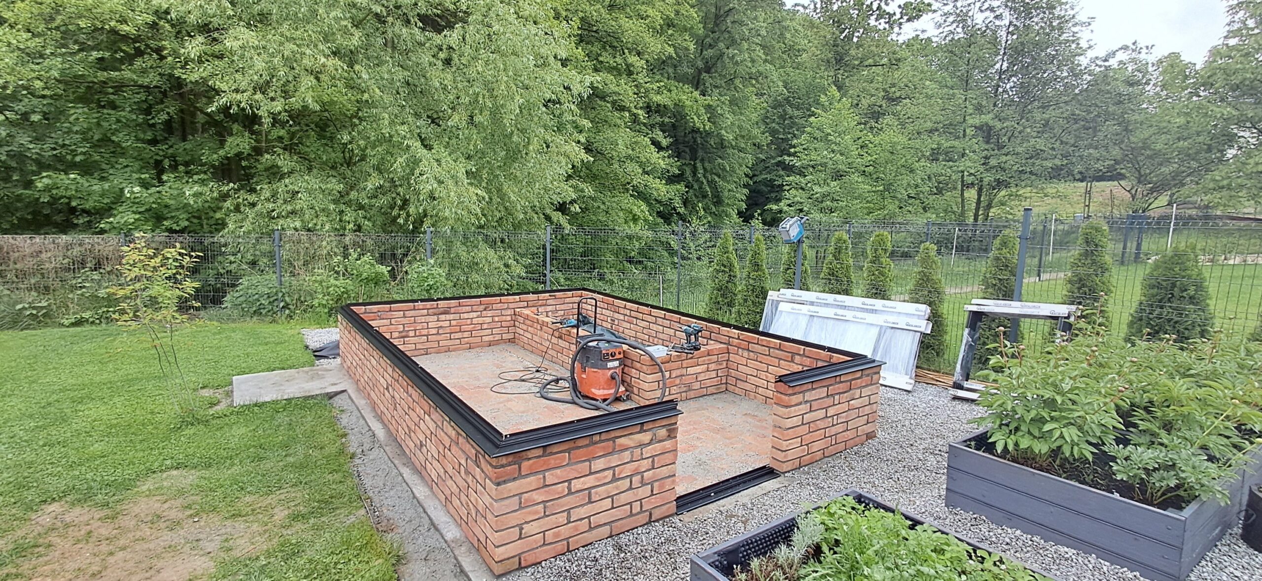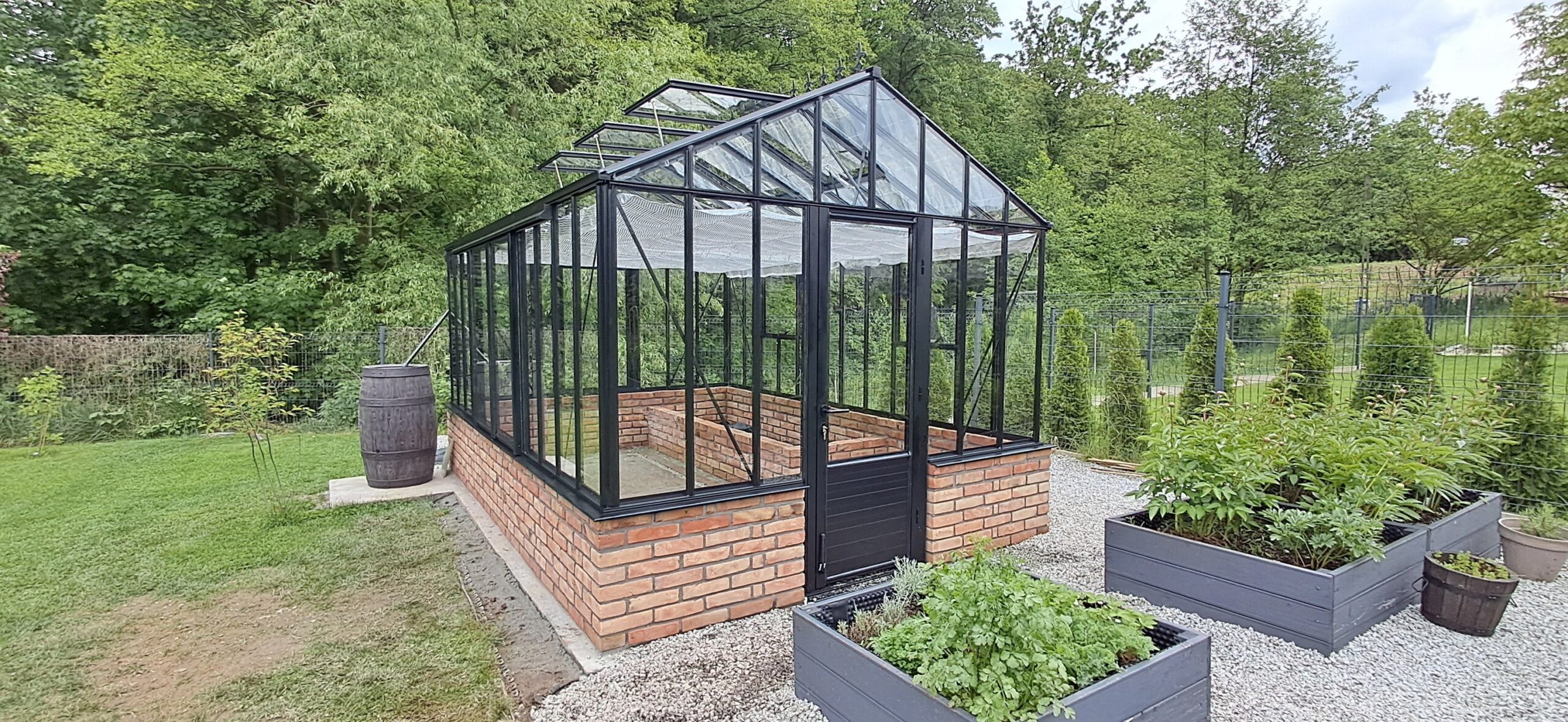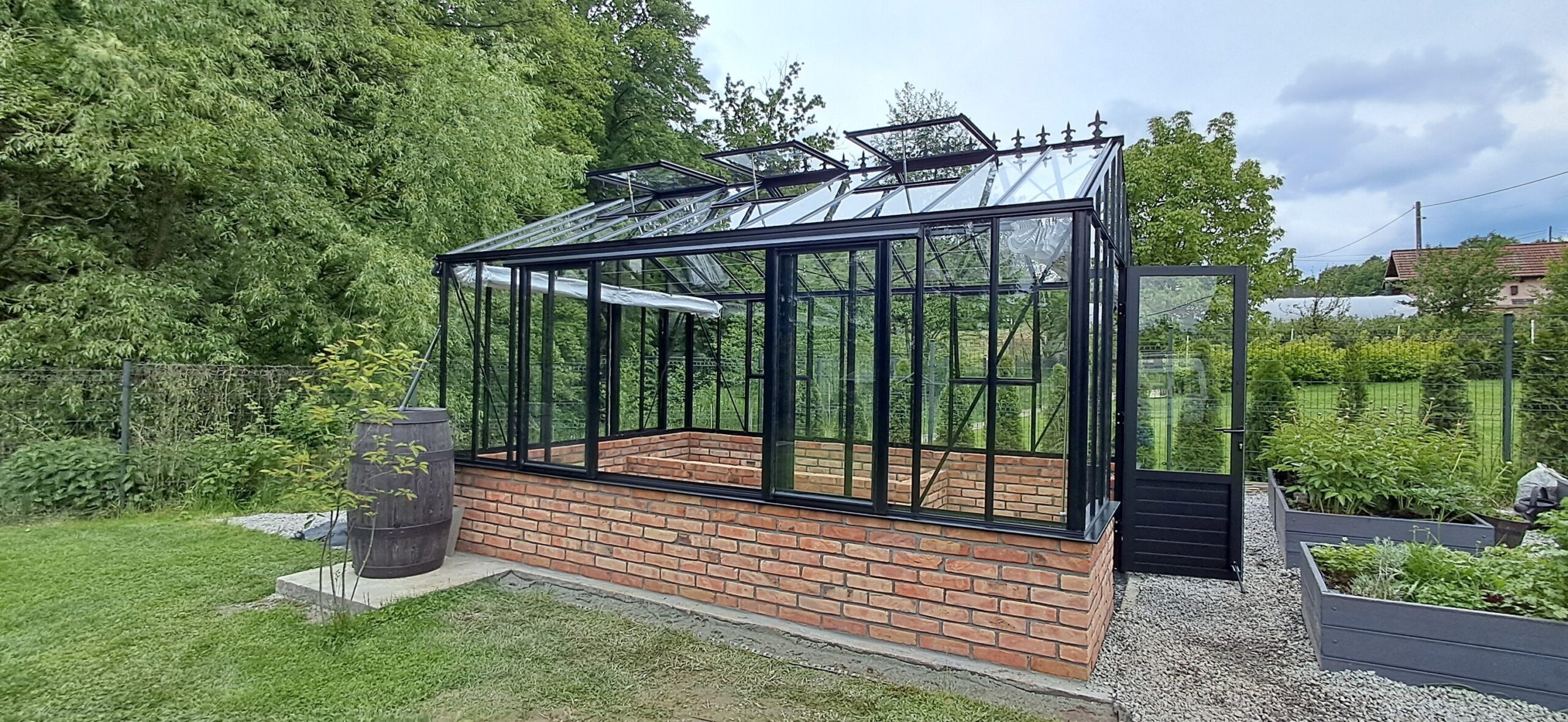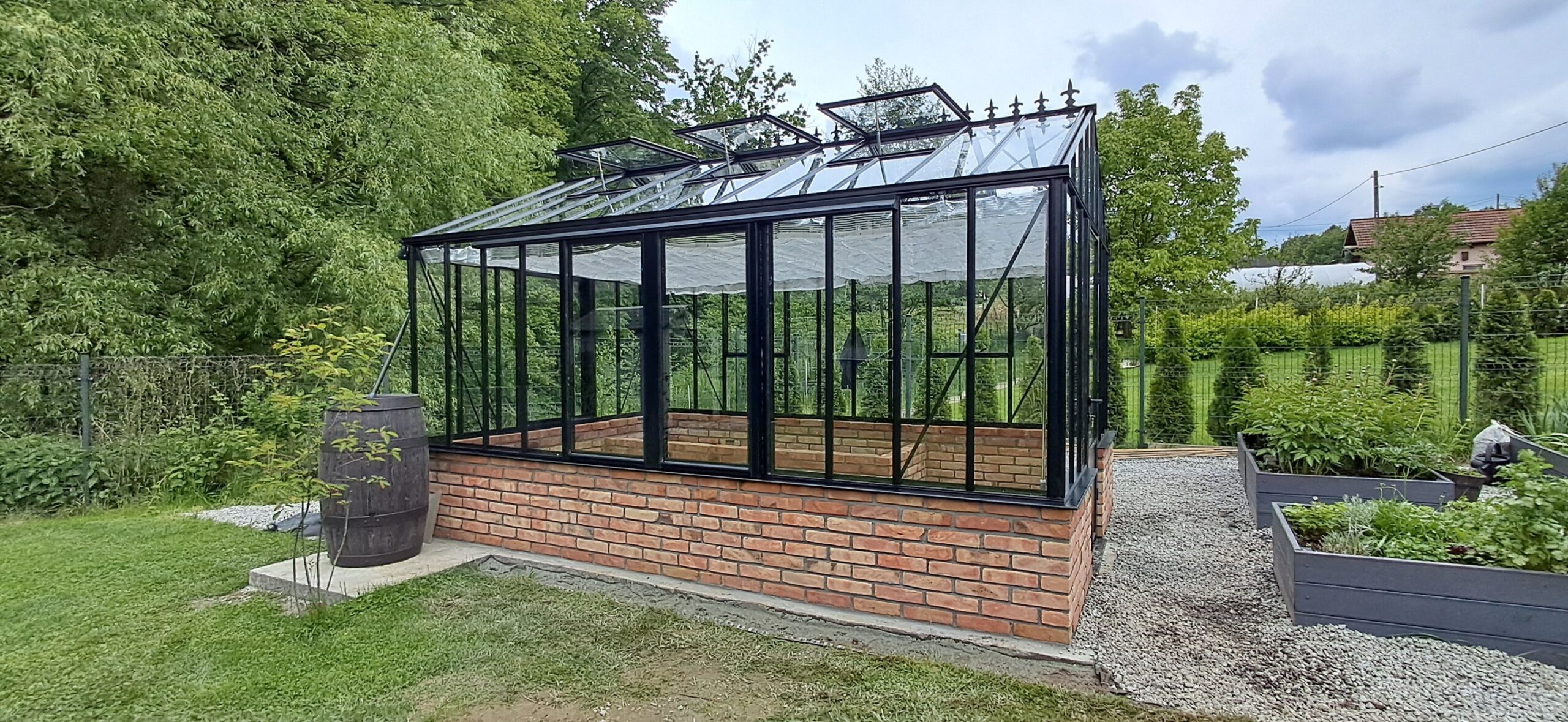 Montaż szklarni ogrodowej Euro Gothic o wymiarach 309cm x 457cm na podmurówce o wysokości 63cm. Aluminiowa konstrukcja w kolorze RAL 9005 – czarny głęboki została w całości pokryta szybą hartowaną 4mm. Na dachu zamontowano sześć okien z czego trzy z automatycznym mechanizmem otwierania i trzy z mechanizmem otwierania Spindel. Na krótszej ścianie pojedyncze drzwi na zawiasach o szerokości 73cm z zamkiem. Na przeciwnej ścianie pojedyncze okno ścienne przesuwne o szerokości 84cm. Na dłuższej ścianie podwójne okno ścienne przesuwne o szerokości 2x70cm oraz dwa okna ścienne uchylne z systemem AXA-FLEX. Wewnątrz kurtyna cieniującą. Woda deszczowa odprowadzana jest do zbiornika na deszczówkę za pomocą systemu połączonych rur spustowych. Wysokość ścian to 212cm, a wysokość kalenicy 284cm. Miejsce montażu – Pisarzowice w województwie śląskim.