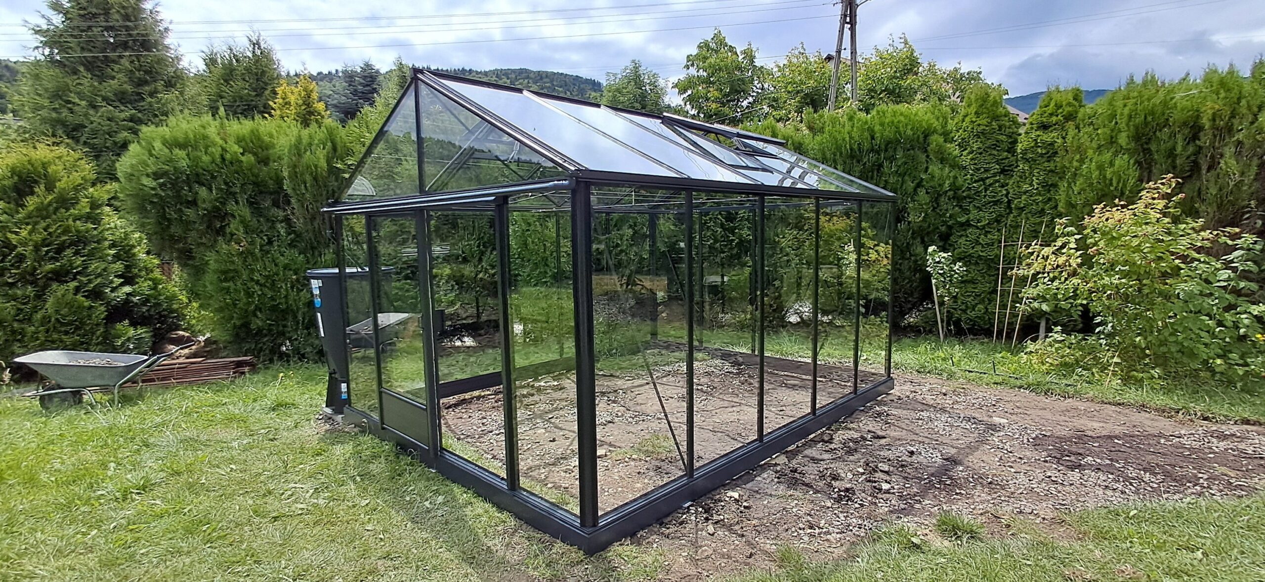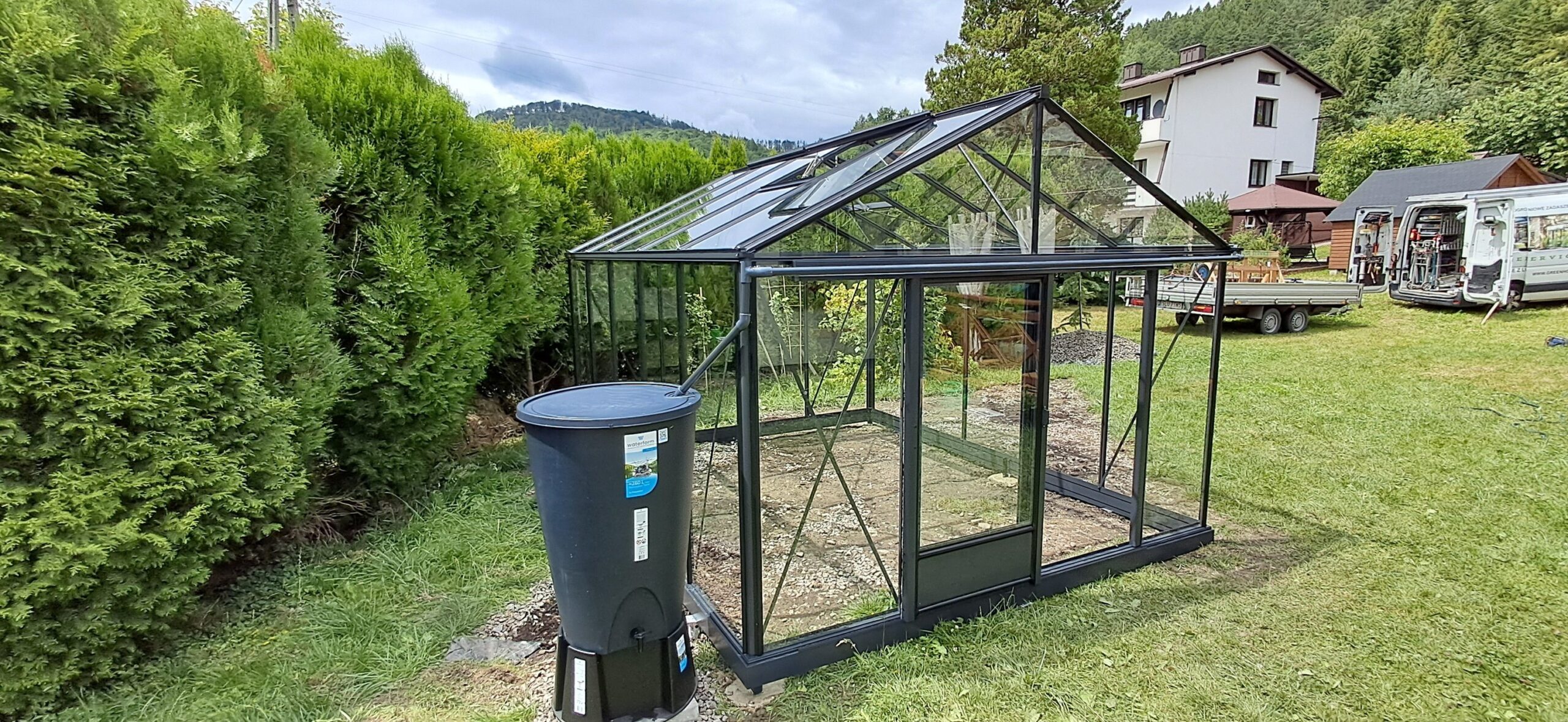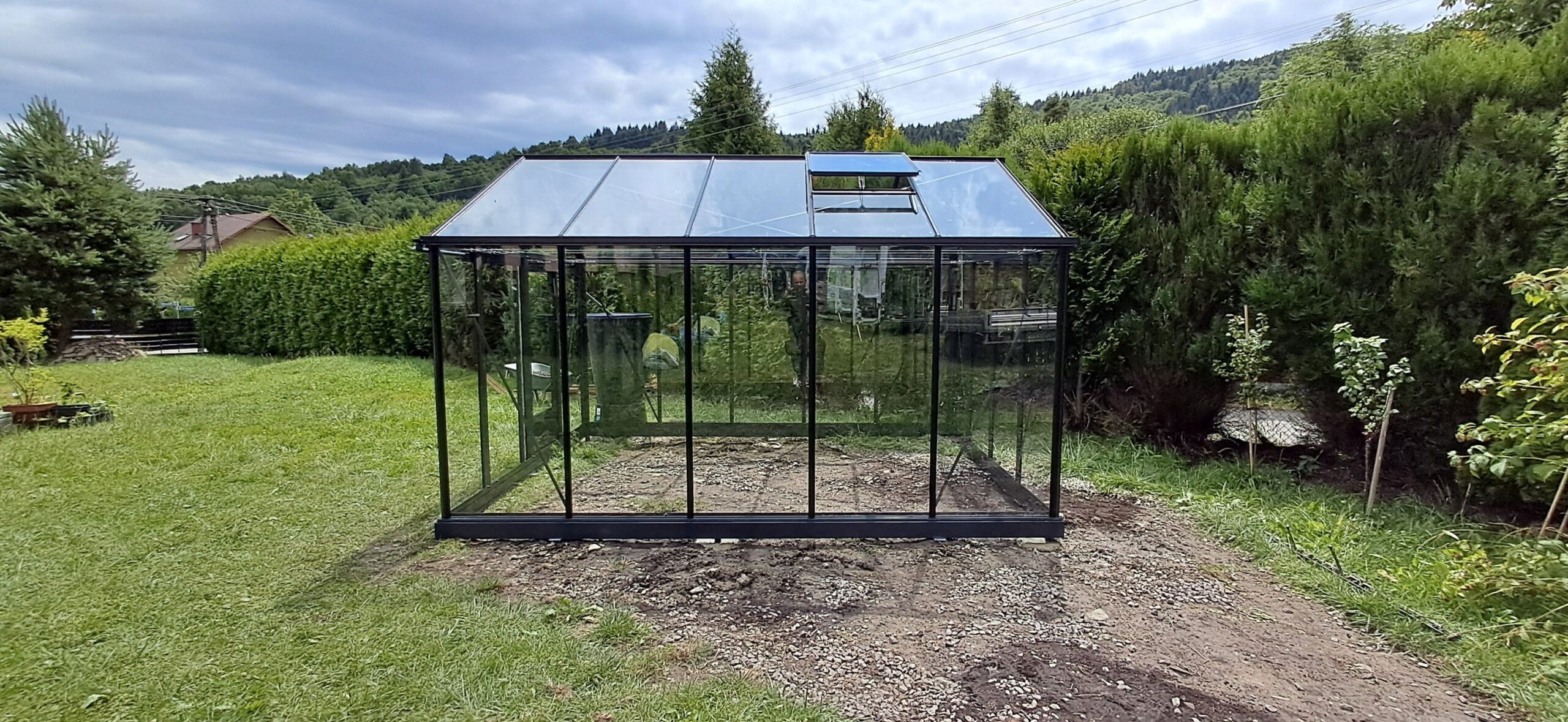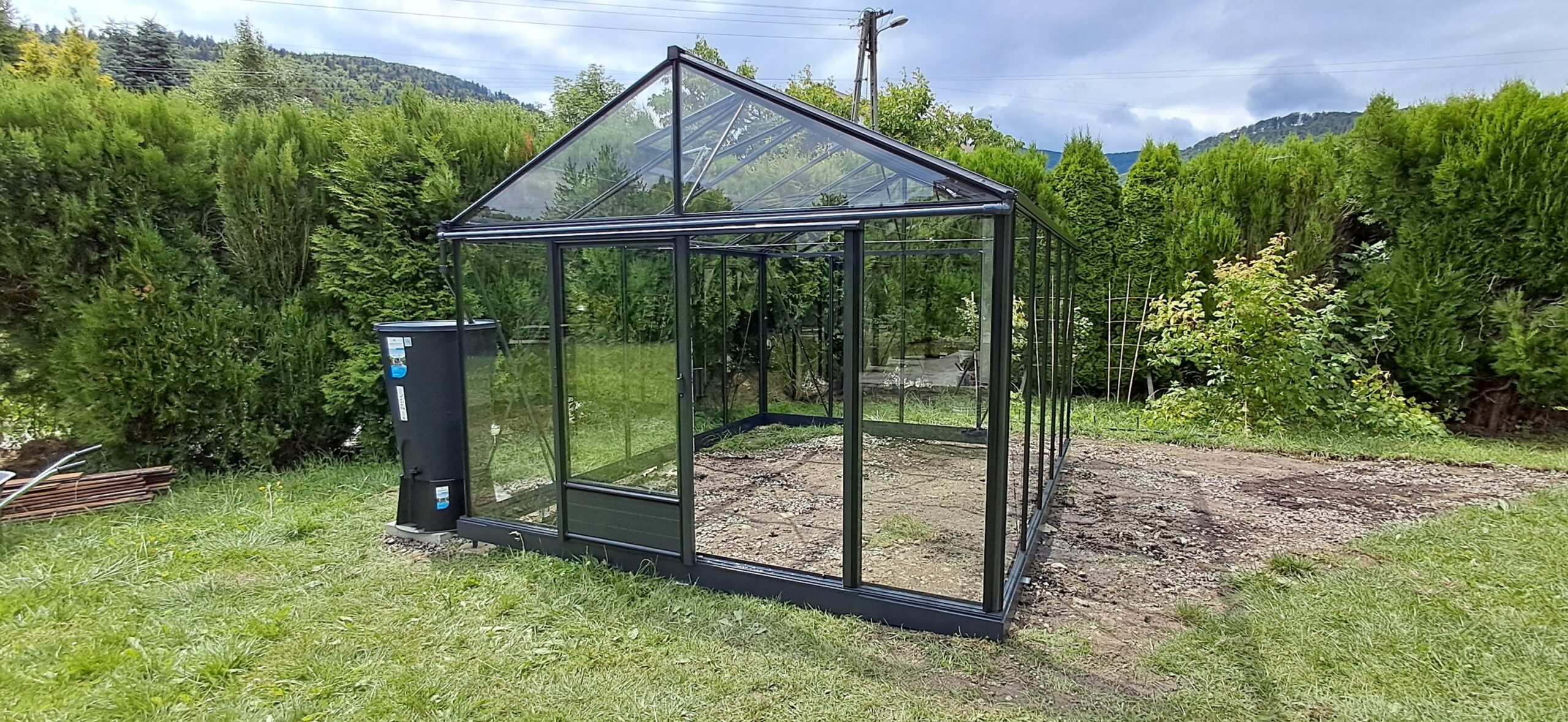Montaż szklarni ogrodowej Euro Maxi o wymiarach 309cm x 380cm. Aluminiowa konstrukcja w kolorze RAL 7021 – szary czarny została w całości pokryta szybą hartowaną 4mm. Na dachu zamontowano dwa okna z automatycznym mechanizmem otwierania. Na krótszej ścianie pojedyncze drzwi przesuwne o szerokości 84cm. Wewnątrz cztery rzędy linek do uprawy warzyw wysokopiennych. Woda deszczowa odprowadzana jest do zbiornika o pojemności 260L za pomocą systemu połączonych rur spustowych. Wysokość ścian to 181cm, a wysokość kalenicy 250cm. Miejsce montażu – Bystra w województwie śląskim.