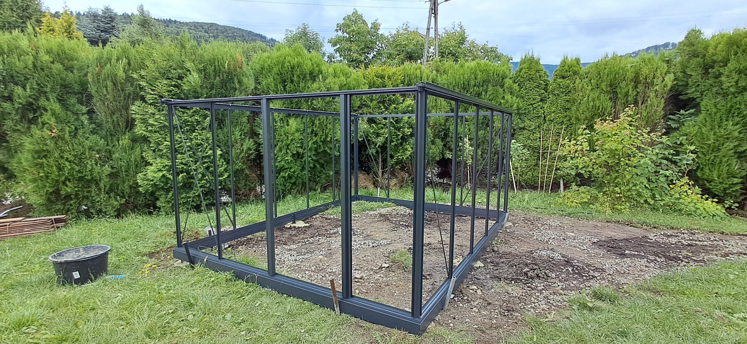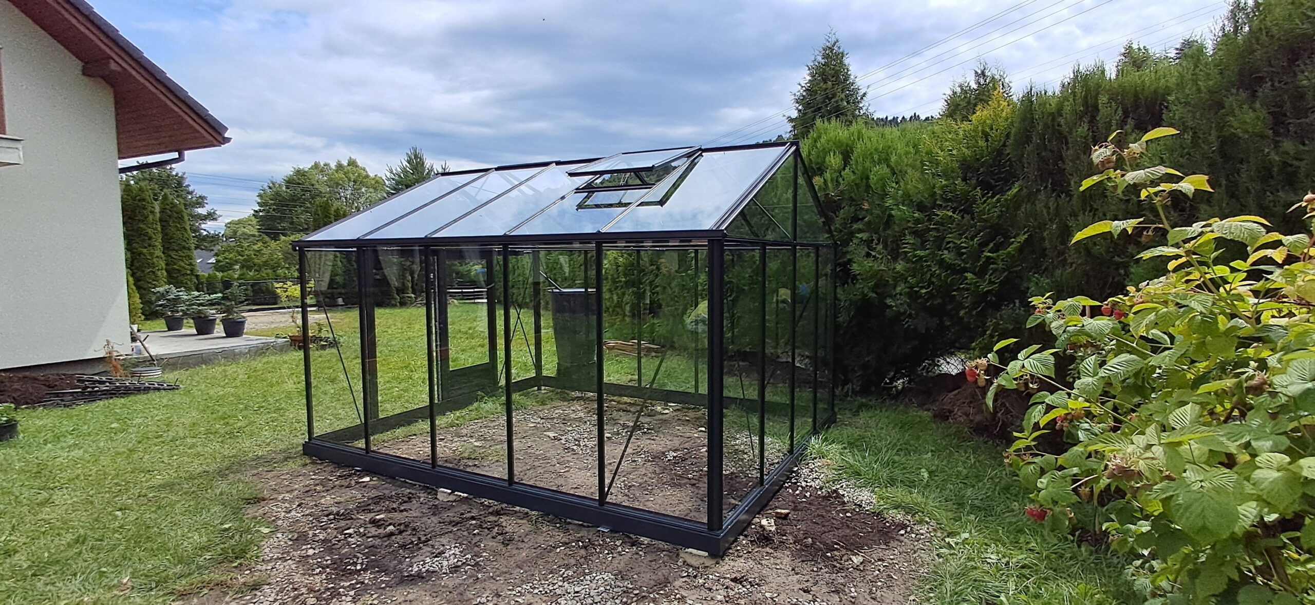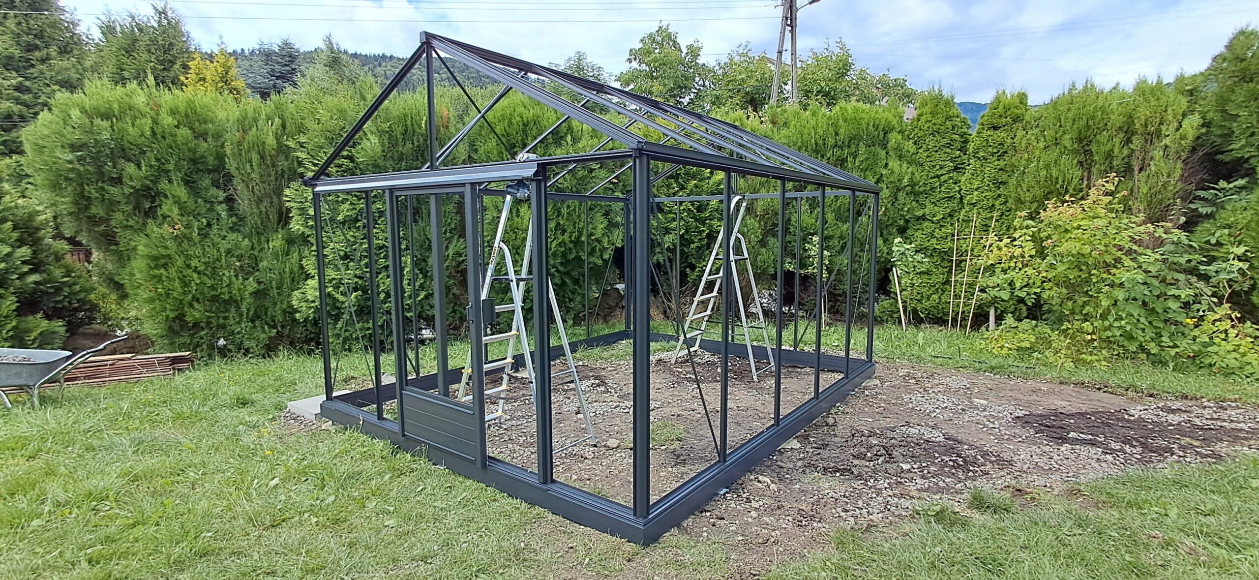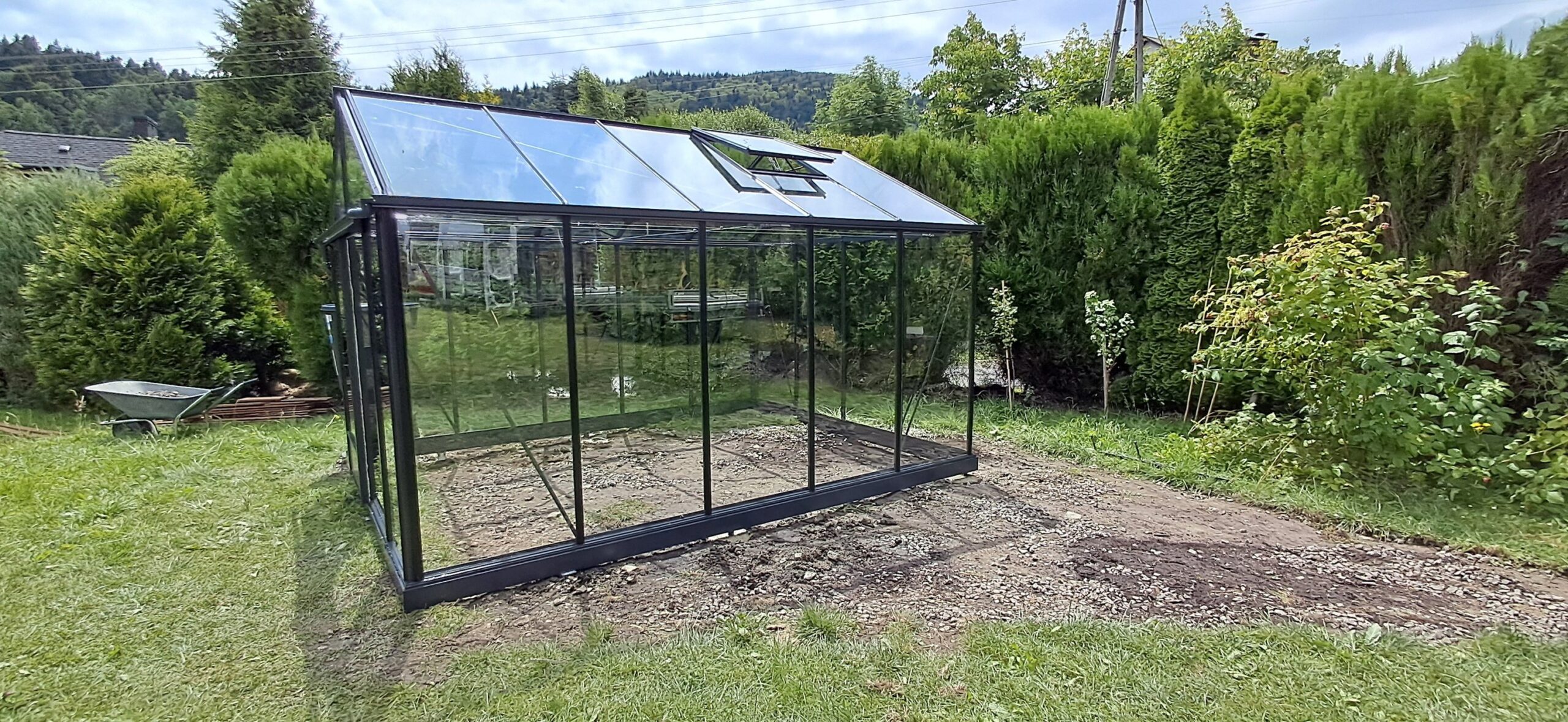 Montaż szklarni ogrodowej Euro Maxi o wymiarach 309cm x 380cm. Aluminiowa konstrukcja w kolorze RAL 7021 – szary czarny została w całości pokryta szybą hartowaną 4mm. Na dachu zamontowano dwa okna z automatycznym mechanizmem otwierania. Na krótszej ścianie pojedyncze drzwi przesuwne o szerokości 84cm. Wewnątrz cztery rzędy linek do uprawy warzyw wysokopiennych. Woda deszczowa odprowadzana jest do zbiornika o pojemności 260L za pomocą systemu połączonych rur spustowych. Wysokość ścian to 181cm, a wysokość kalenicy 250cm. Miejsce montażu – Bystra w województwie śląskim.