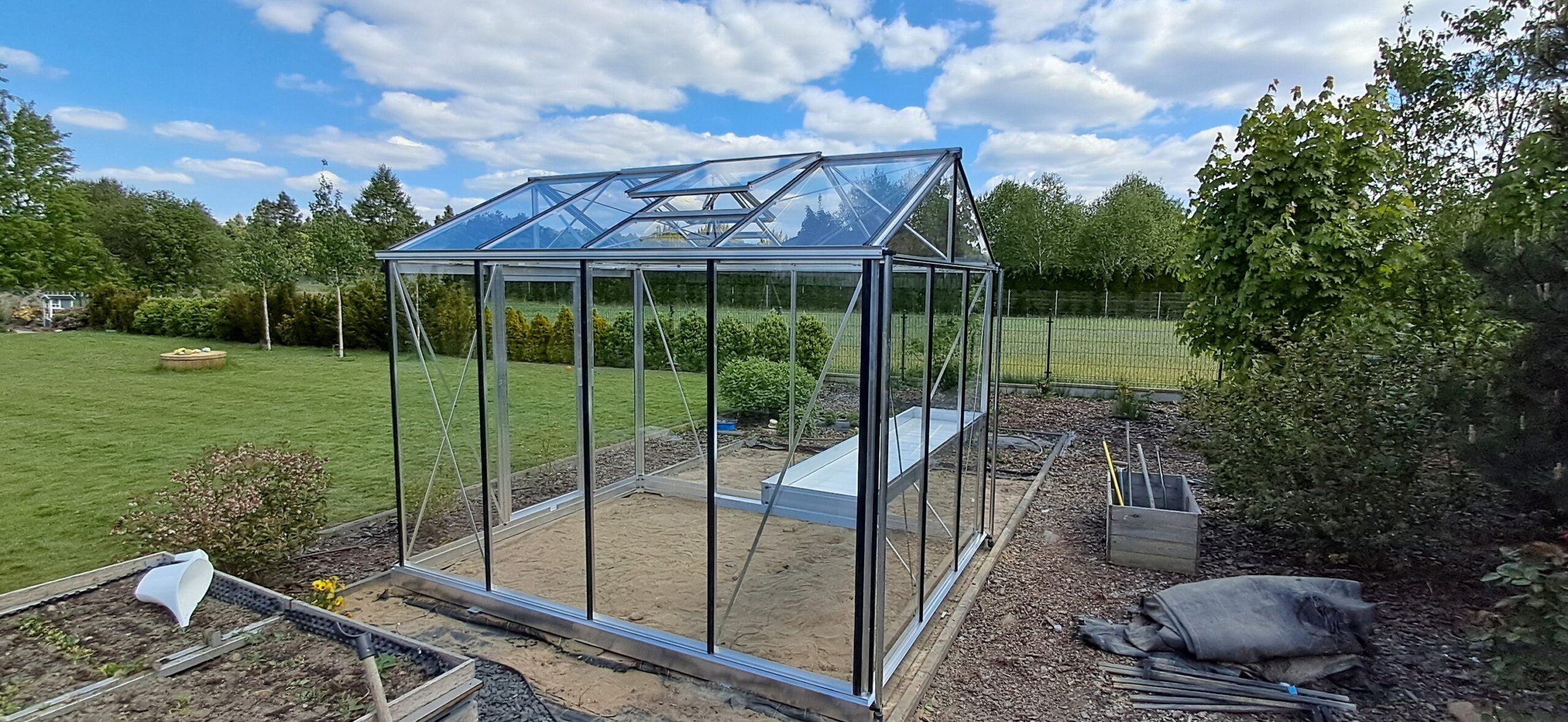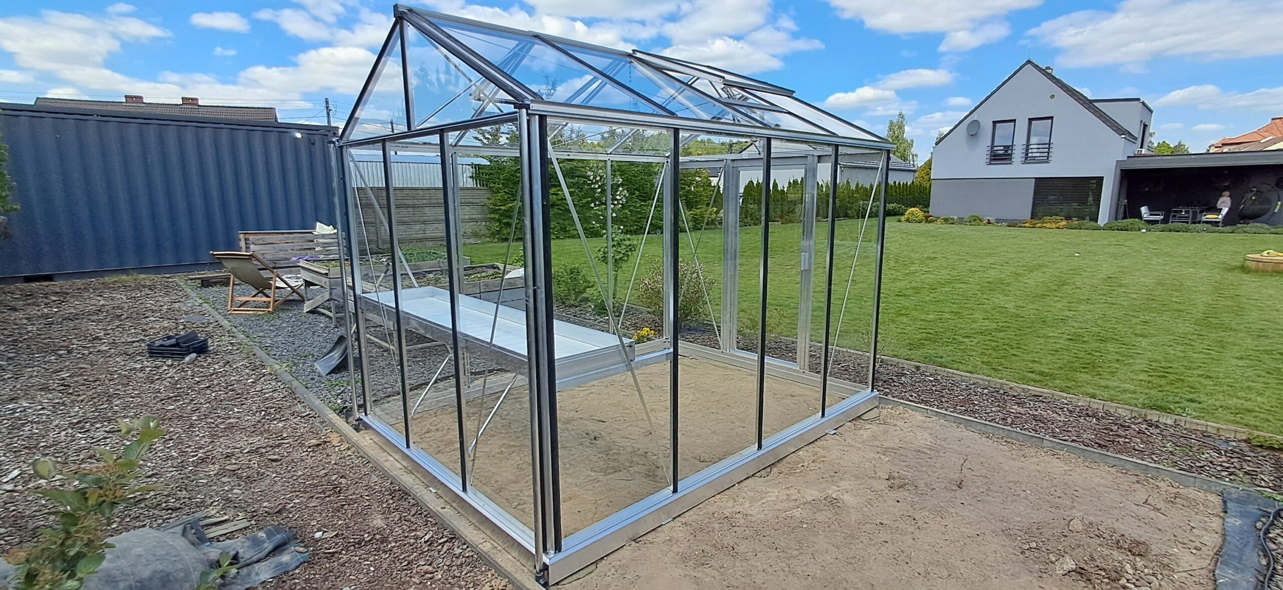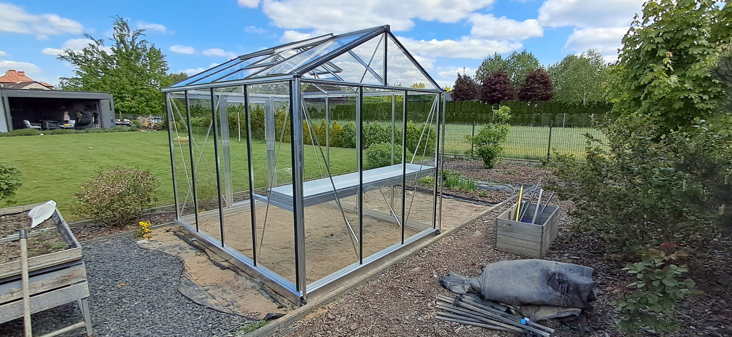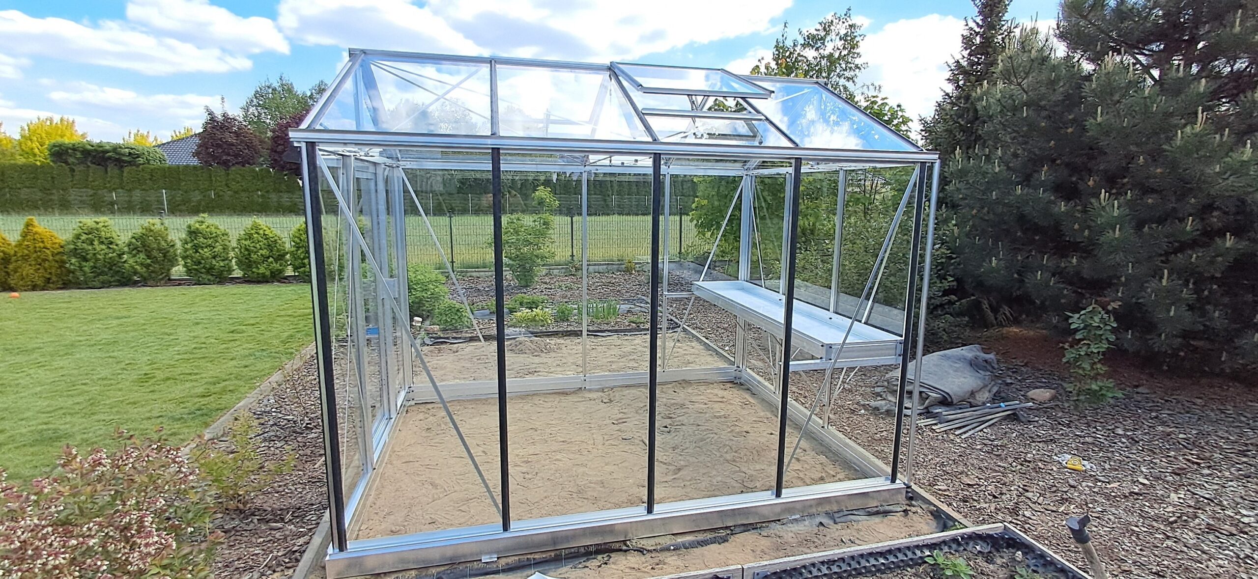 Montaż szklarni ogrodowej Euro Maxi o wymiarach 236cm x 309cm. Aluminiowa niemalowana konstrukcja została w całości pokryta szybą hartowaną 4mm. Na dachu zamontowano dwa okna z automatycznym mechanizmem otwierania. Na krótszej ścianie pojedyncze drzwi przesuwne o szerokości 84cm. Wewnątrz cztery rzędy linek do uprawy warzyw wysokopiennych oraz kiełkownica o długości 236cm. Wysokość ścian to 201cm, a wysokość kalenicy 256cm. Miejsce montażu – Chrząstowice w województwie opolskim.