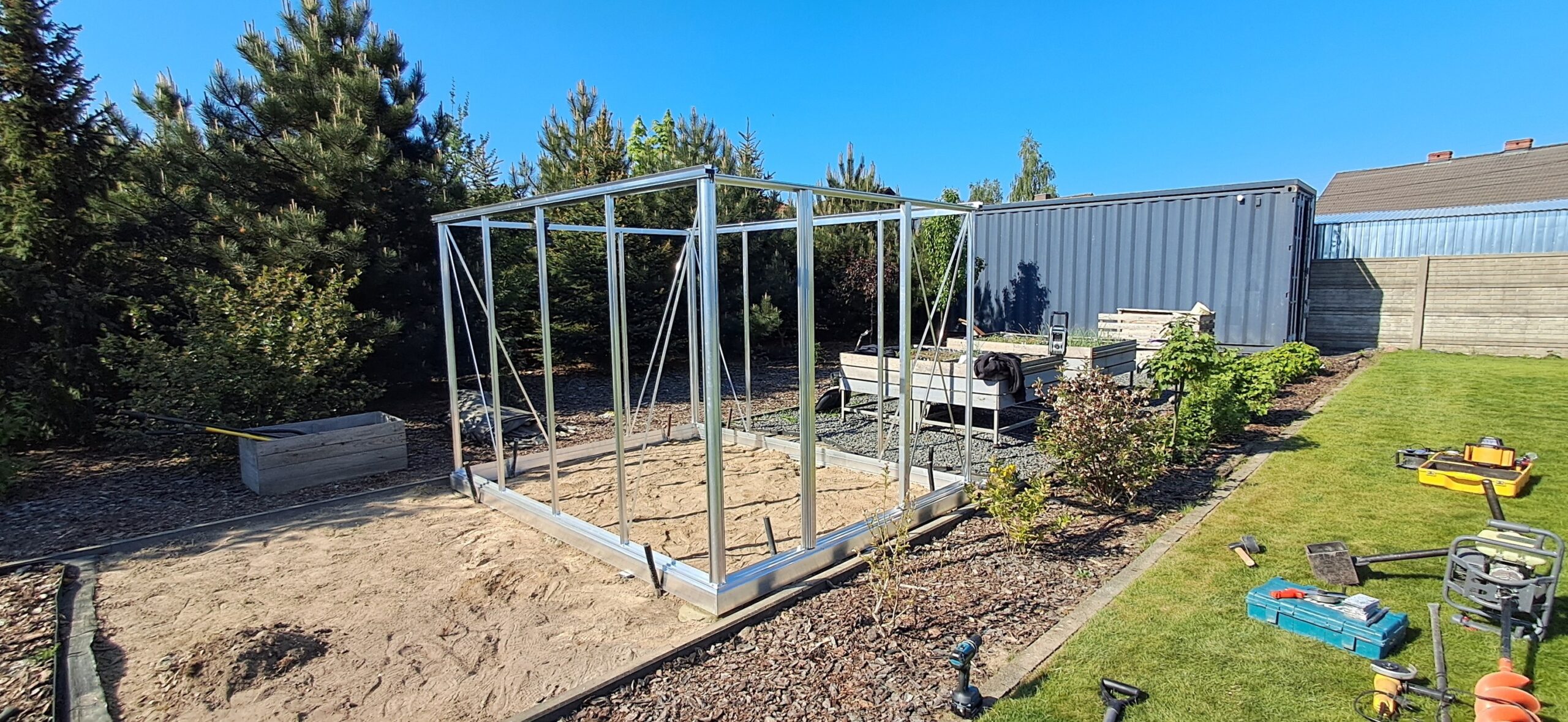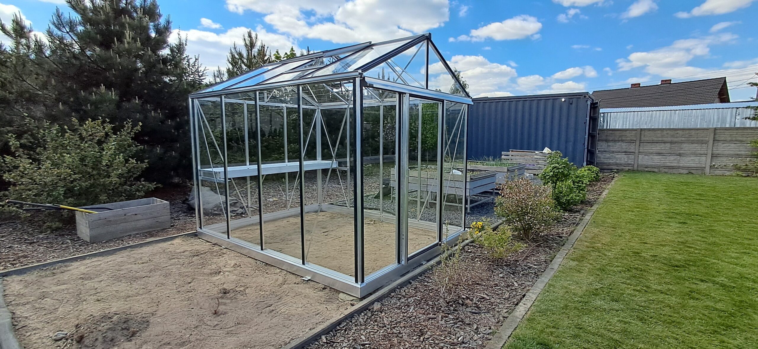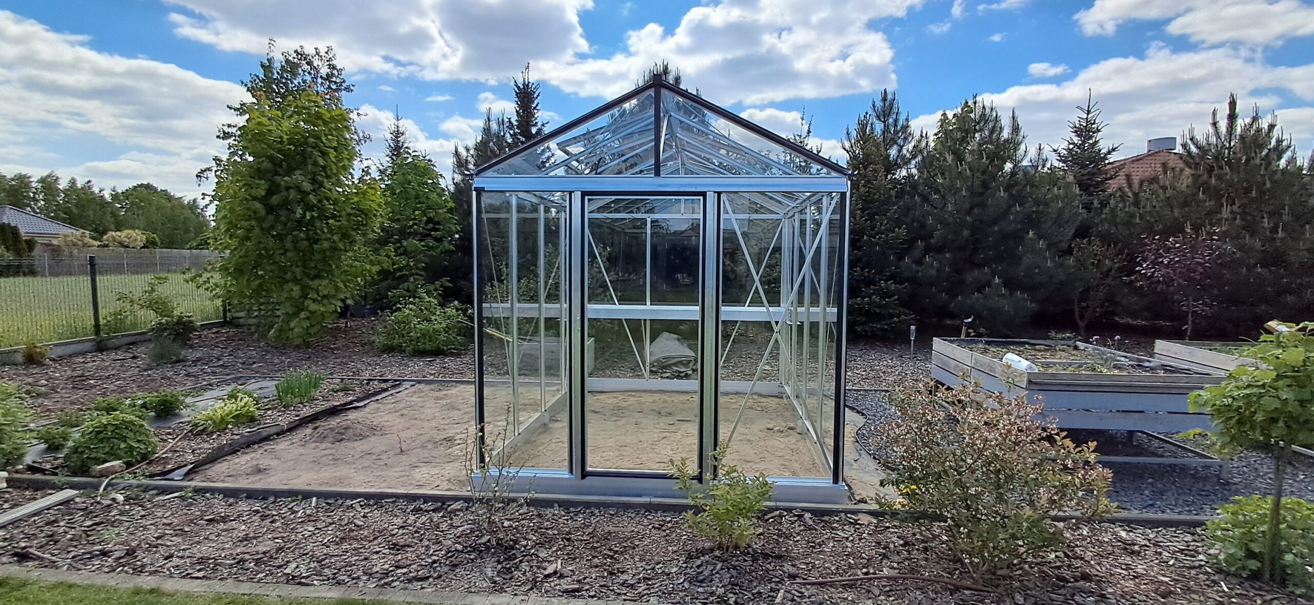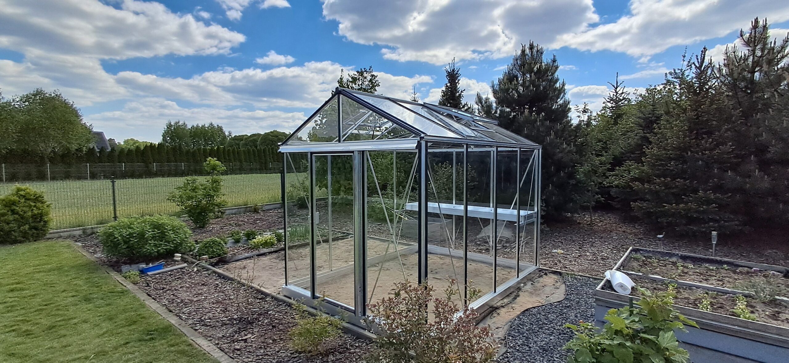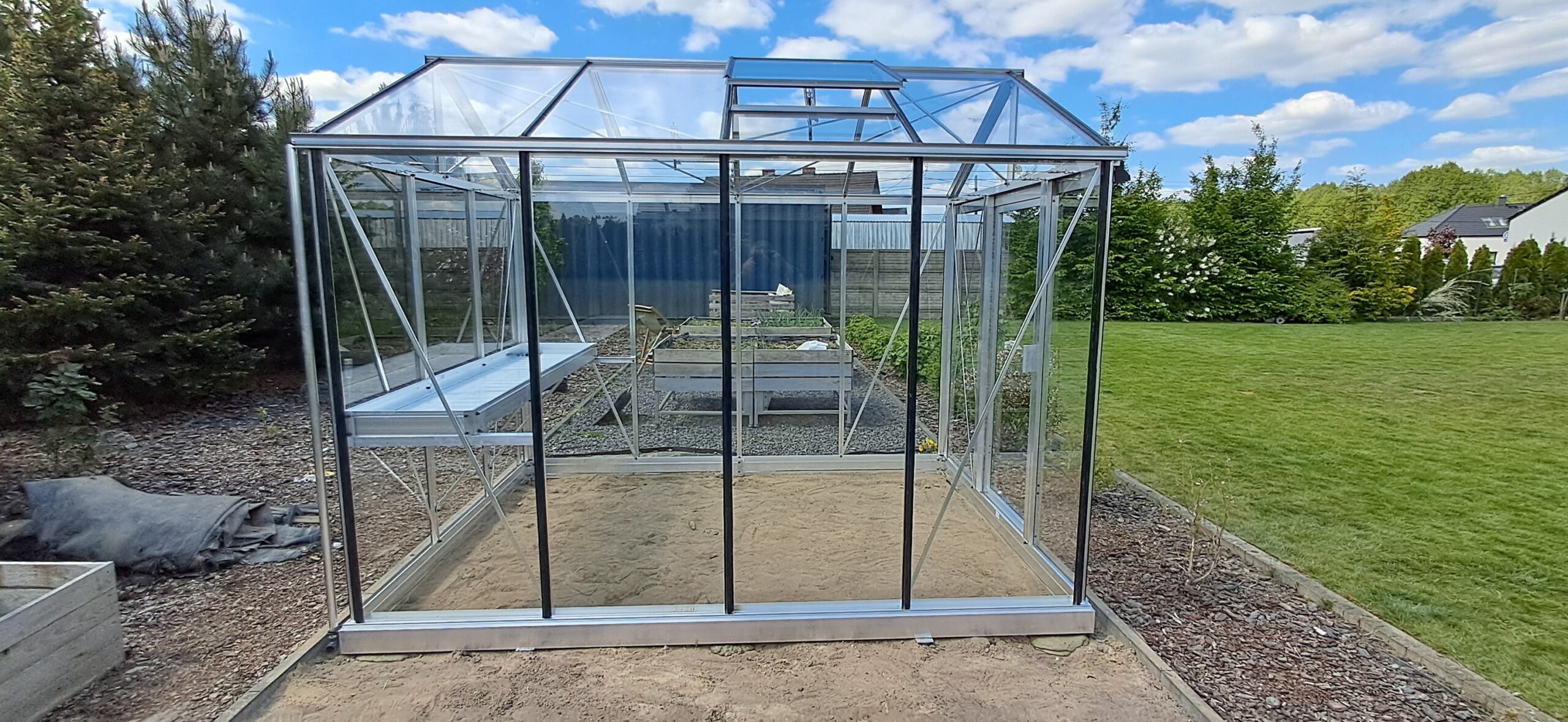 Montaż szklarni ogrodowej Euro Maxi o wymiarach 236cm x 309cm. Aluminiowa niemalowana konstrukcja została w całości pokryta szybą hartowaną 4mm. Na dachu zamontowano dwa okna z automatycznym mechanizmem otwierania. Na krótszej ścianie pojedyncze drzwi przesuwne o szerokości 84cm. Wewnątrz cztery rzędy linek do uprawy warzyw wysokopiennych oraz kiełkownica o długości 236cm. Wysokość ścian to 201cm, a wysokość kalenicy 256cm. Miejsce montażu – Chrząstowice w województwie opolskim.