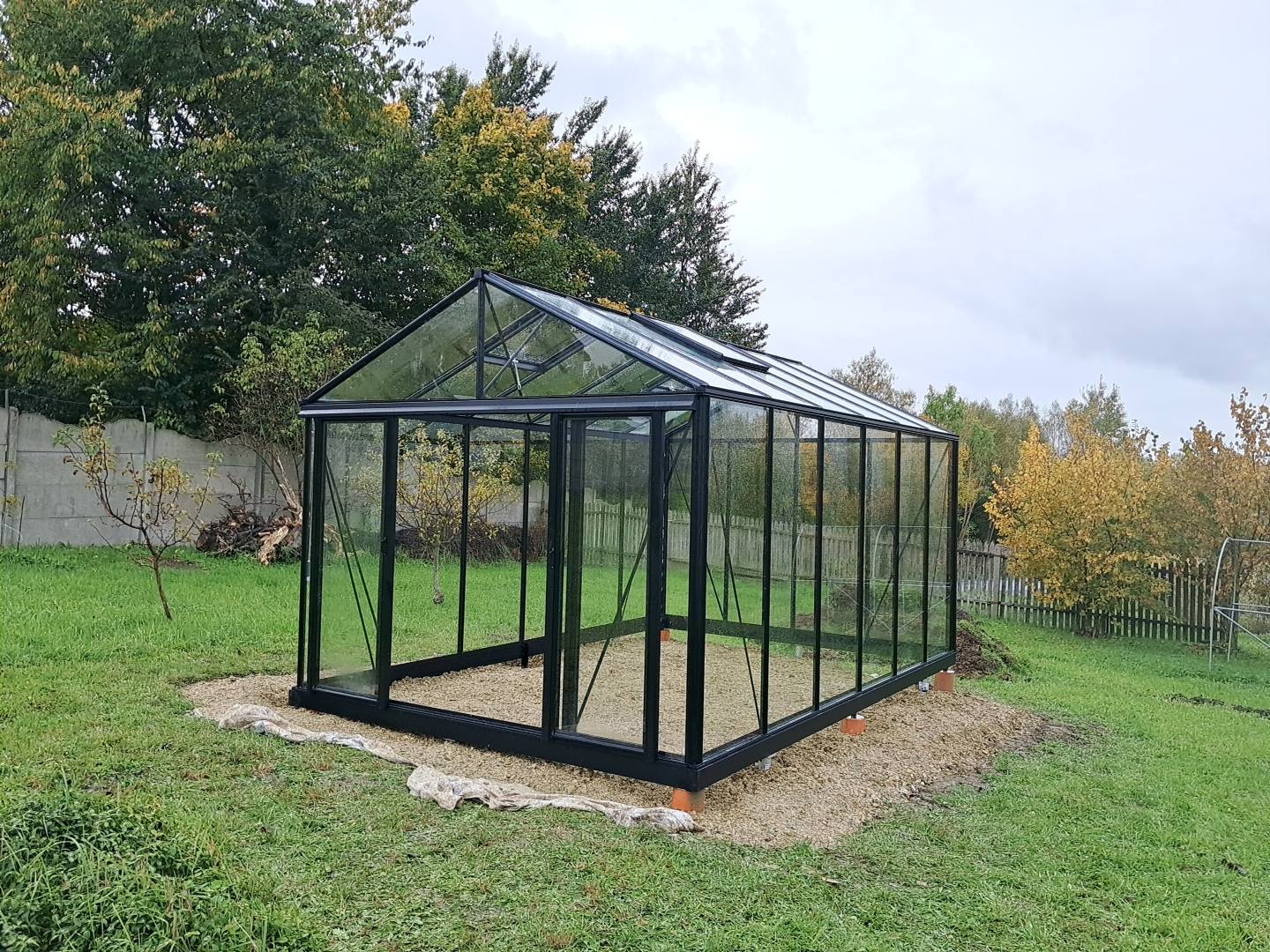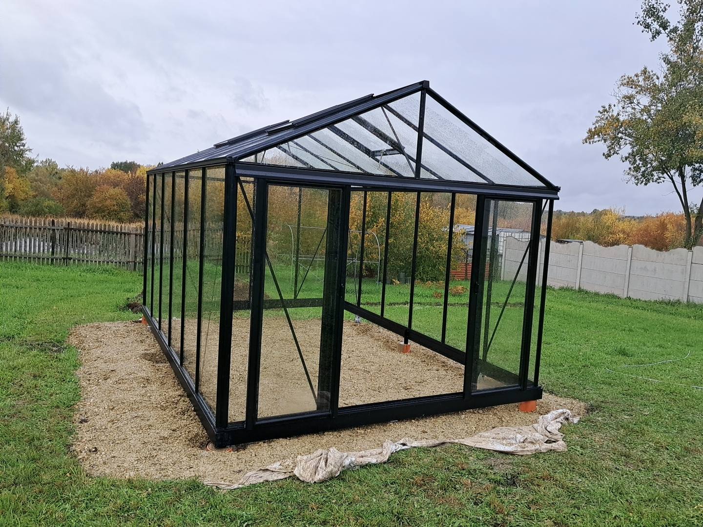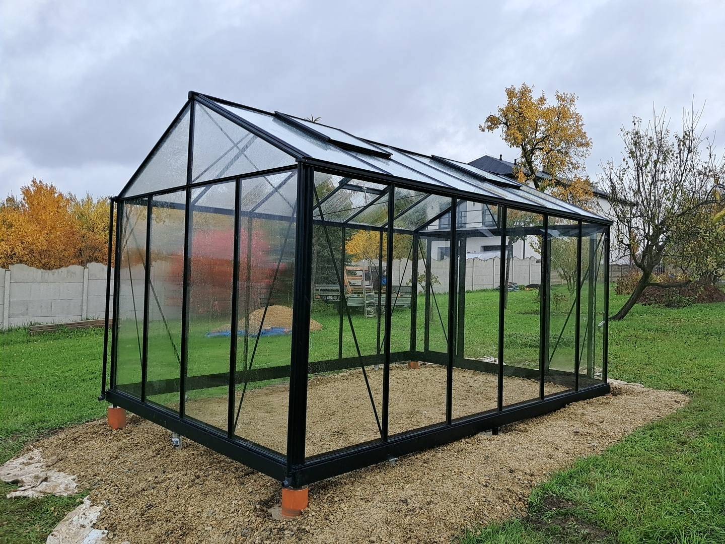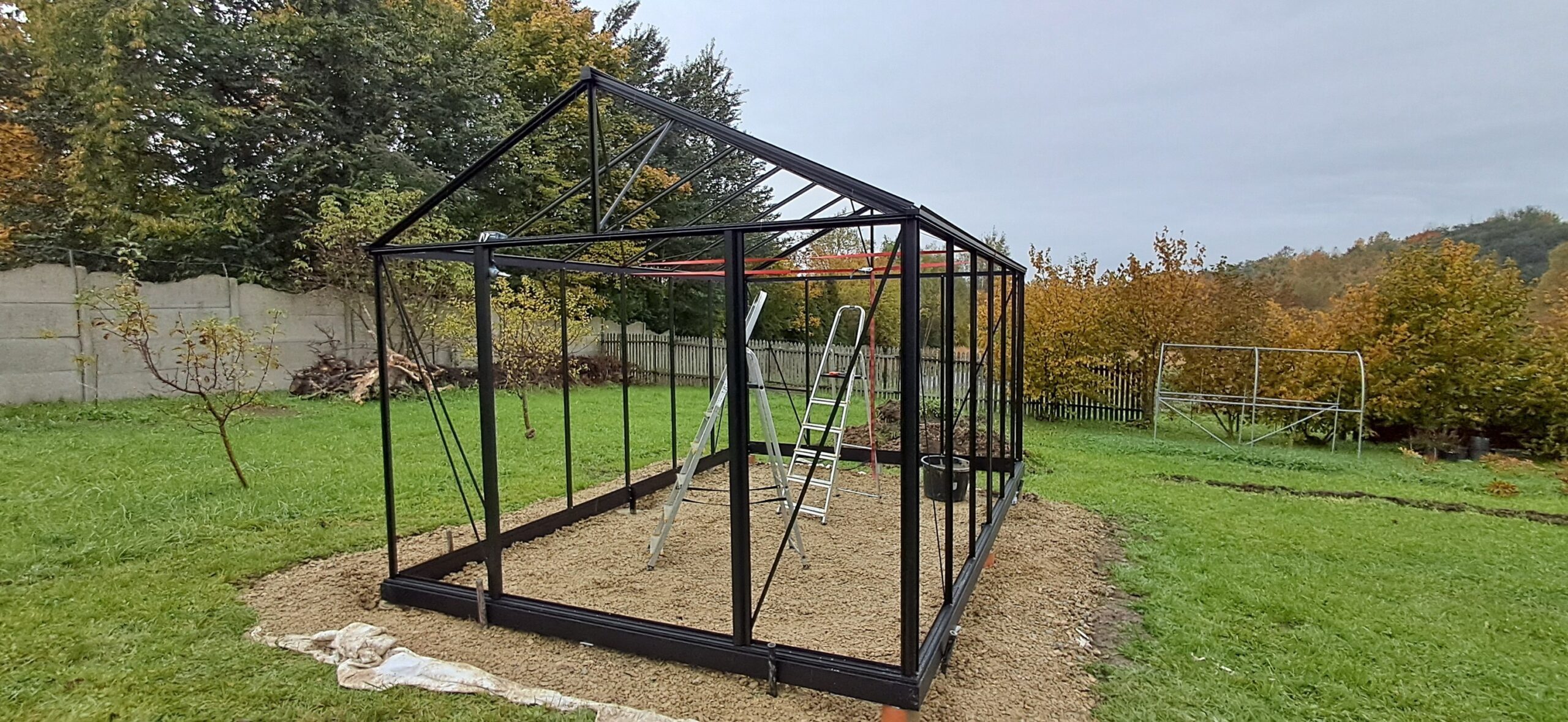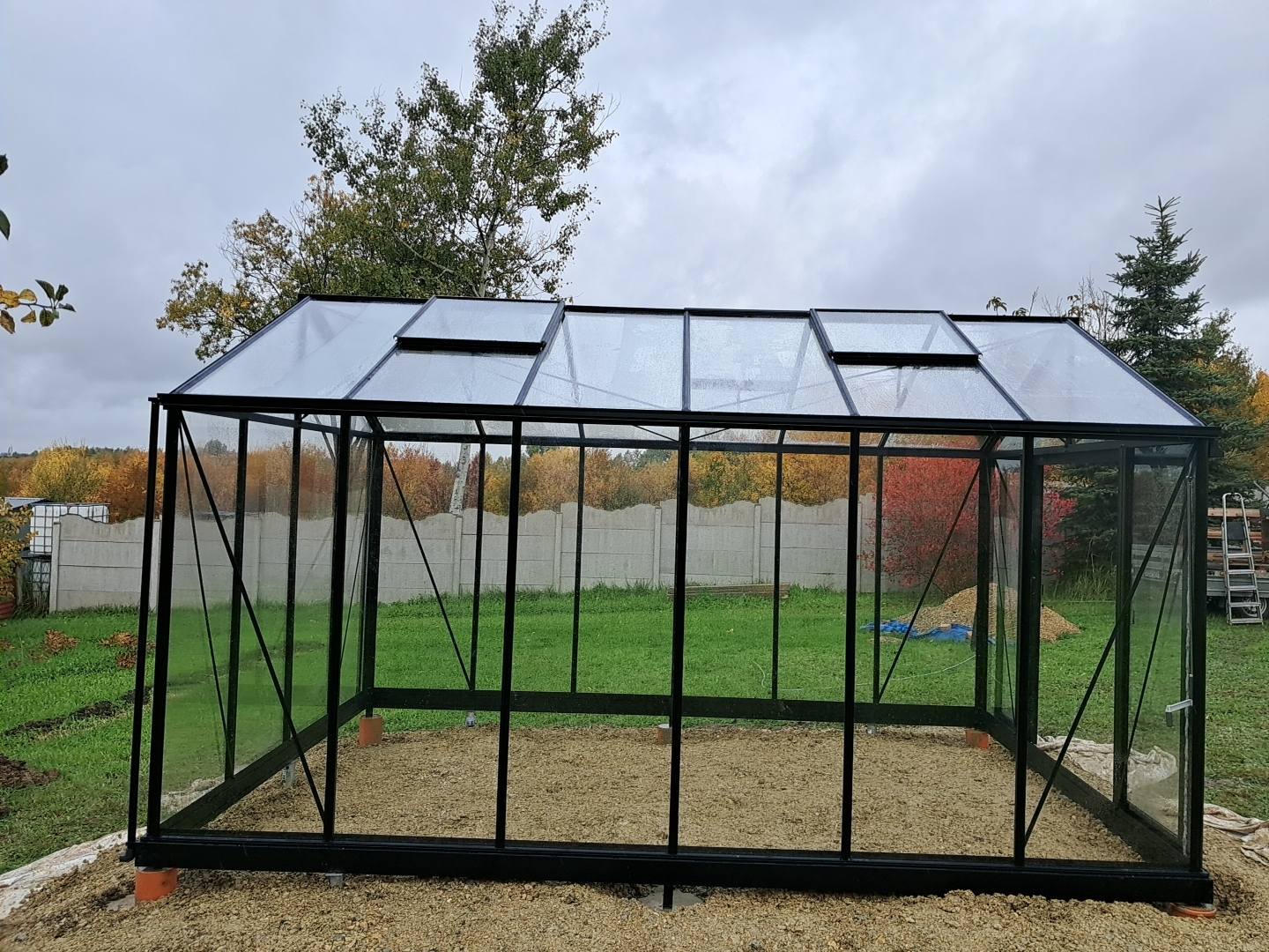 Montaż szklarni ogrodowej Euro Maxi o wymiarach 309cm x 457cm. Aluminiowa konstrukcja w kolorze RAL 9005 – czarny strukturalny została w całości pokryta szybą hartowaną 4mm. Na dachu zamontowano trzy okna z mechanizmem otwierania Spindel. Na krótszej ścianie podwójne drzwi przesuwne o szerokości 2x70cm. Wysokość ścian to 201cm, a wysokość kalenicy 270cm. Miejsce montażu – Częstochowa w województwie śląskim.