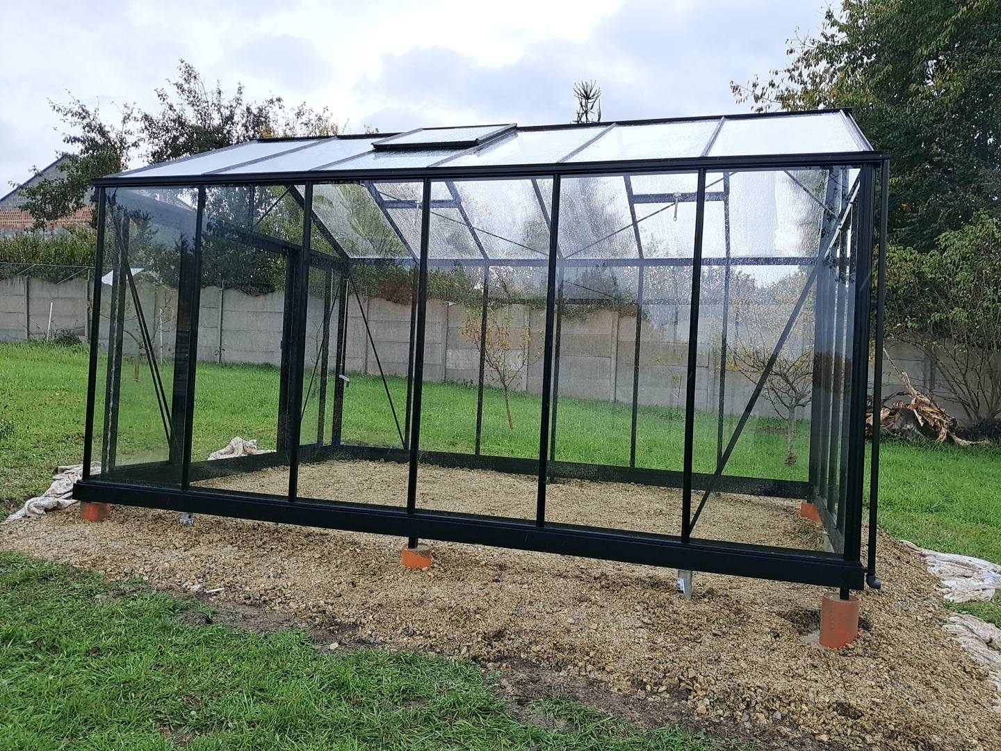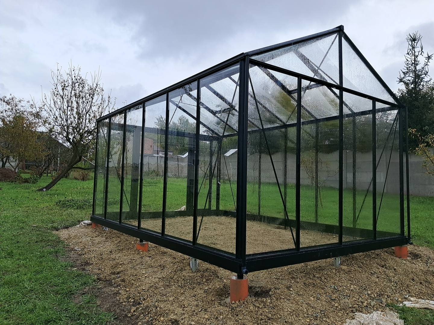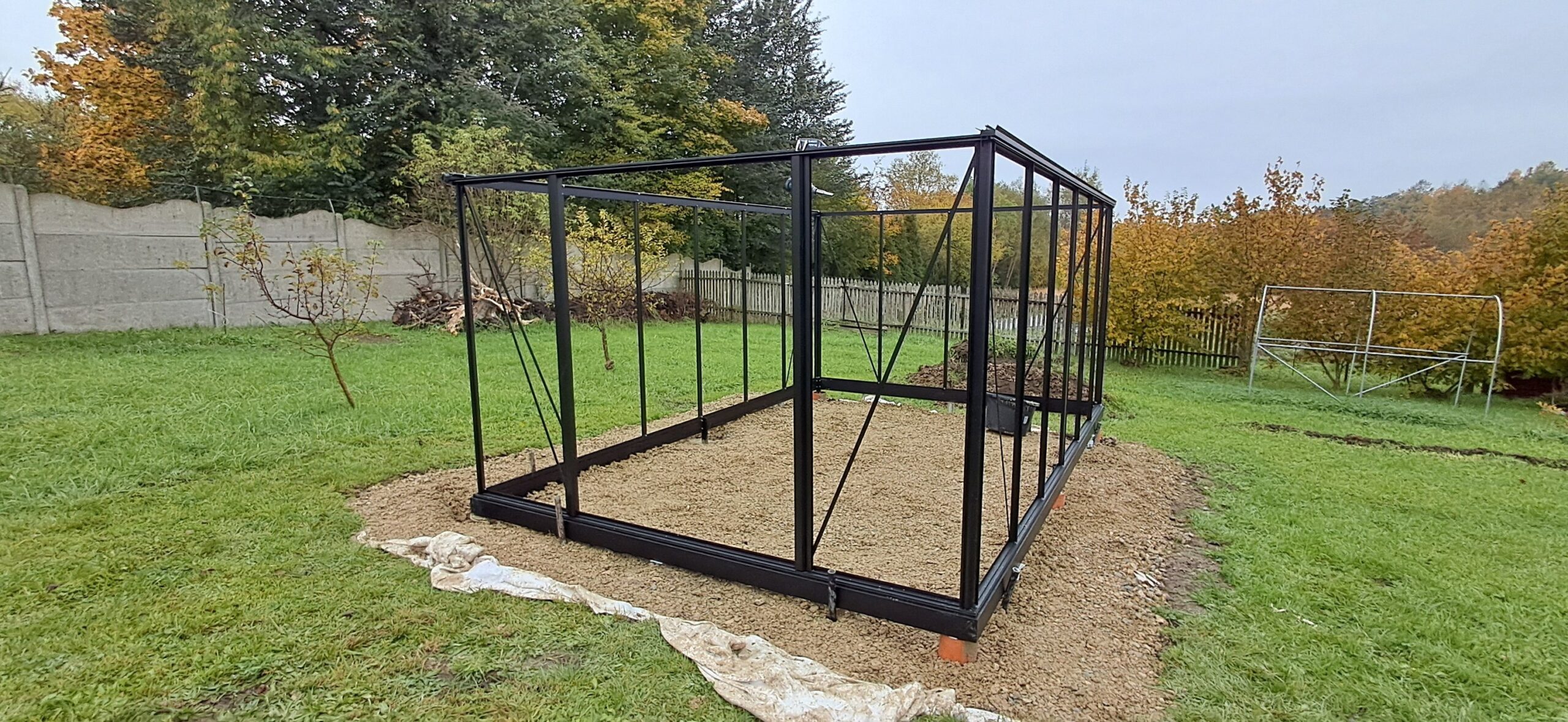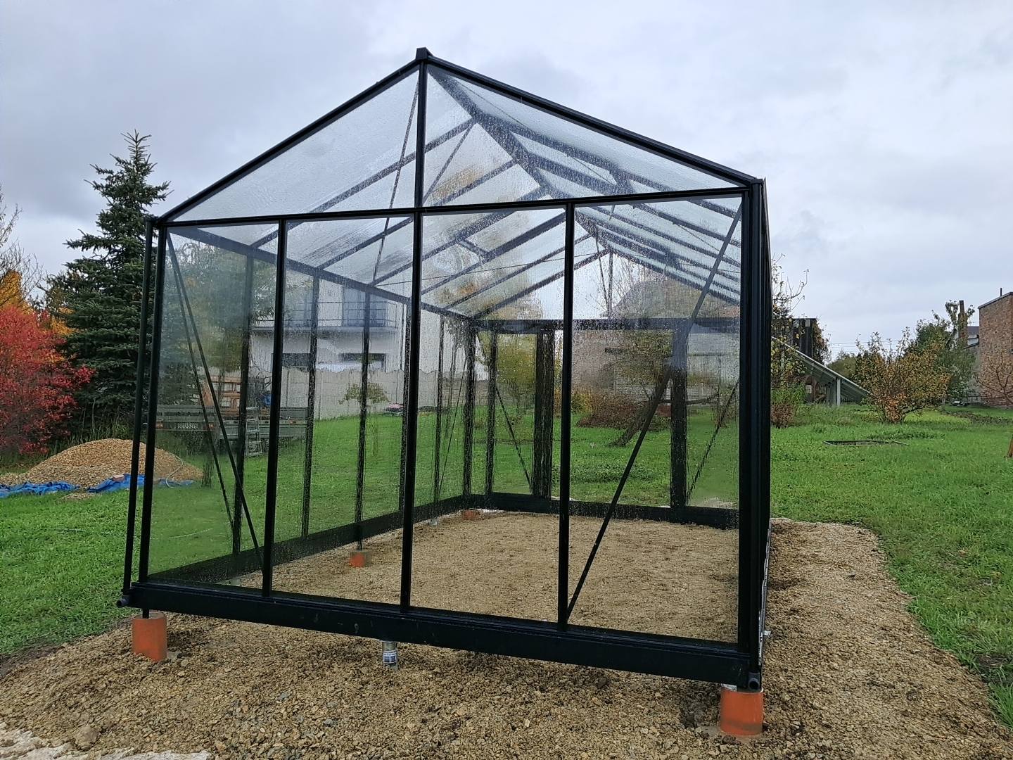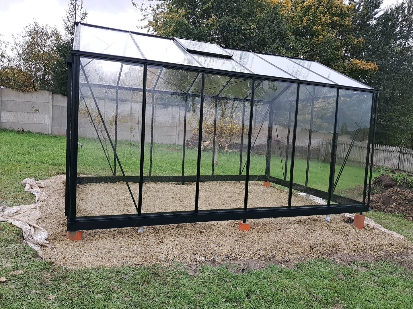 Montaż szklarni ogrodowej Euro Maxi o wymiarach 309cm x 457cm. Aluminiowa konstrukcja w kolorze RAL 9005 – czarny strukturalny została w całości pokryta szybą hartowaną 4mm. Na dachu zamontowano trzy okna z mechanizmem otwierania Spindel. Na krótszej ścianie podwójne drzwi przesuwne o szerokości 2x70cm. Wysokość ścian to 201cm, a wysokość kalenicy 270cm. Miejsce montażu – Częstochowa w województwie śląskim.