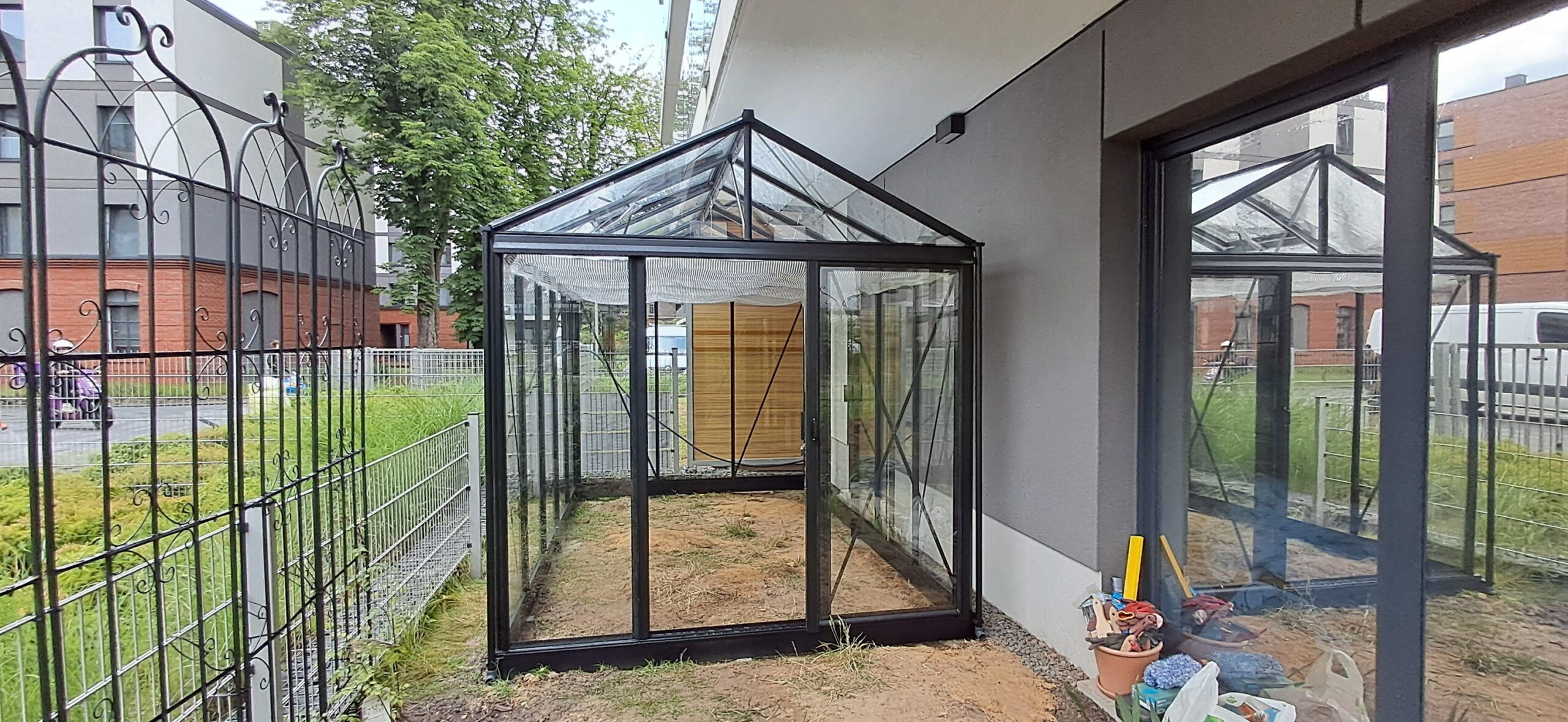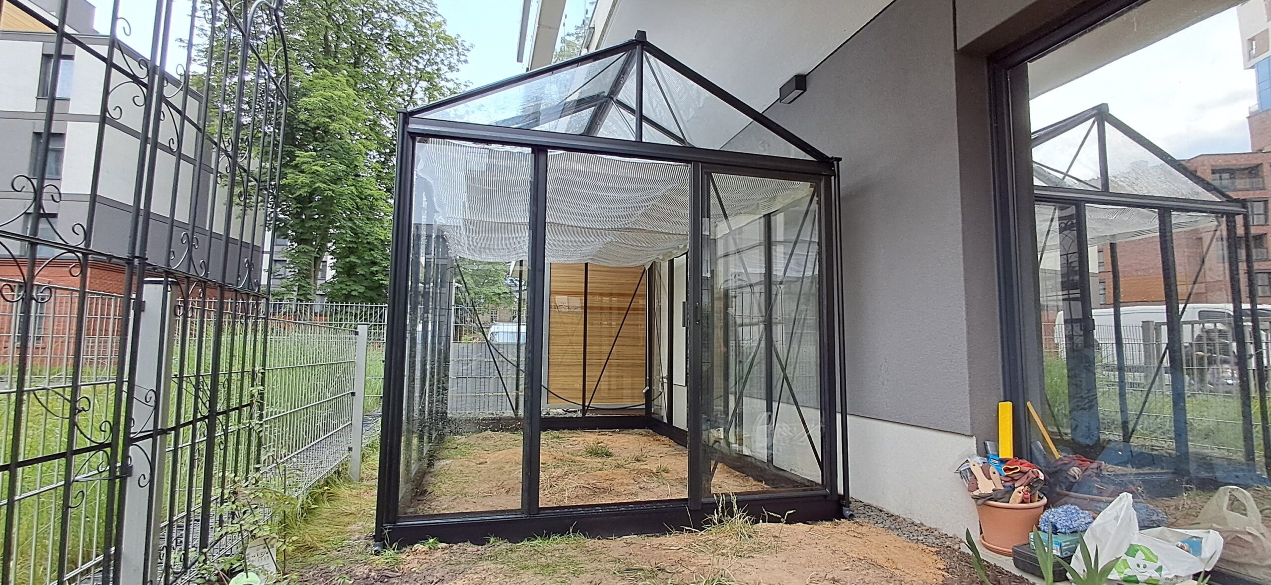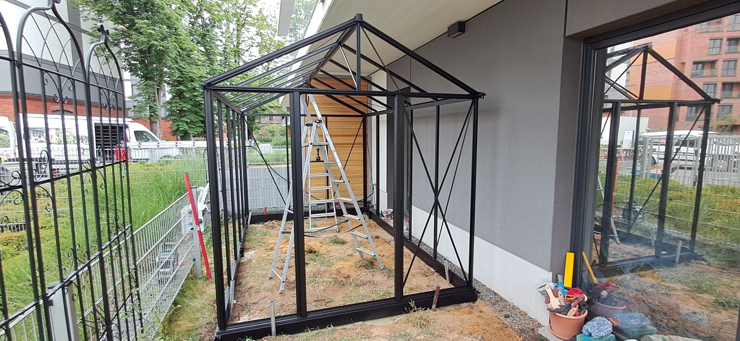 Montaż szklarni ogrodowej Euro Maxi o wymiarach 236cm x 380cm. Aluminiowa konstrukcja w kolorze RAL 9005 – czarny głęboki strukturalny została w całości pokryta szybą hartowaną 4mm. Na dachu zamontowano dwa okna z czego jedno z automatycznym mechanizmem otwierania, a drugie z mechanizmem otwierania Spindel. Na krótszej oraz dłuższej ścianie zamontowano pojedyncze drzwi przesuwne o szerokości 84cm. Wewnątrz kurtyna cieniującą. Wysokość ścian to 201cm, a wysokość kalenicy 256cm. Miejsce montażu – Kraków w województwie małopolskim.