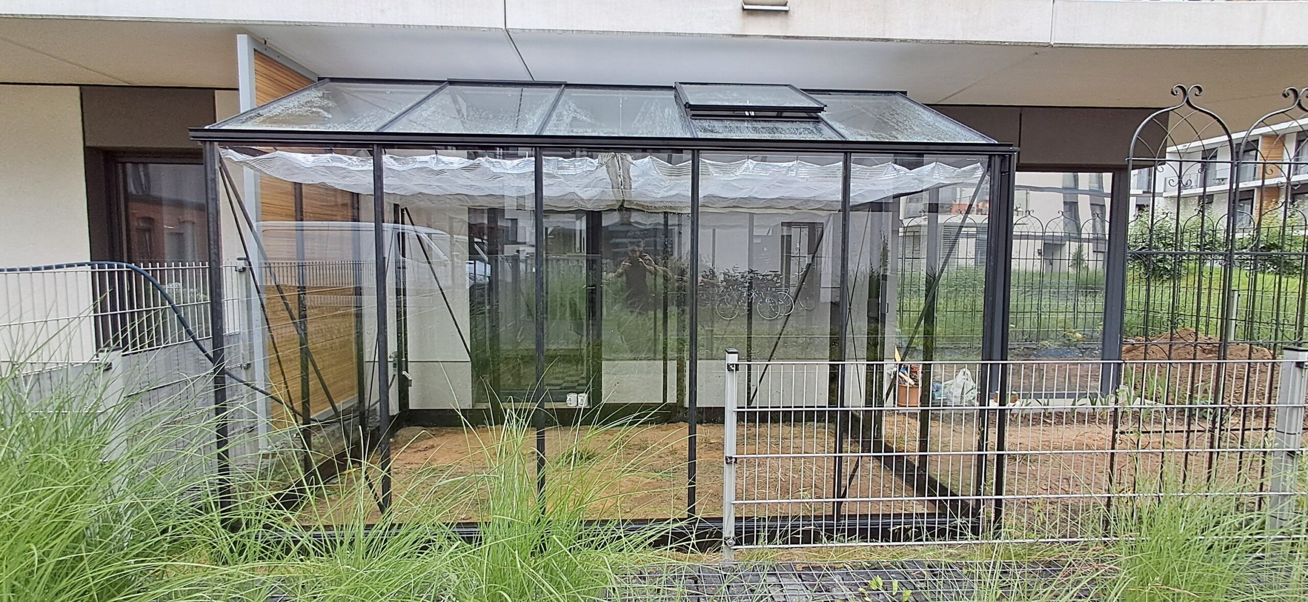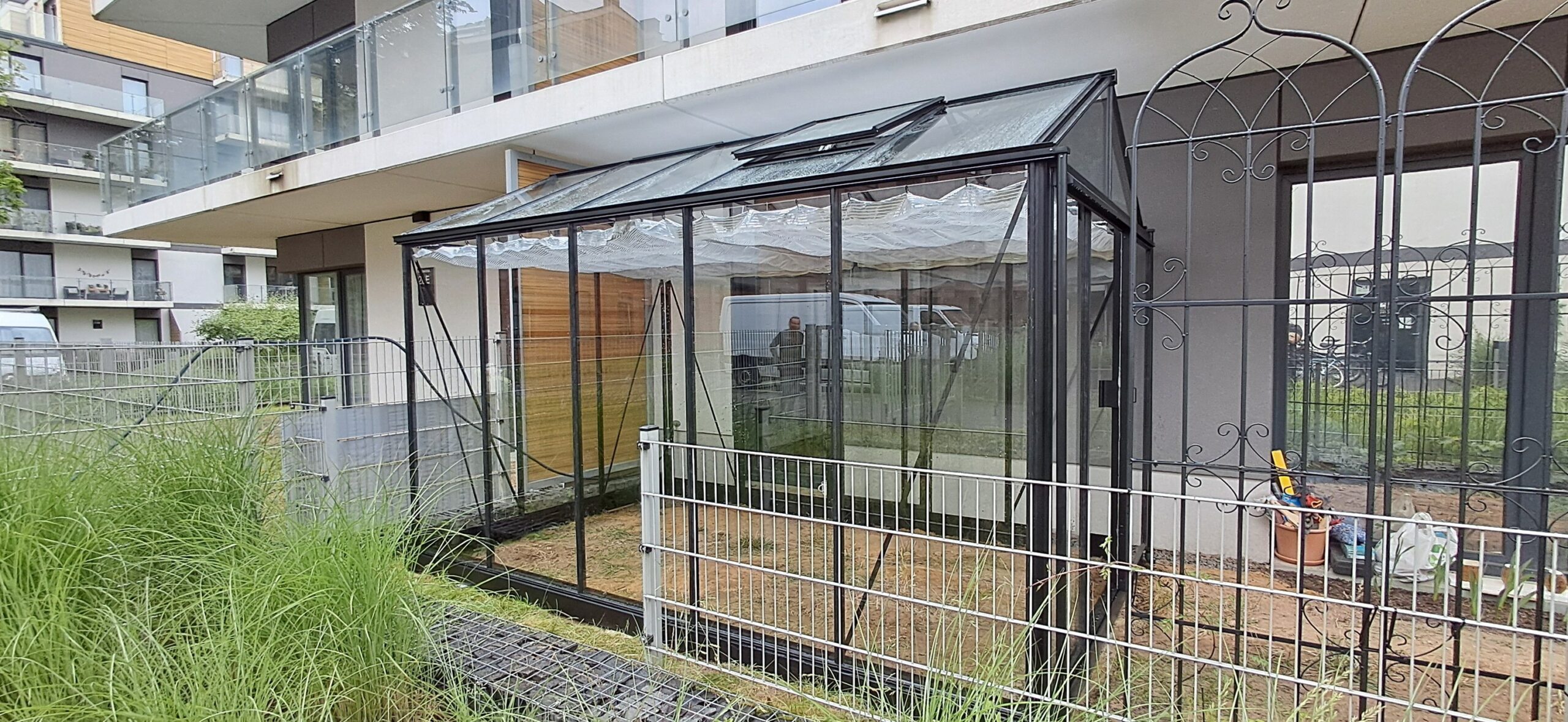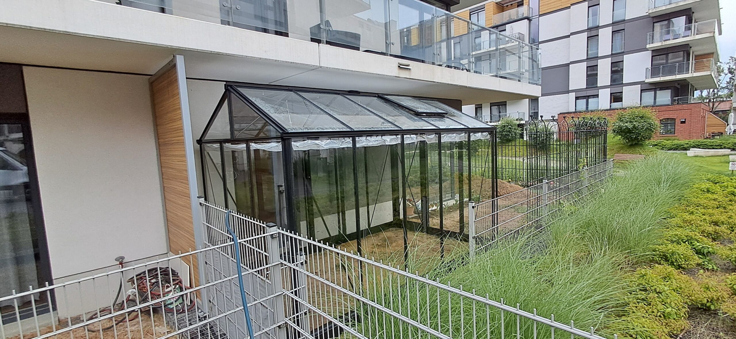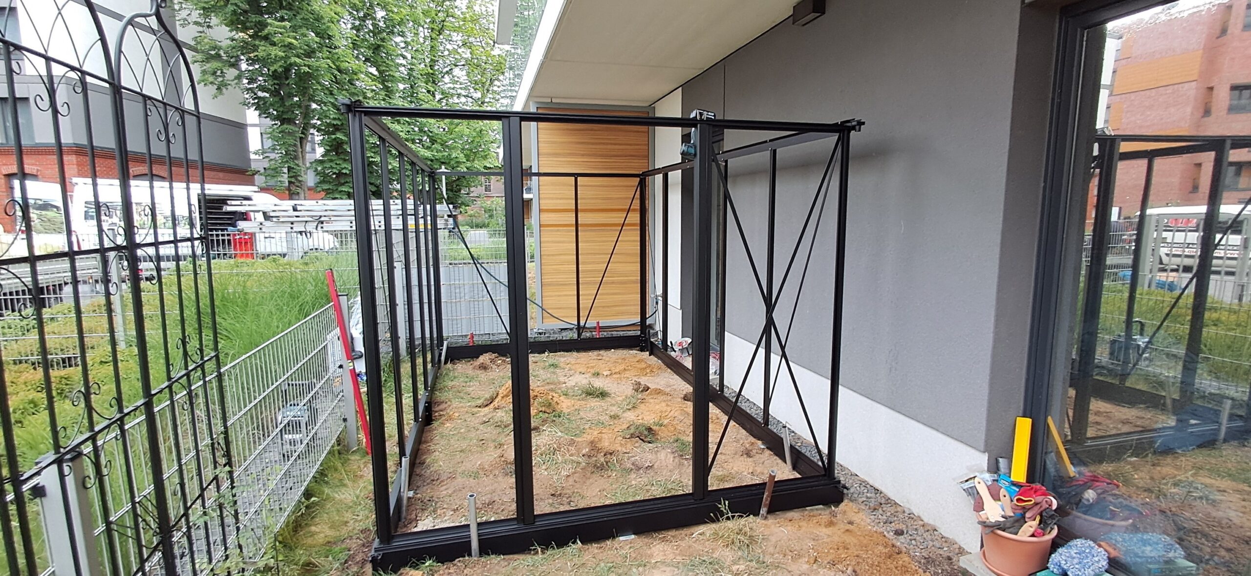 Montaż szklarni ogrodowej Euro Maxi o wymiarach 236cm x 380cm. Aluminiowa konstrukcja w kolorze RAL 9005 – czarny głęboki strukturalny została w całości pokryta szybą hartowaną 4mm. Na dachu zamontowano dwa okna z czego jedno z automatycznym mechanizmem otwierania, a drugie z mechanizmem otwierania Spindel. Na krótszej oraz dłuższej ścianie zamontowano pojedyncze drzwi przesuwne o szerokości 84cm. Wewnątrz kurtyna cieniującą. Wysokość ścian to 201cm, a wysokość kalenicy 256cm. Miejsce montażu – Kraków w województwie małopolskim.