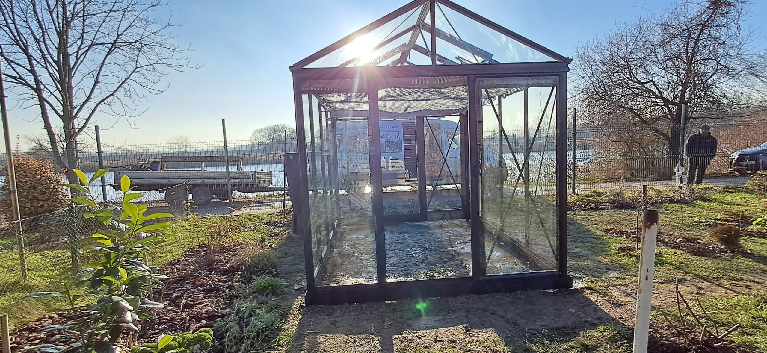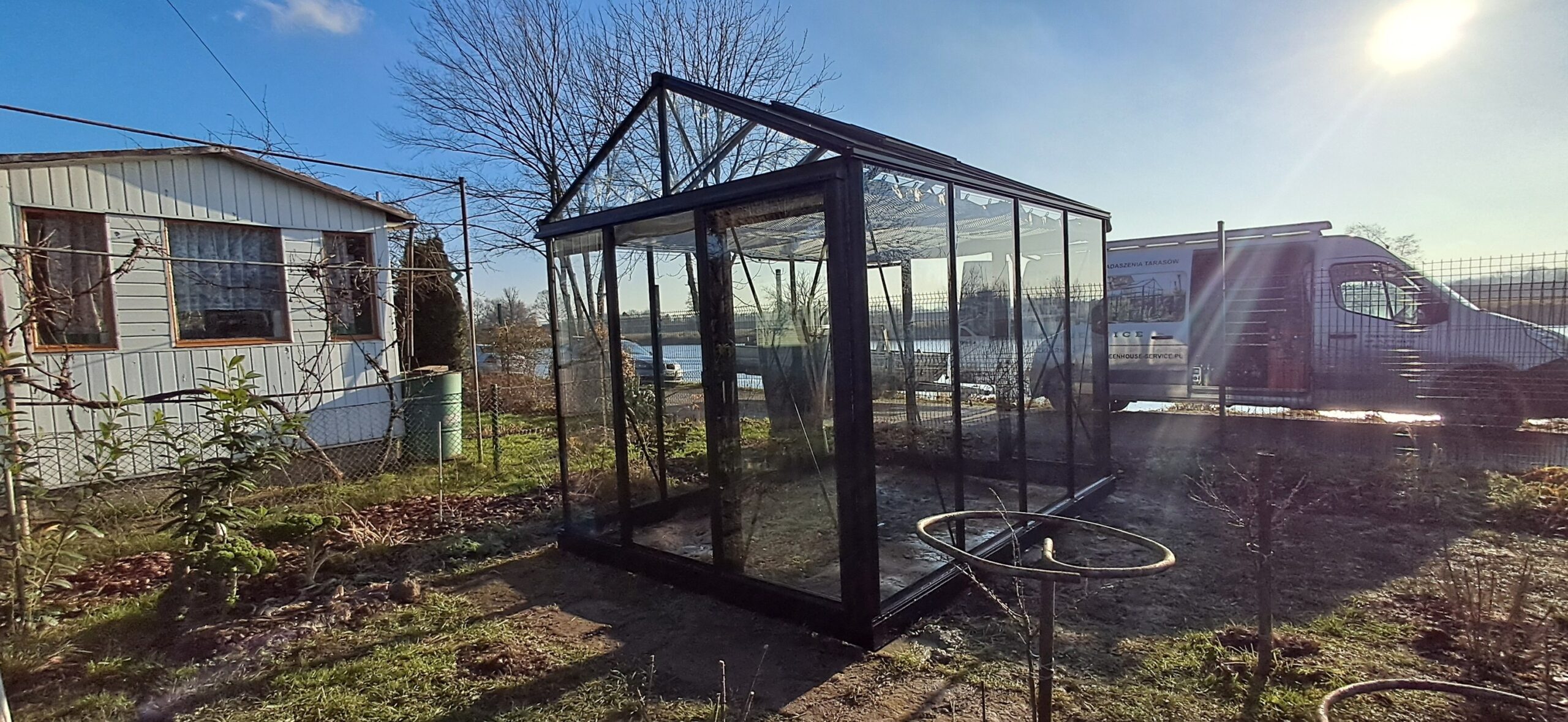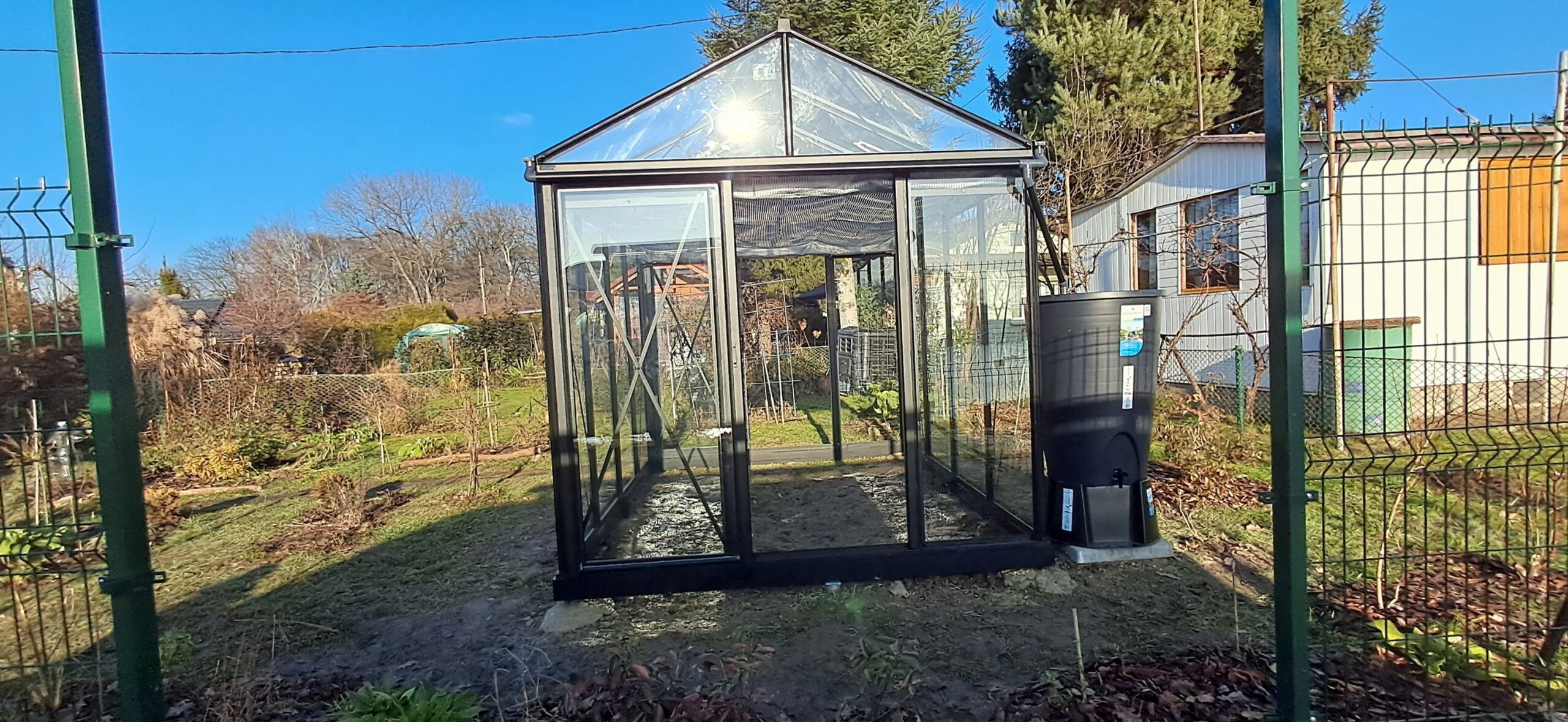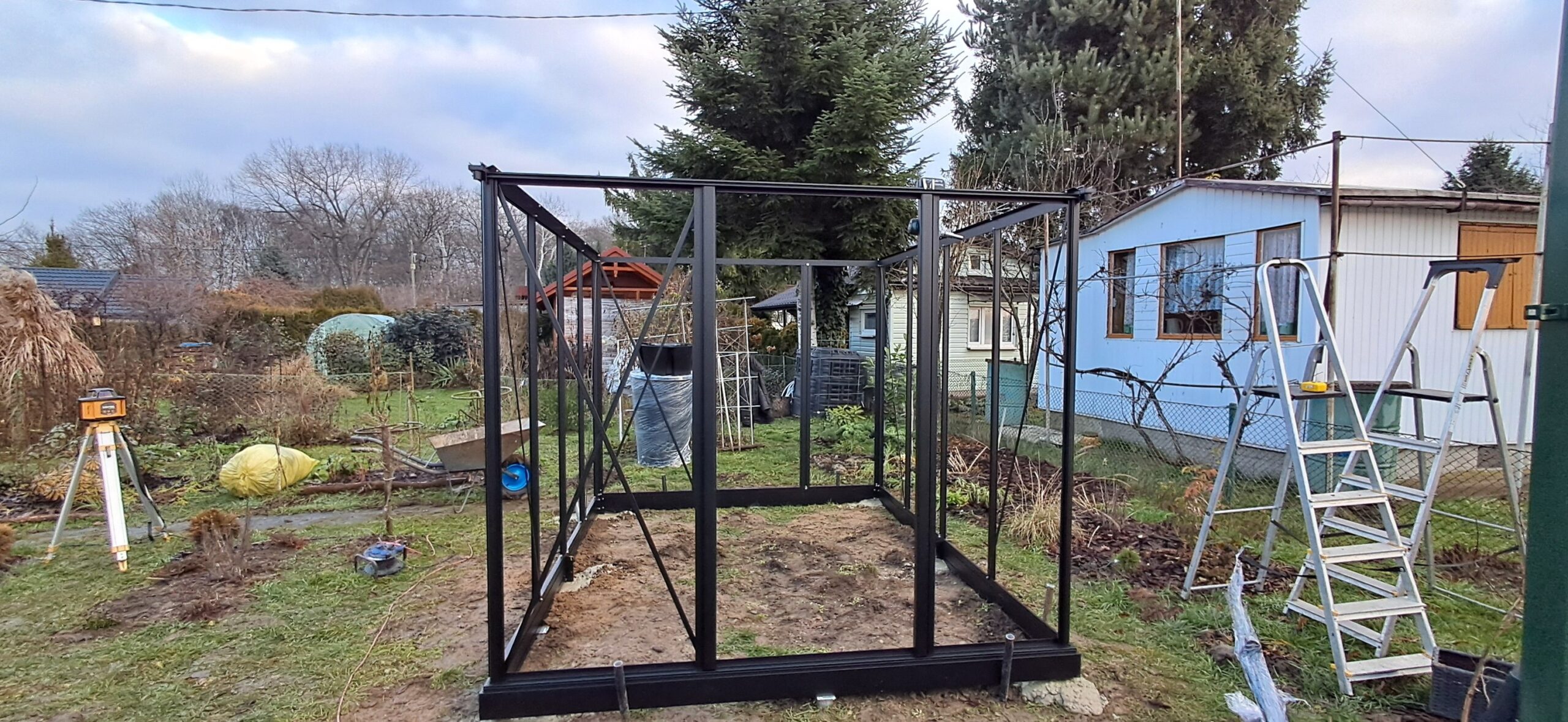 Montaż szklarni ogrodowej Euro Maxi o wymiarach 236cm x 309cm. Aluminiowa konstrukcja w kolorze RAL 9005 – czarny głęboki strukturalny została w całości pokryta szybą hartowaną 4mm. Na dachu zamontowano dwa okna z automatycznym mechanizmem otwierania. Na obu krótszych ścianach pojedyncze drzwi przesuwne o szerokości 84cm. Wewnątrz cztery rzędy linek do uprawy warzyw wysokopiennych oraz kurtyna cieniującą. Woda deszczowa odprowadzana jest do zbiornika o pojemności 260L za pomocą systemu połączonych rur spustowych. Wysokość ścian to 201cm, a wysokość kalenicy 256cm. Miejsce montażu – Kraków w województwie małopolskim.