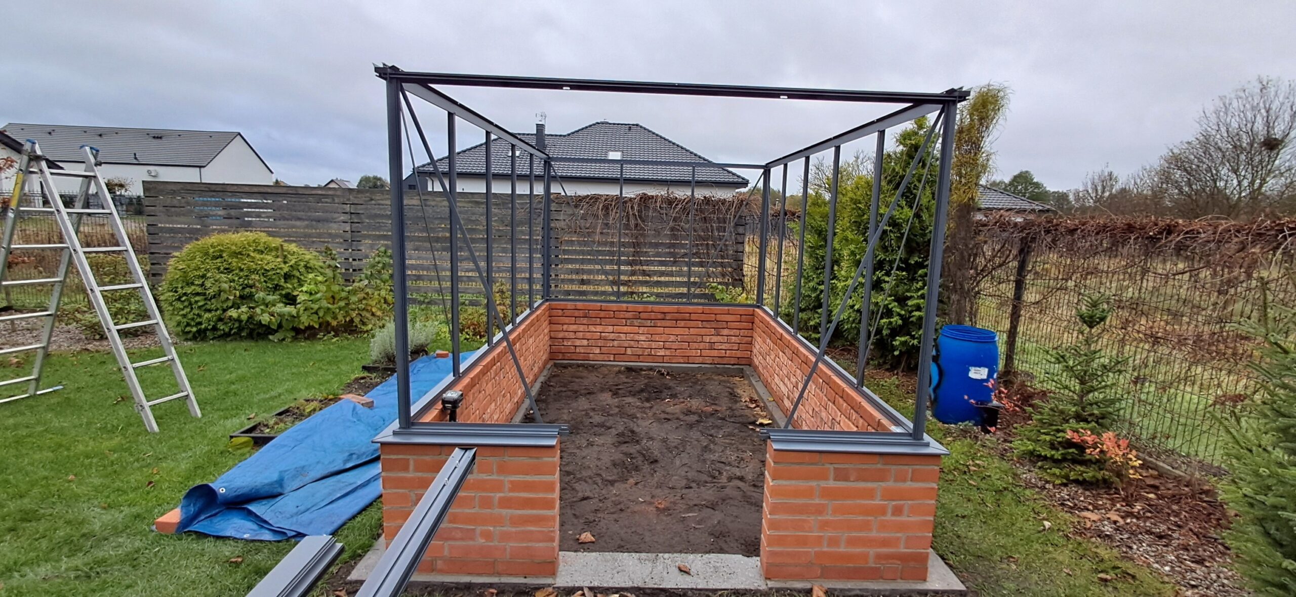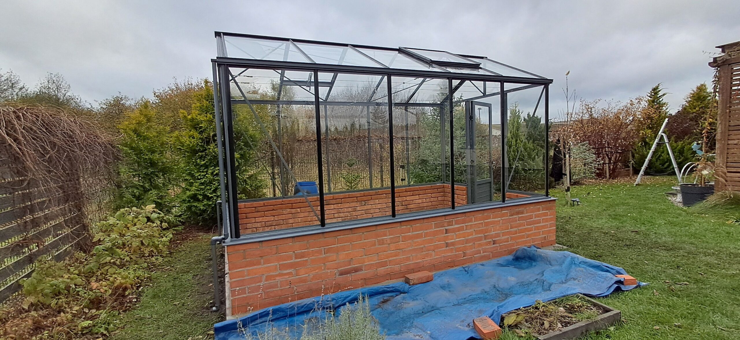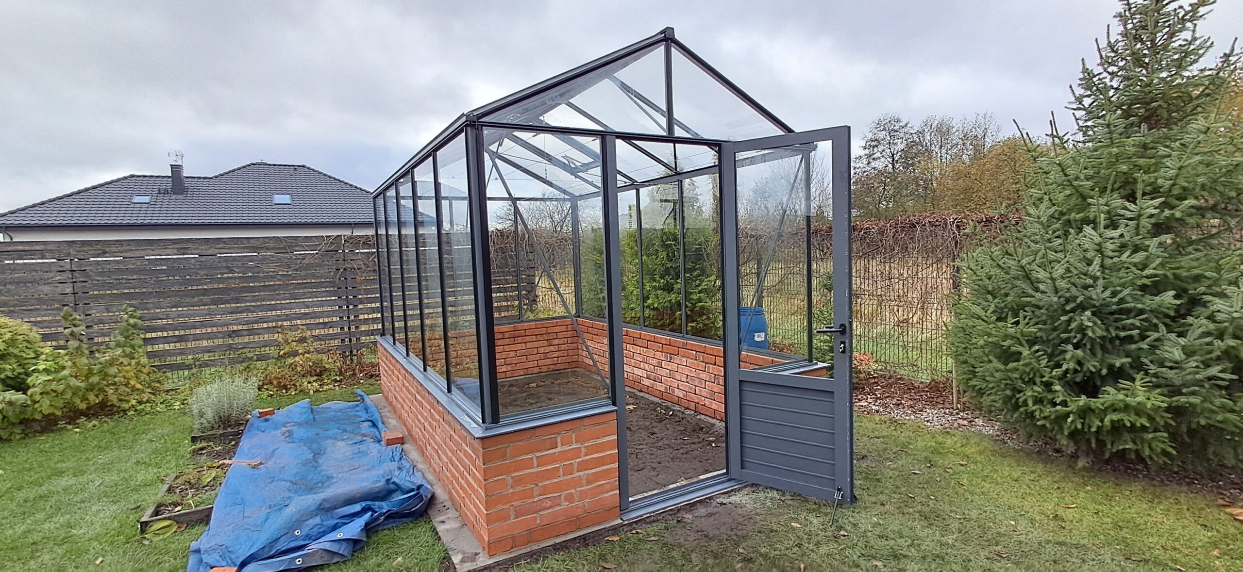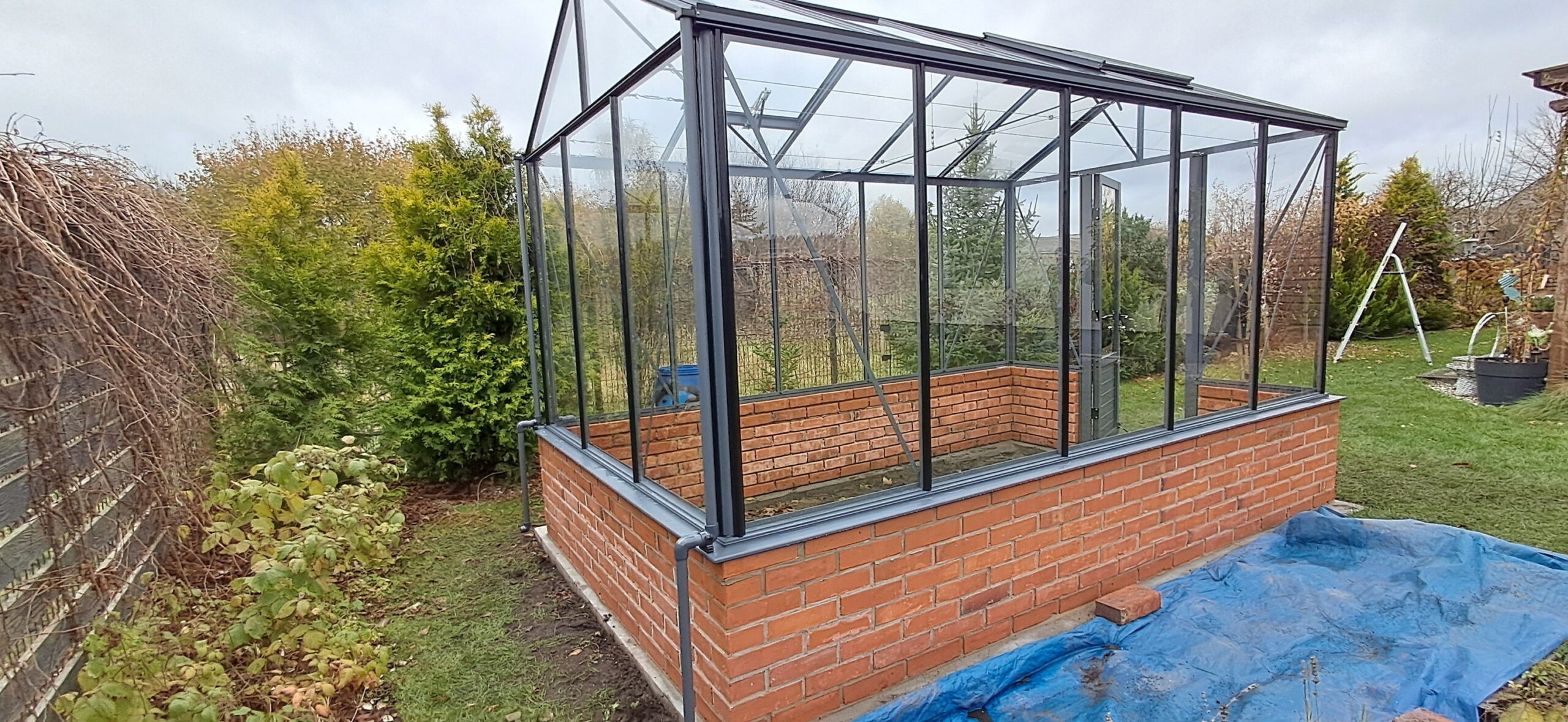Montaż szklarni ogrodowej Euro Maxi On Wall o wymiarach 236cm x 380cm na przygotowanej wcześniej przez klienta podmurówce o wysokości 63cm. Aluminiowa konstrukcja w kolorze RAL 7024 – szary grafitowy została w całości pokryta szybą hartowaną 4mm. Na dachu zamontowano dwa okna z automatycznym mechanizmem otwierania. Na krótszej ścianie pojedyncze drzwi na zawiasach o szerokości 73cm z zamkiem. Wewnątrz cztery rzędy linek do uprawy warzyw wysokopiennych. Wysokość ścian to 212cm, a wysokość kalenicy 269cm. Miejsce montażu – Kruszyn Krajeński w województwie kujawsko-pomorskim.