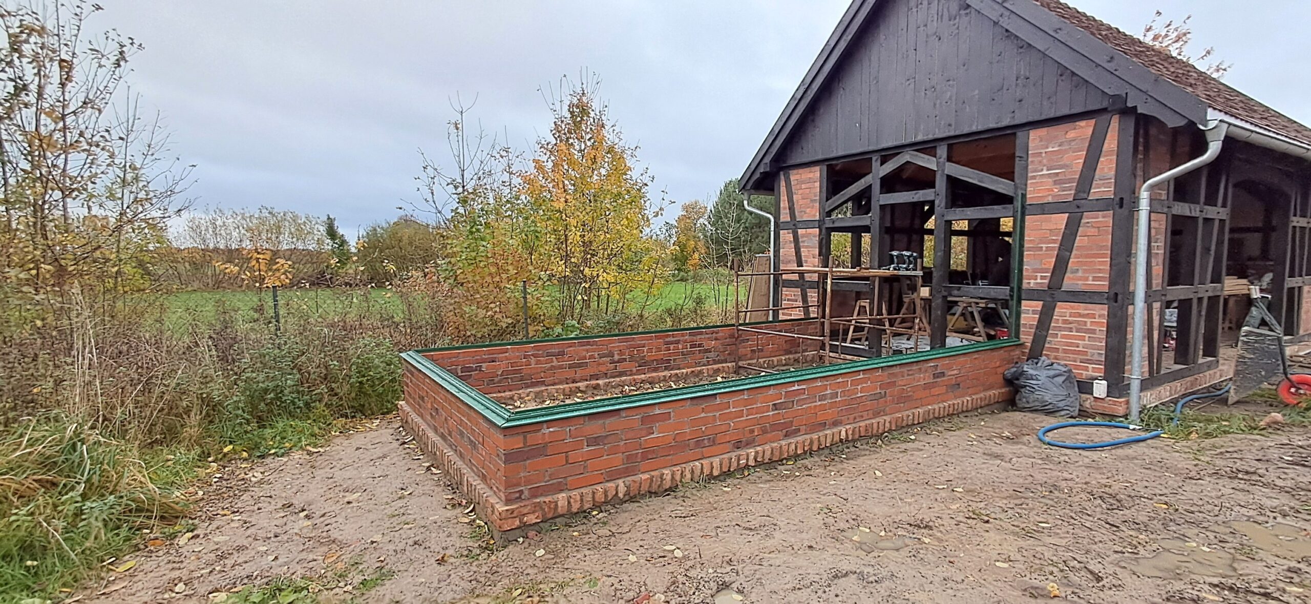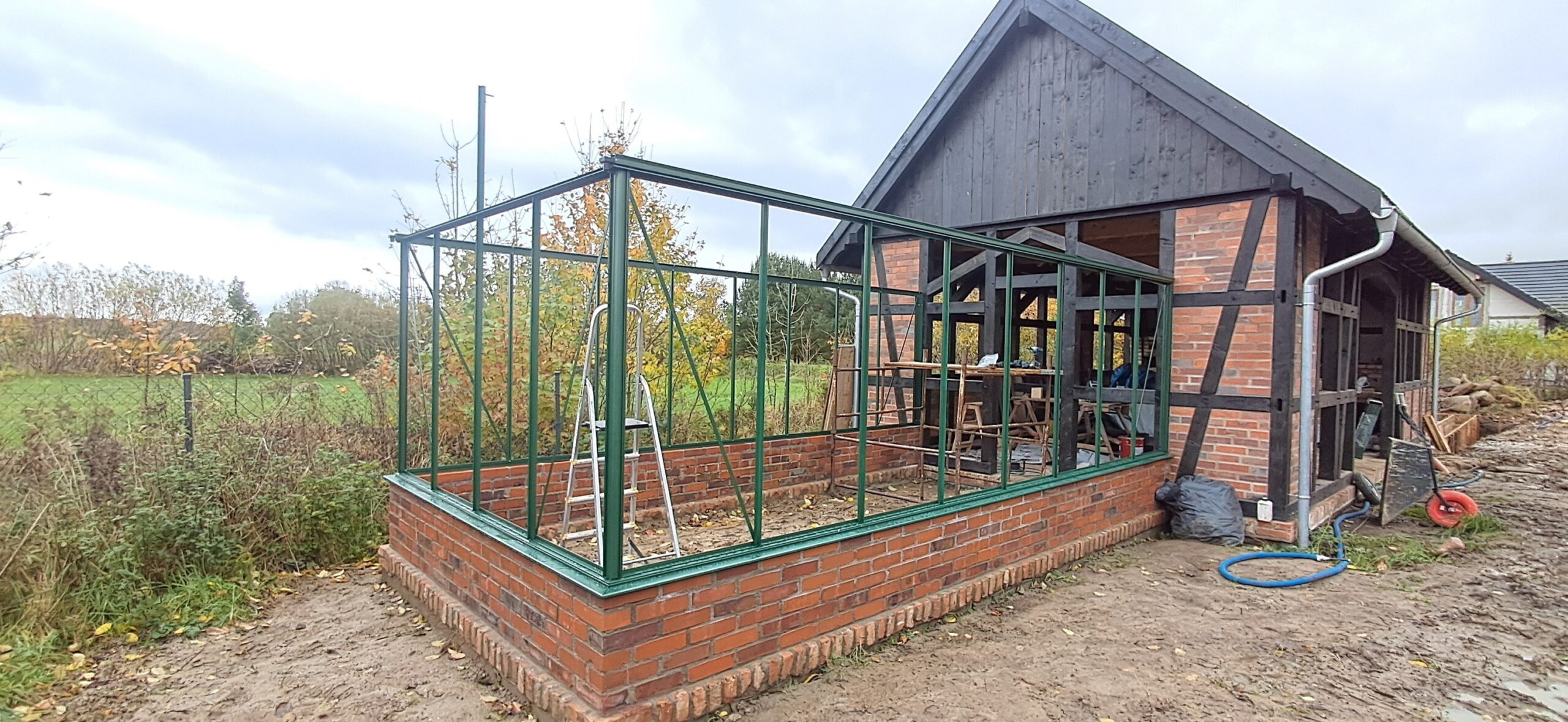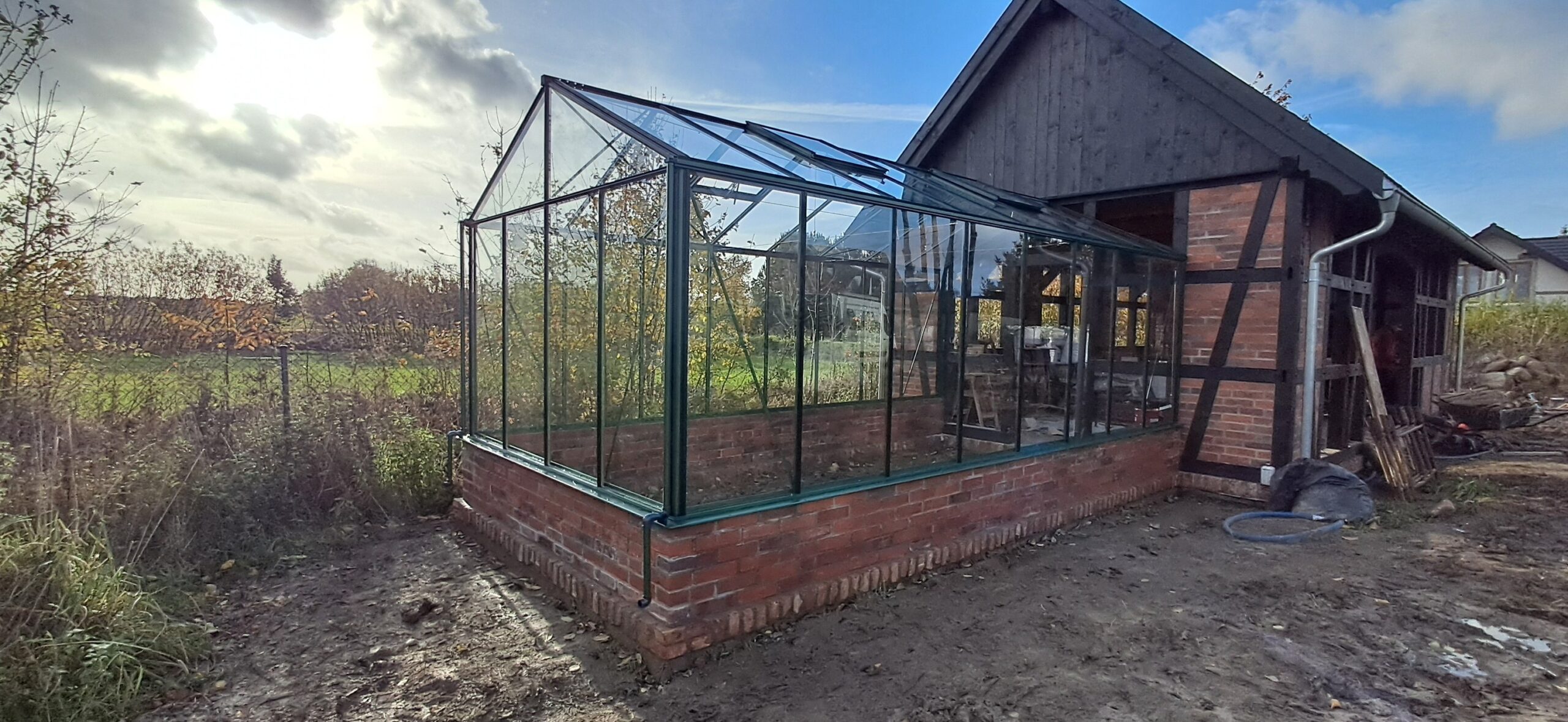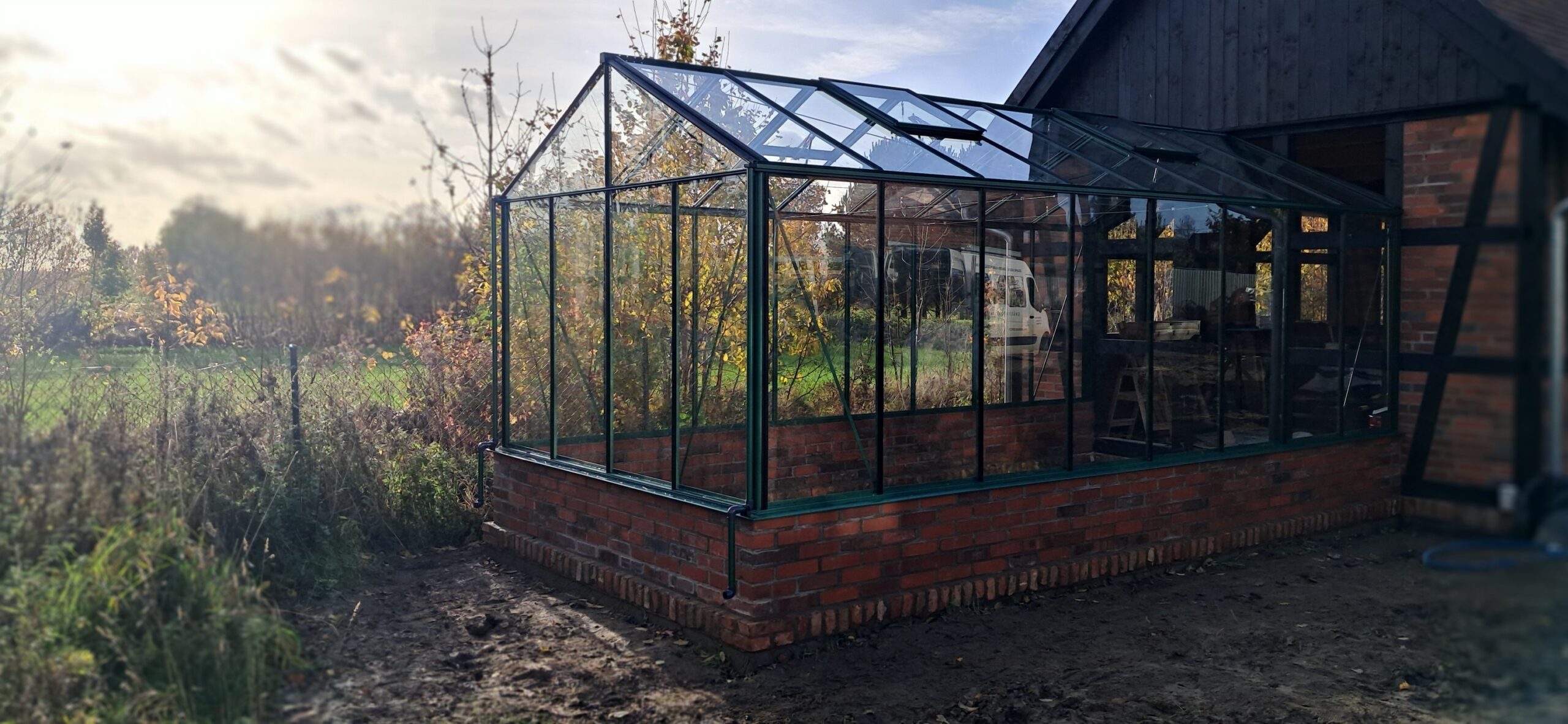 Montaż szklarni ogrodowej Euro Maxi On Wall o wymiarach 309cm x 604cm na podmurówce o wysokości 43cm. Aluminiowa konstrukcja w kolorze RAL 6035 – perłowy zielony została w całości pokryta szybą hartowaną 4mm. Na dachu zamontowano cztery okna z czego dwa z automatycznym mechanizmem otwierania oraz dwa z mechanizmem otwierania Spindel. Wewnątrz cztery rzędy linek do uprawy warzyw wysokopiennych. Wysokość ścian to 212cm, a wysokość kalenicy 284cm. Miejsce montażu – Możdżanowo w województwie pomorskim.