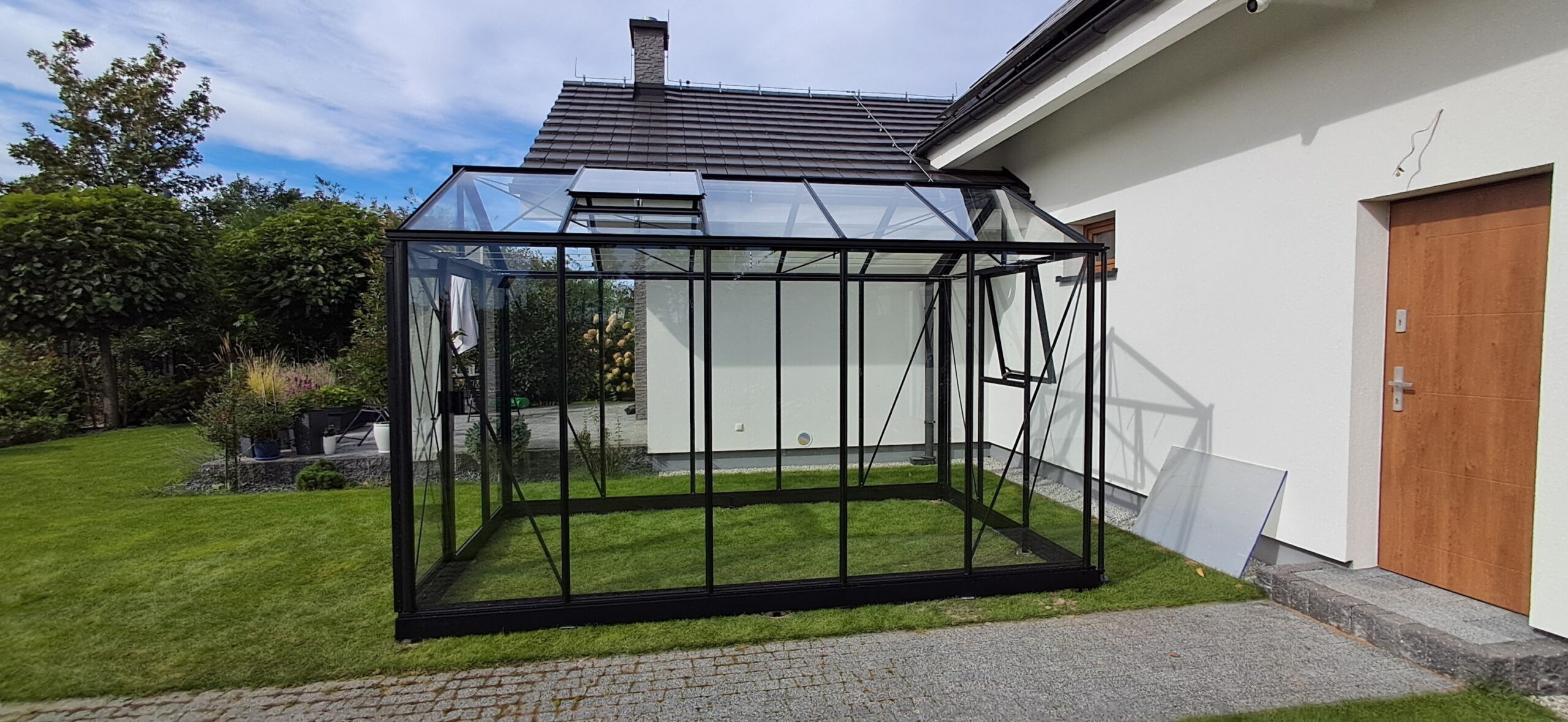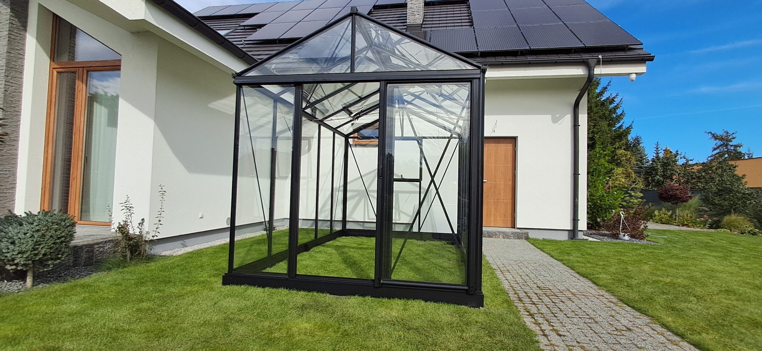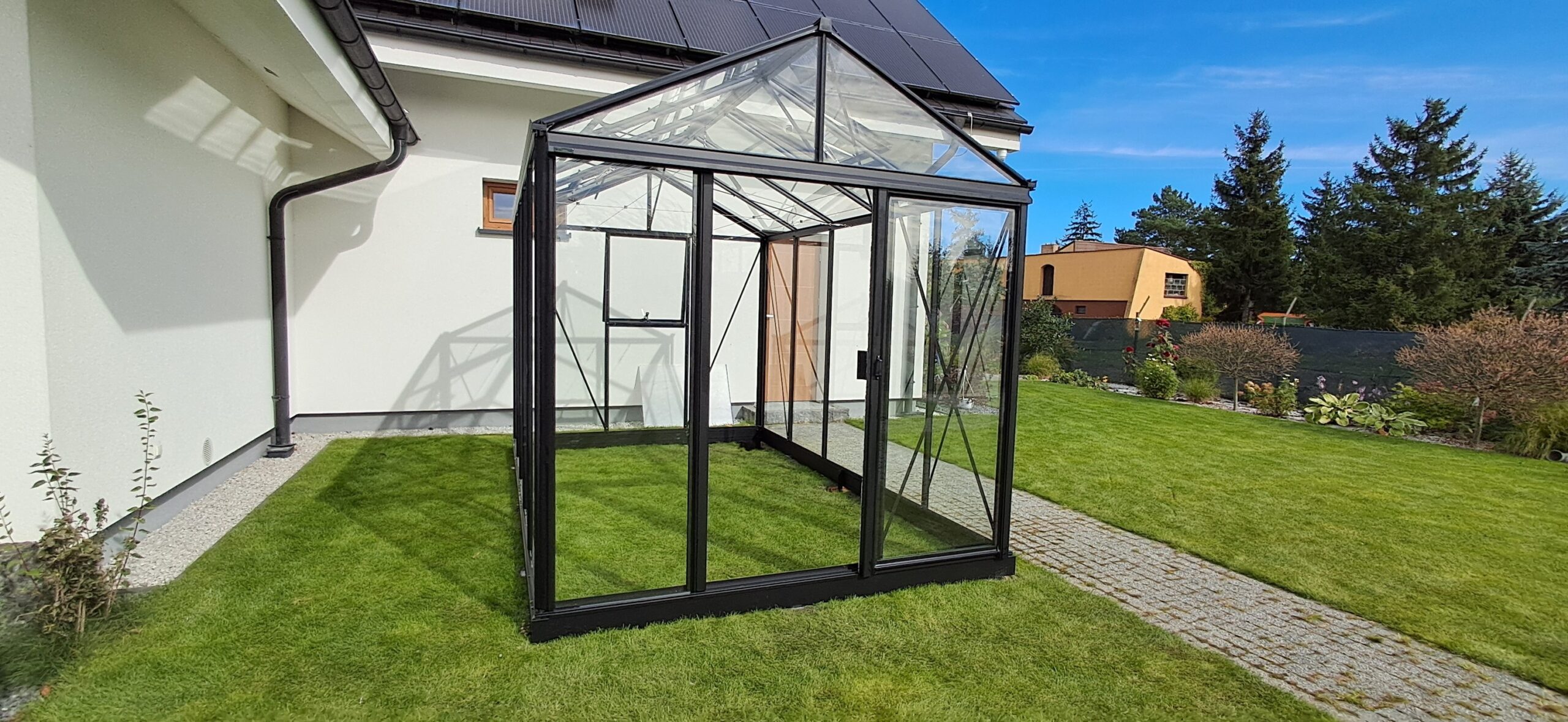 Montaż szklarni ogrodowej Euro Maxi o wymiarach 236cm x 380cm. Aluminiowa konstrukcja w kolorze RAL 9005 – czarny głęboki strukturalny została w całości pokryta szybą hartowaną 4mm. Na dachu zamontowano dwa okna z automatycznym mechanizmem otwierania. Na krótszej ścianie pojedyncze drzwi przesuwne o szerokości 84cm. Na przeciwnej ścianie okno ścienne uchylne z systemem AXA-FLEX. Wewnątrz cztery rzędy linek do uprawy warzyw wysokopiennych. Wysokość ścian to 201cm, a wysokość kalenicy 256cm. Miejsce montażu – Pobiedziska w województwie wielkopolskim.