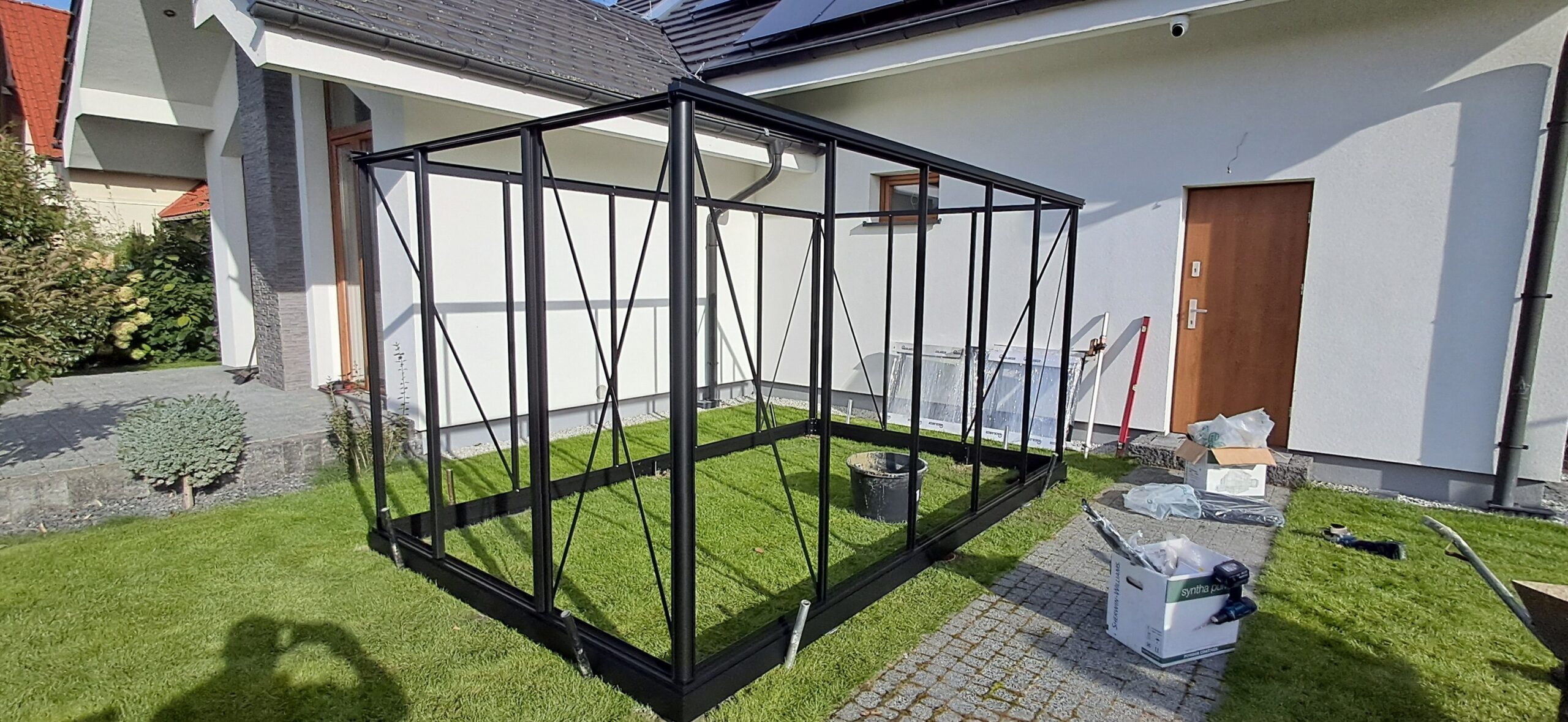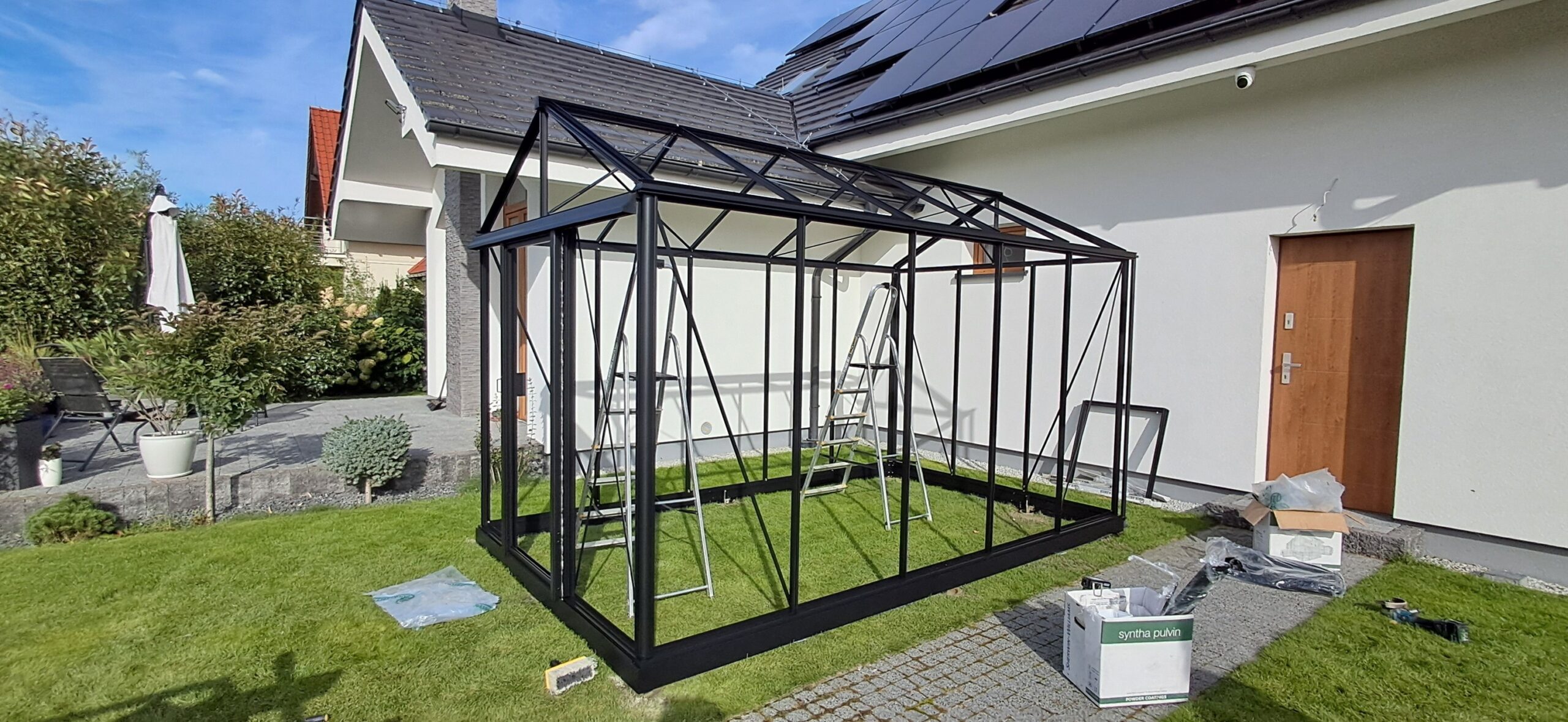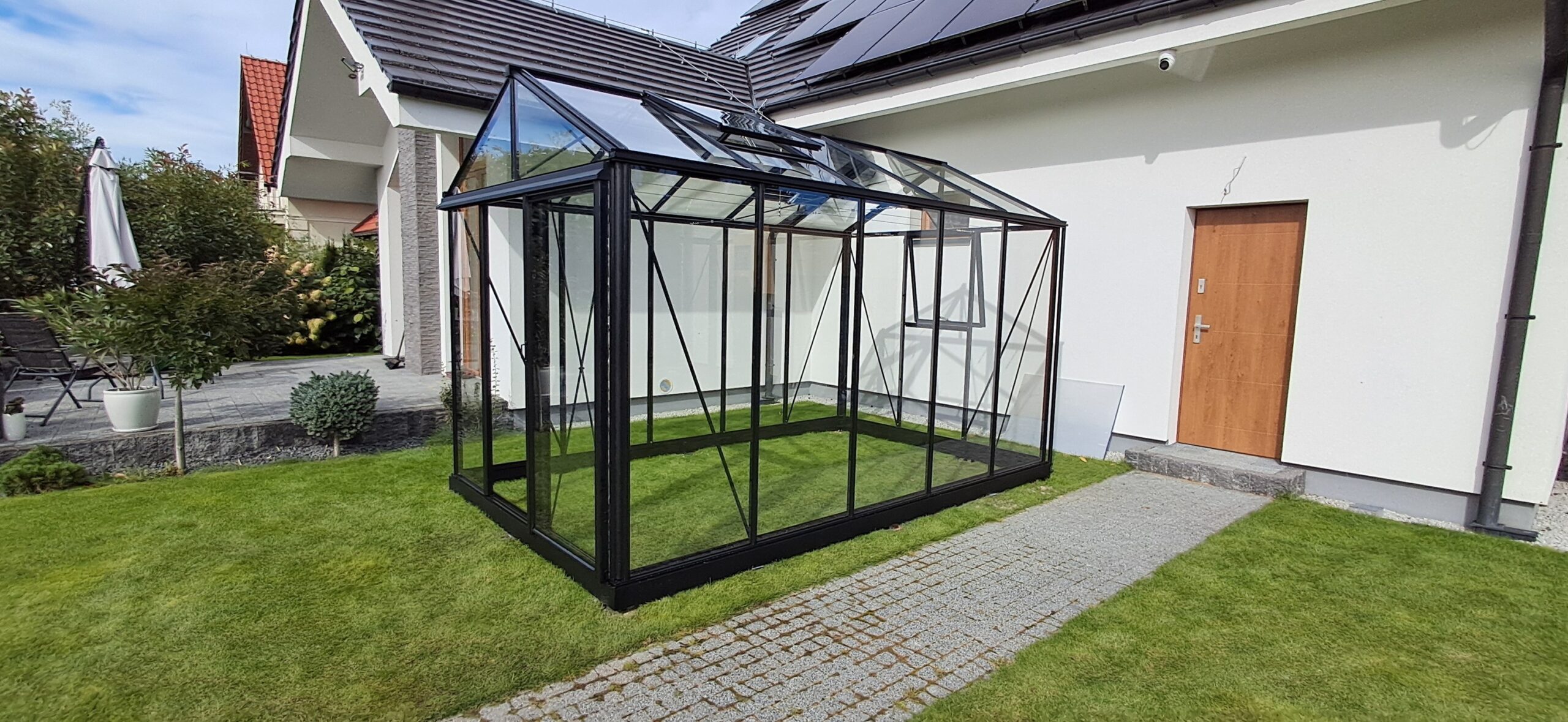 Montaż szklarni ogrodowej Euro Maxi o wymiarach 236cm x 380cm. Aluminiowa konstrukcja w kolorze RAL 9005 – czarny głęboki strukturalny została w całości pokryta szybą hartowaną 4mm. Na dachu zamontowano dwa okna z automatycznym mechanizmem otwierania. Na krótszej ścianie pojedyncze drzwi przesuwne o szerokości 84cm. Na przeciwnej ścianie okno ścienne uchylne z systemem AXA-FLEX. Wewnątrz cztery rzędy linek do uprawy warzyw wysokopiennych. Wysokość ścian to 201cm, a wysokość kalenicy 256cm. Miejsce montażu – Pobiedziska w województwie wielkopolskim.