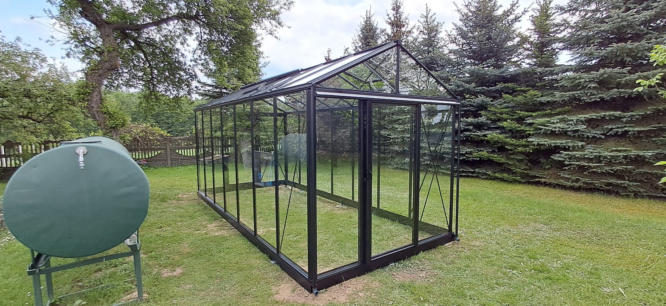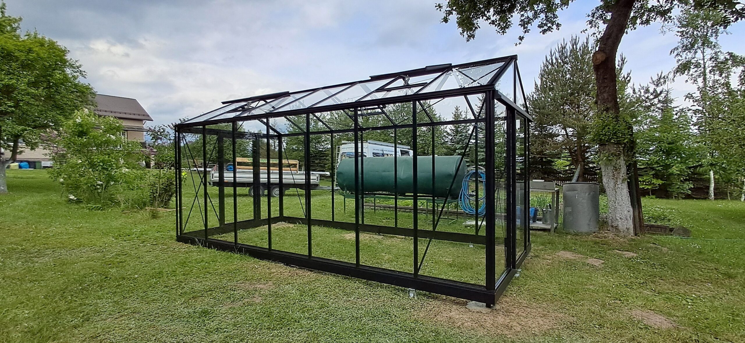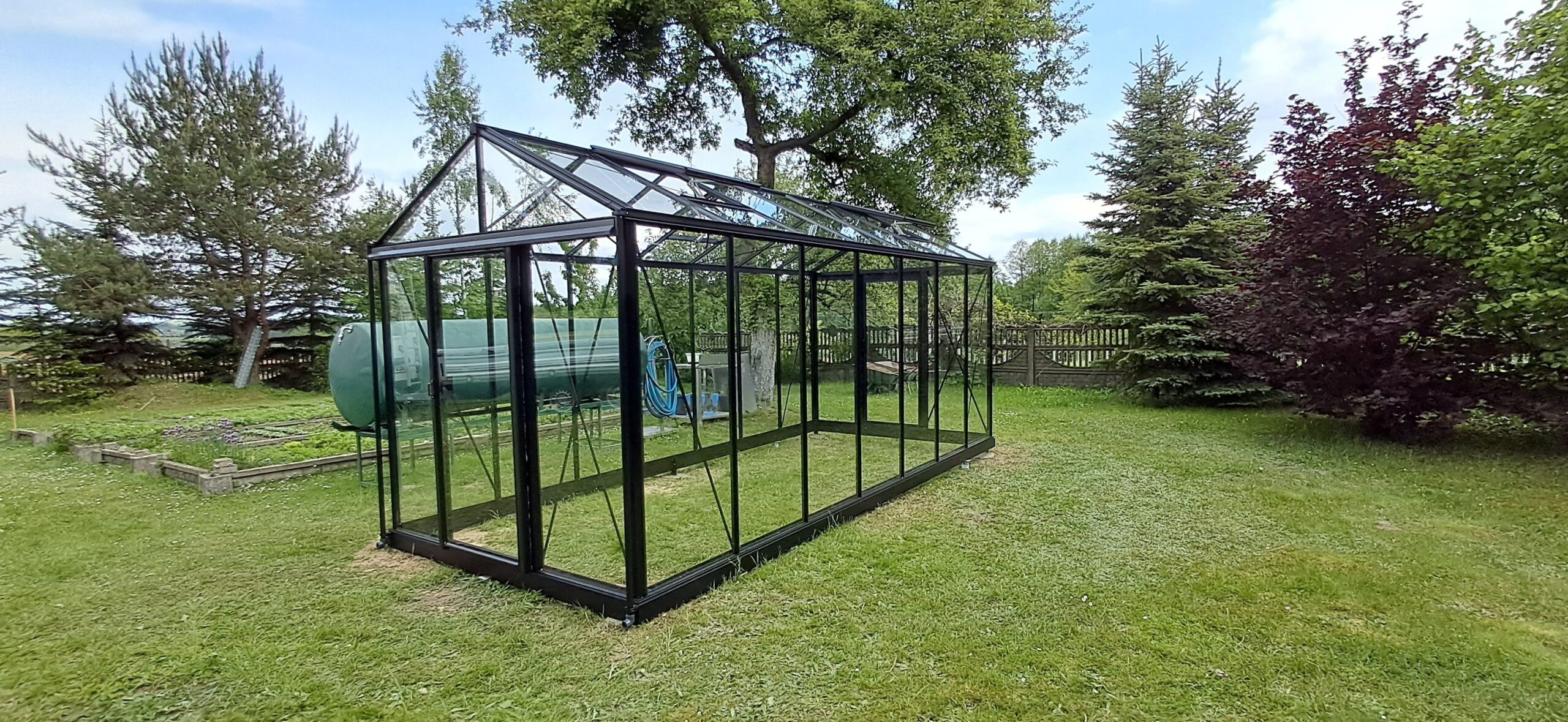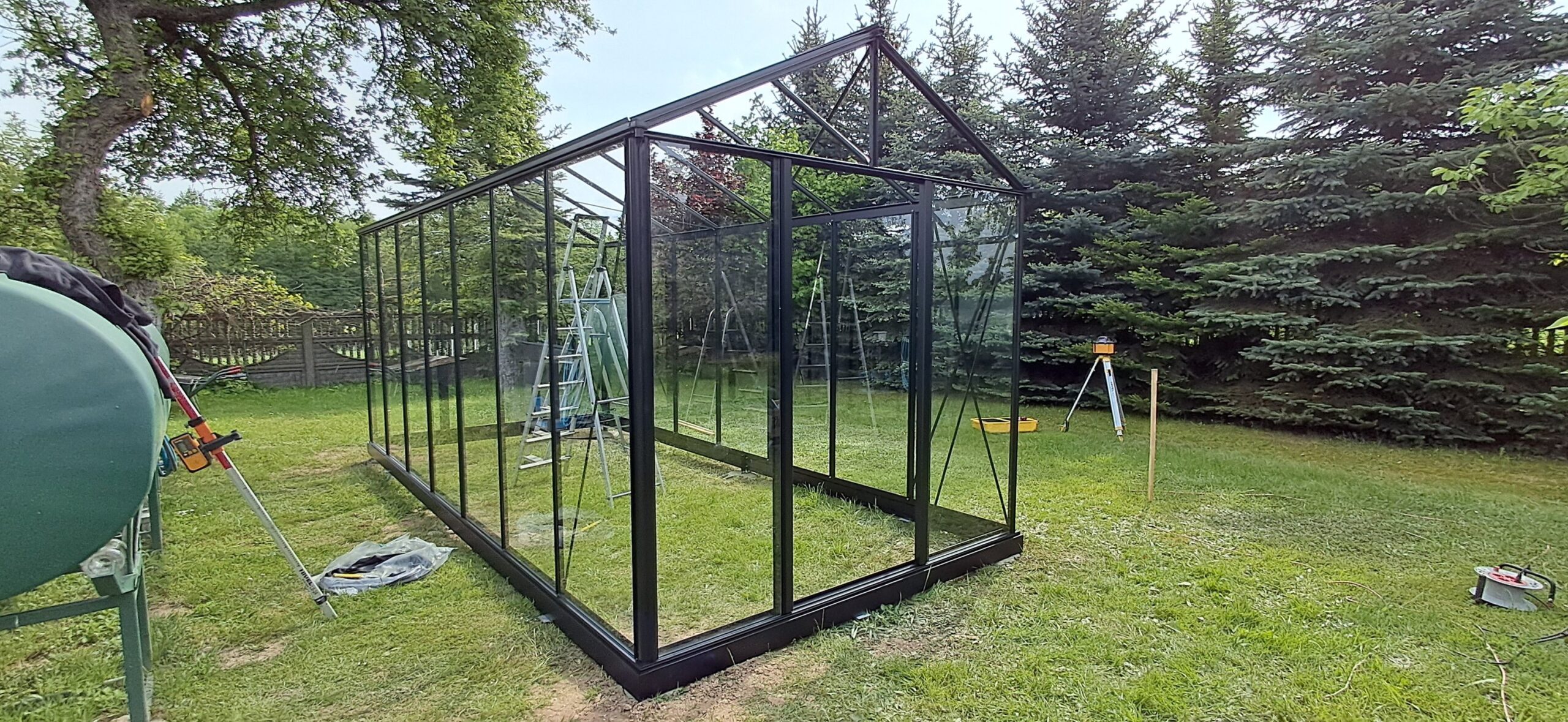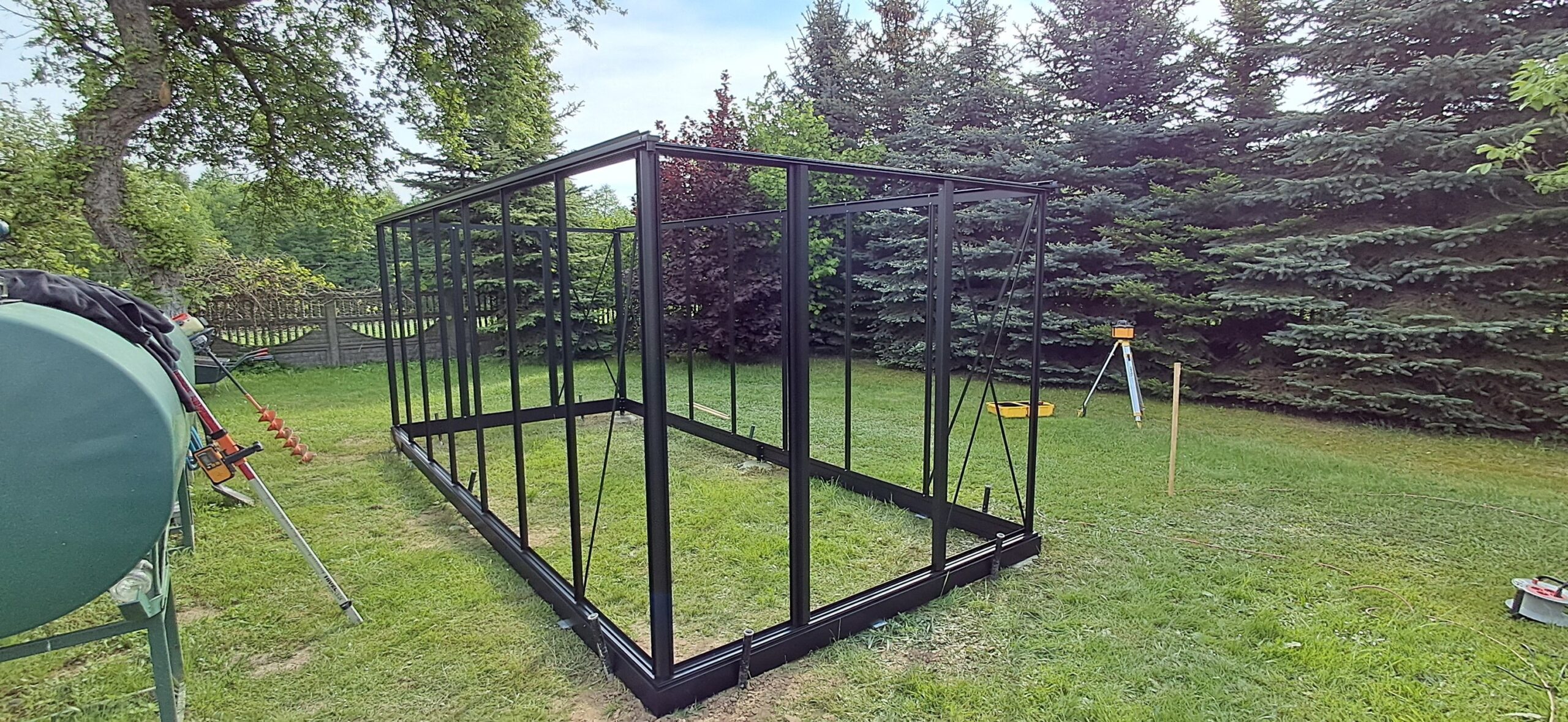 Montaż szklarni ogrodowej Euro Maxi o wymiarach 236cm x 530cm. Aluminiowa konstrukcja w kolorze RAL 9005 – czarny głęboki została w całości pokryta szybą hartowaną 4mm. Na dachu zamontowano trzy okna z automatycznym mechanizmem otwierania. Na obu krótszych ścianach pojedyncze drzwi przesuwne o szerokości 84cm. Wysokość ścian to 201cm, a wysokość kalenicy 256cm. Miejsce montażu – Pustkowie Lgockie.