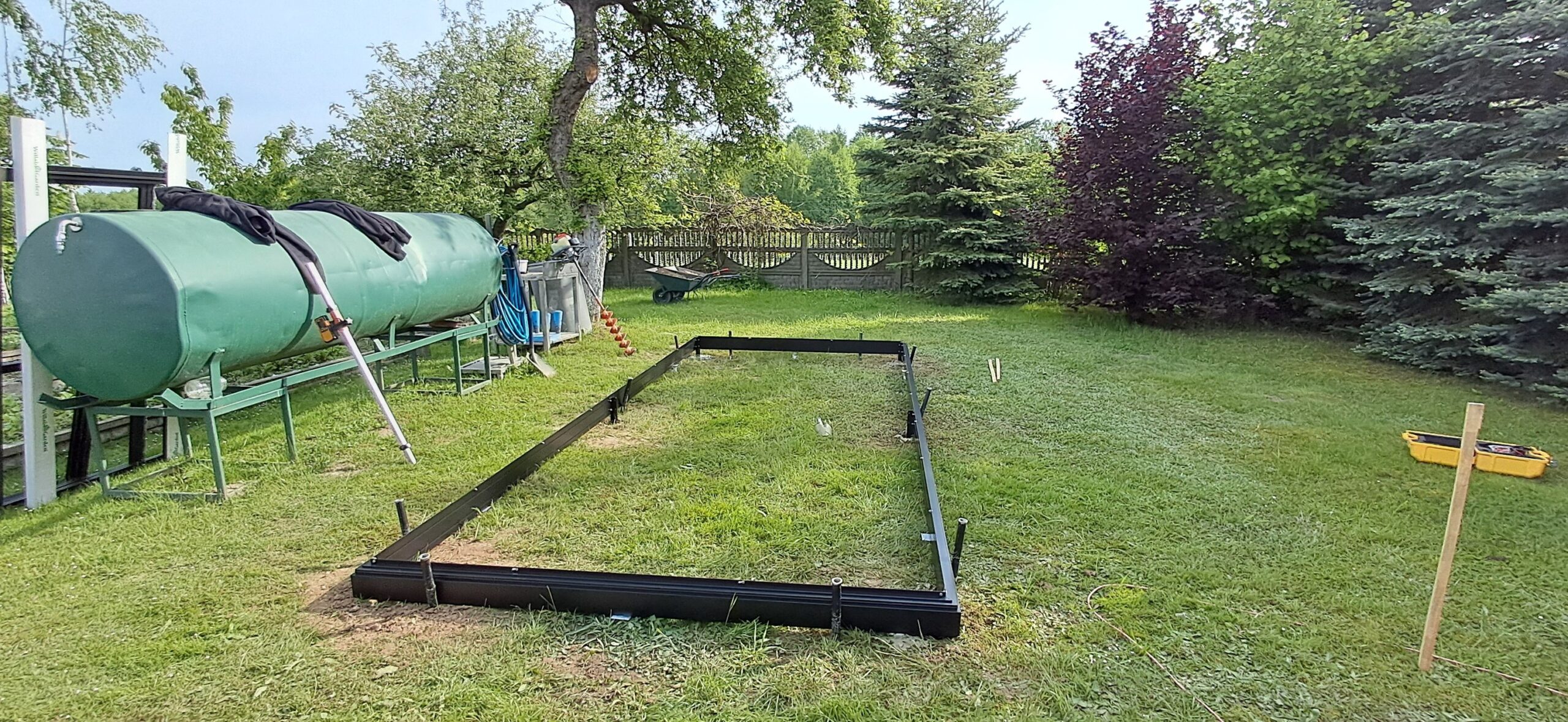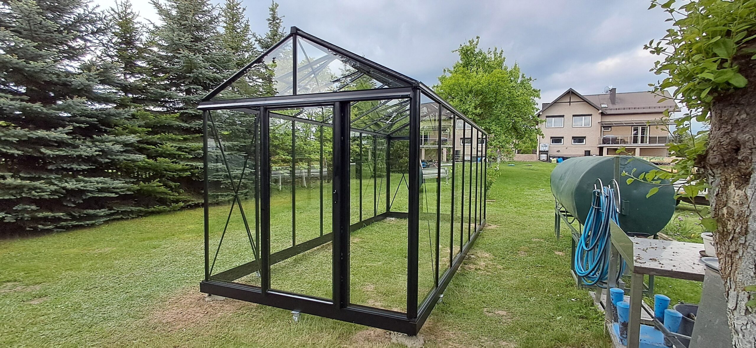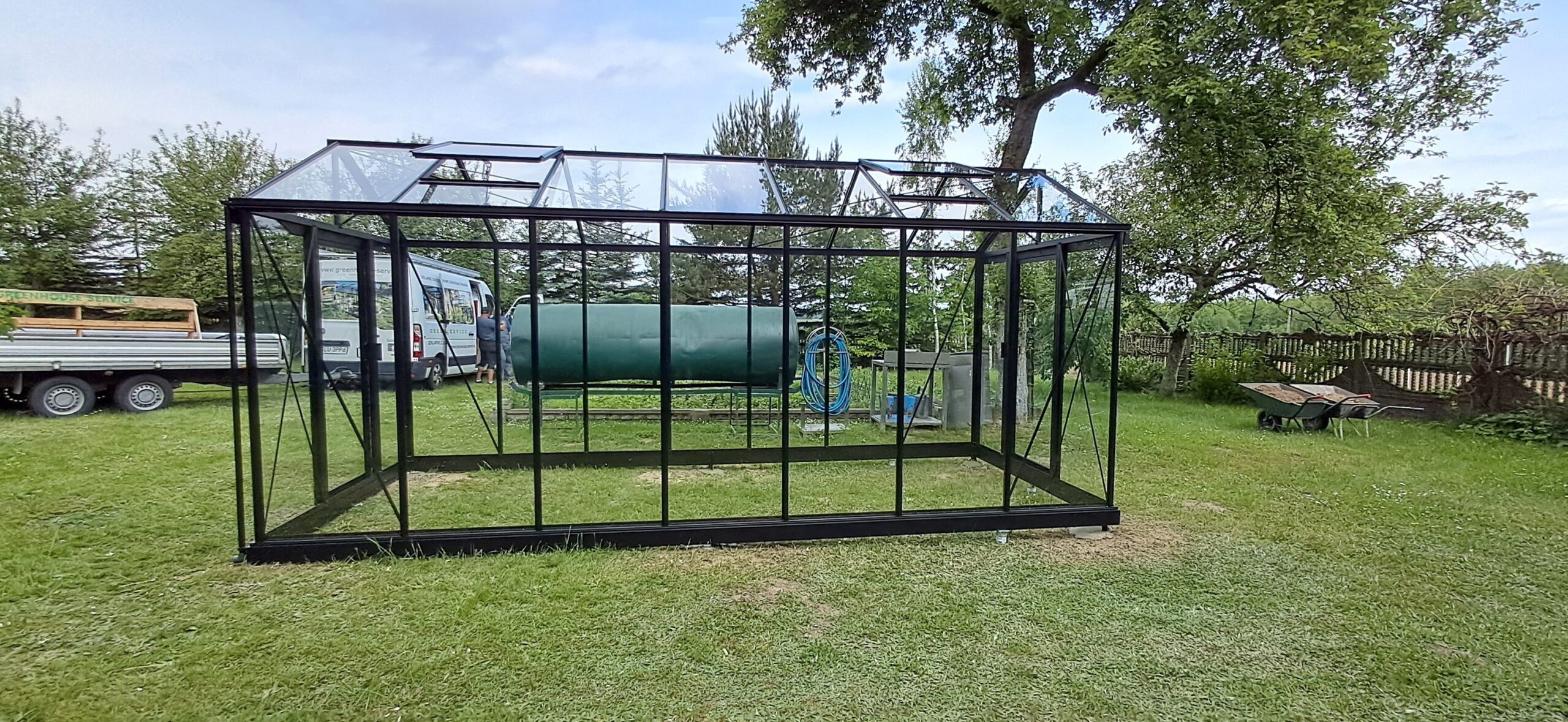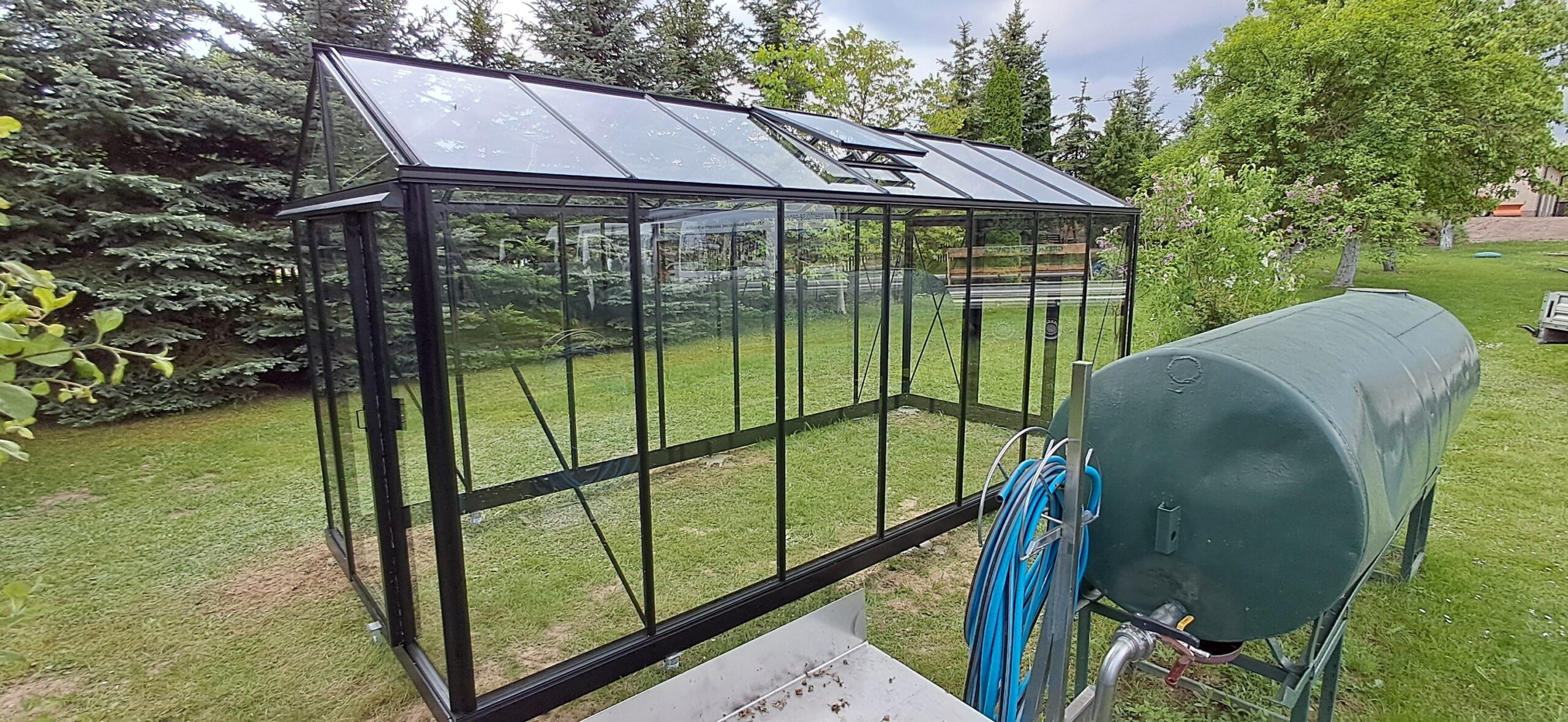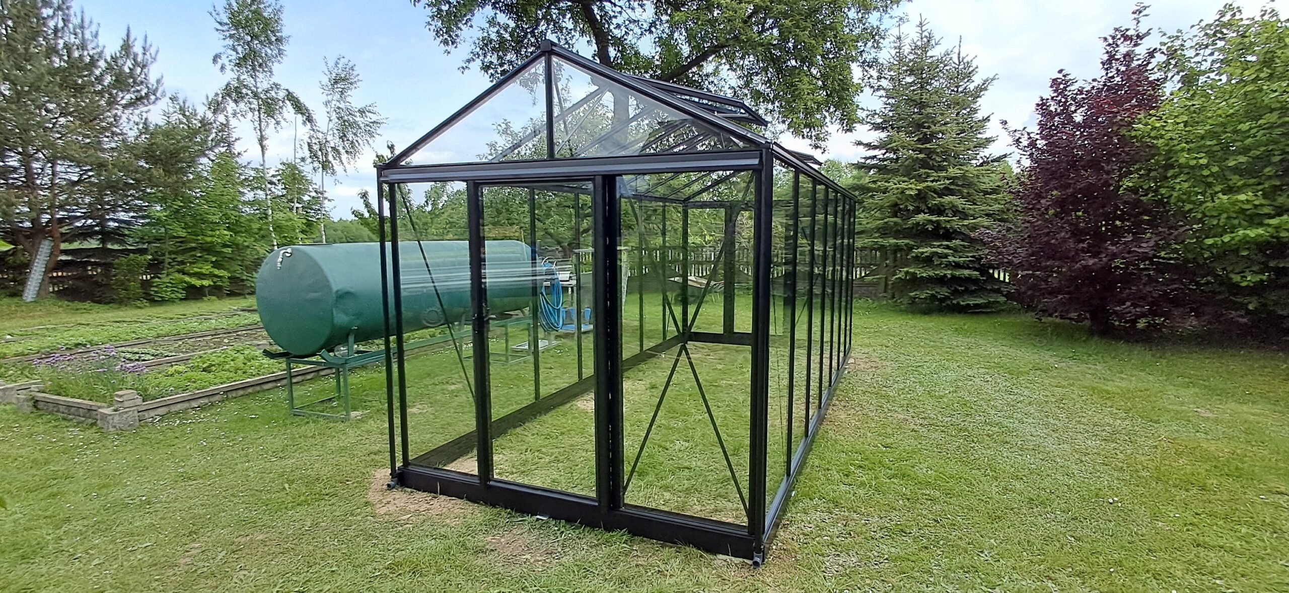 Montaż szklarni ogrodowej Euro Maxi o wymiarach 236cm x 530cm. Aluminiowa konstrukcja w kolorze RAL 9005 – czarny głęboki została w całości pokryta szybą hartowaną 4mm. Na dachu zamontowano trzy okna z automatycznym mechanizmem otwierania. Na obu krótszych ścianach pojedyncze drzwi przesuwne o szerokości 84cm. Wysokość ścian to 201cm, a wysokość kalenicy 256cm. Miejsce montażu – Pustkowie Lgockie.
