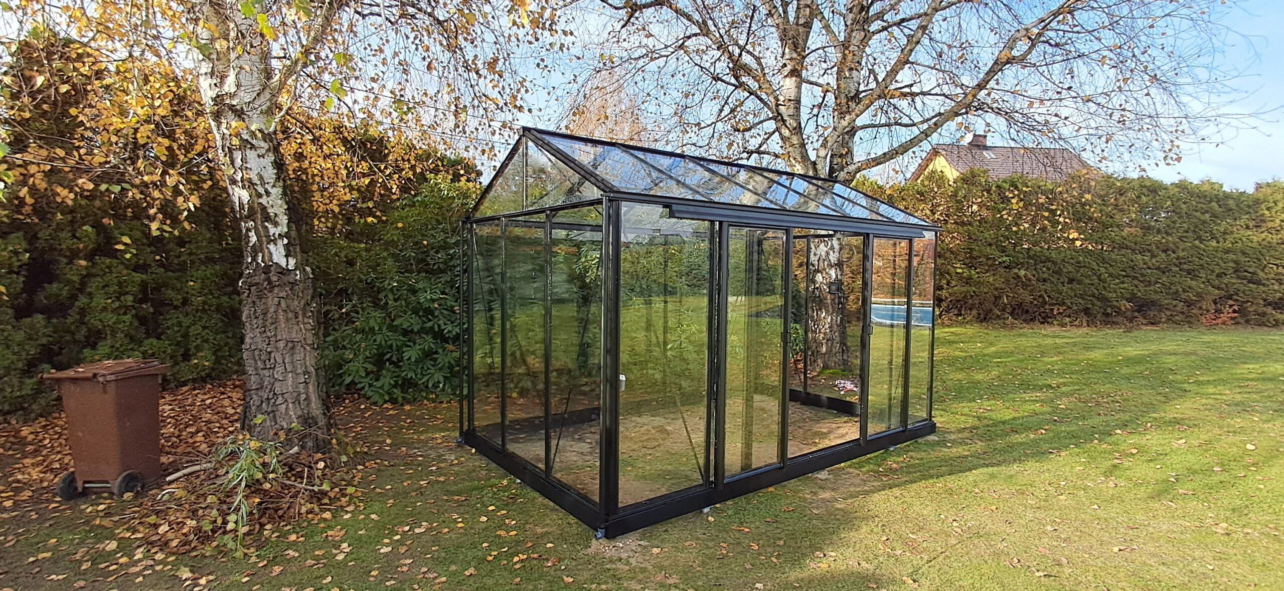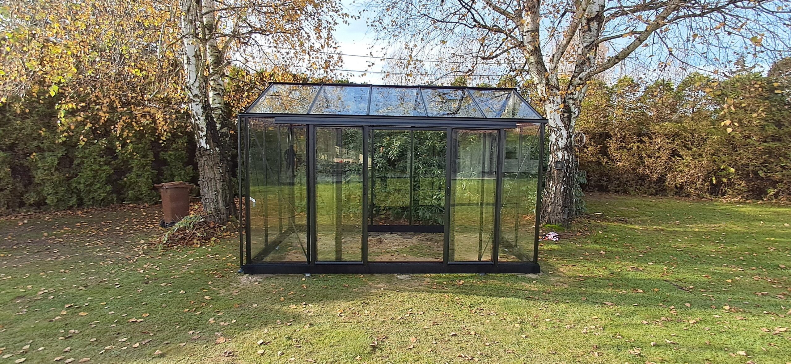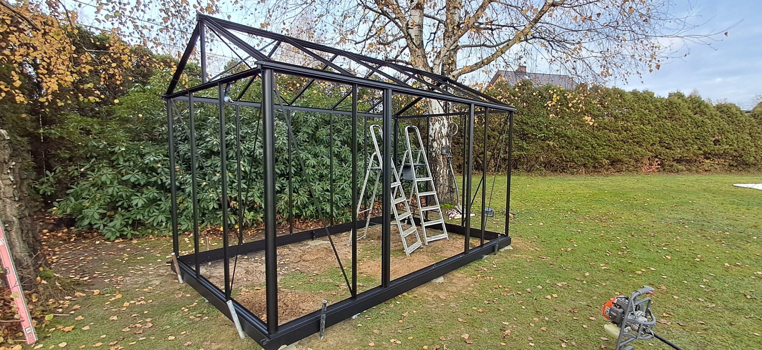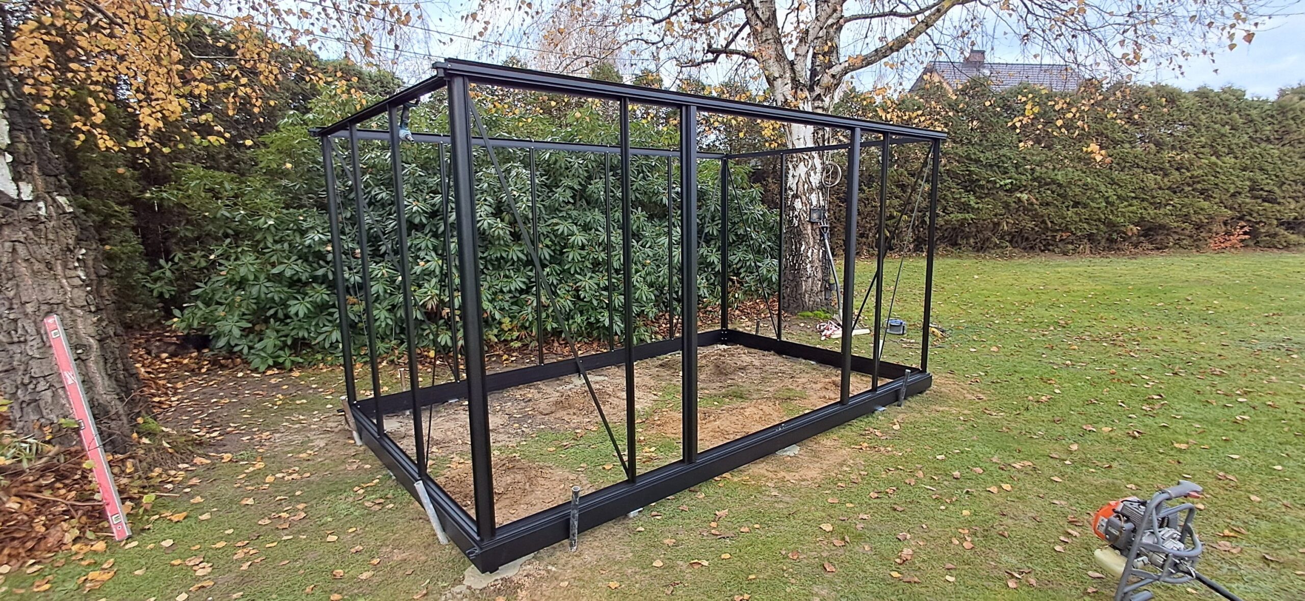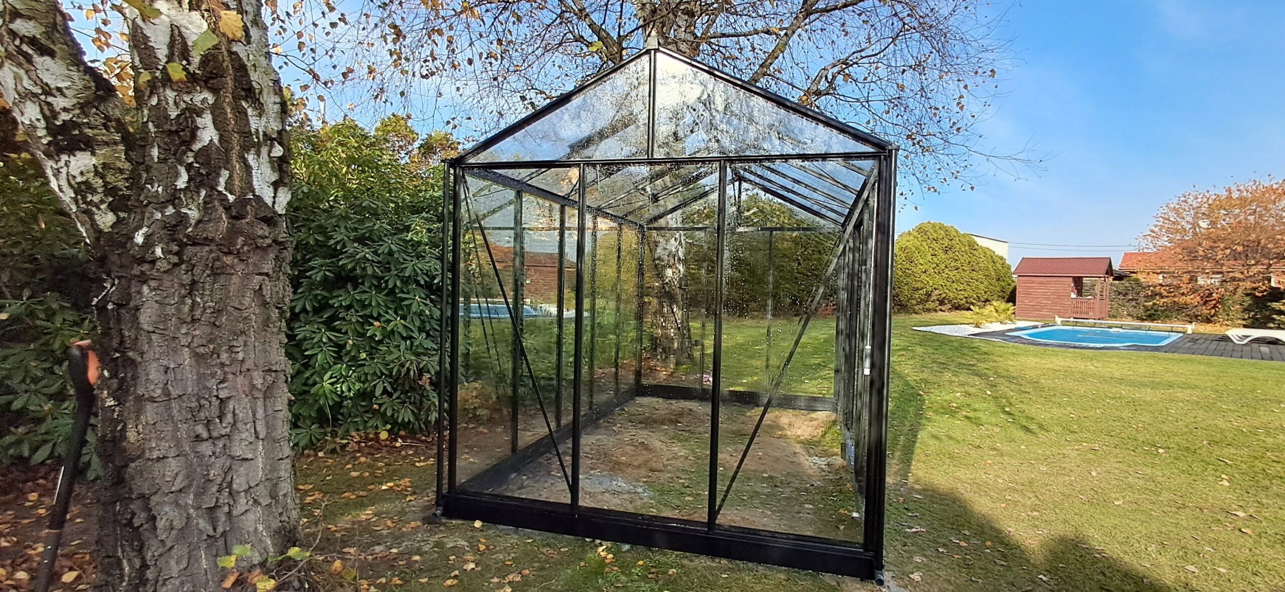 Montaż szklarni ogrodowej Euro Maxi o wymiarach 236cm x 380cm. Aluminiowa konstrukcja w kolorze RAL 9005 – czarny głęboki strukturalny została w całości pokryta szybą hartowaną 4mm. Na dachu zamontowano dwa okna z mechanizmem otwierania Spindel. Na dłuższej ścianie podwójne drzwi przesuwne o szerokości 2x70cm. Wysokość ścian to 201cm, a wysokość kalenicy 256cm. Miejsce montażu – Rybnik w województwie śląskim.