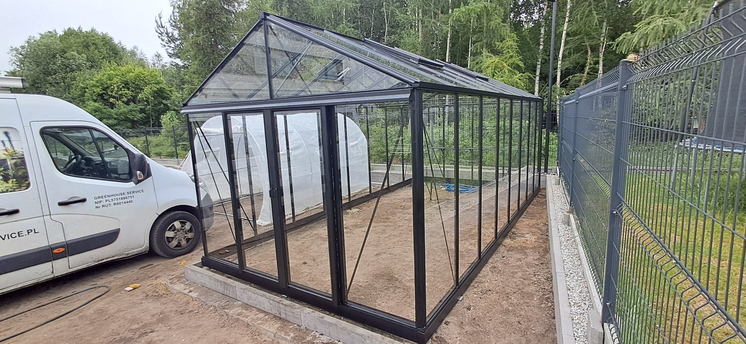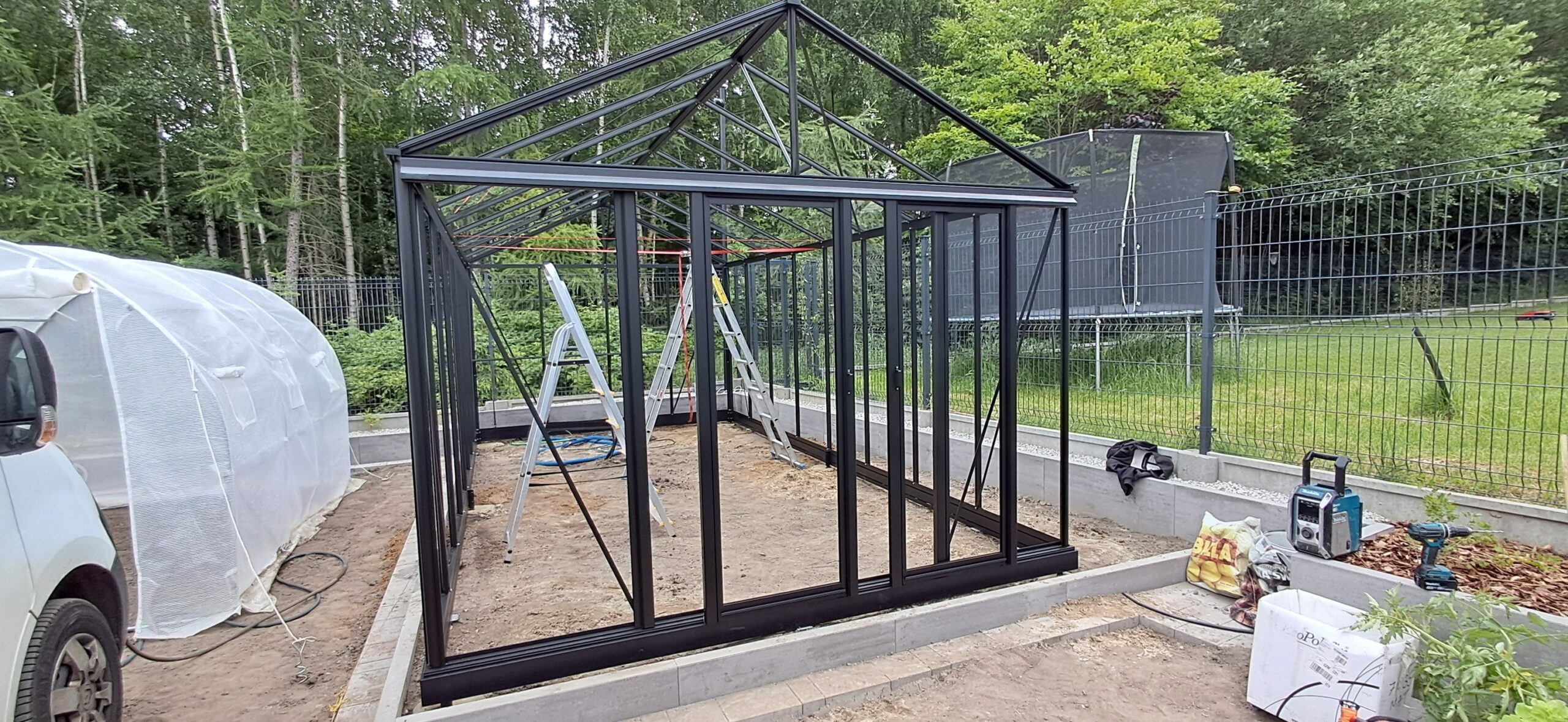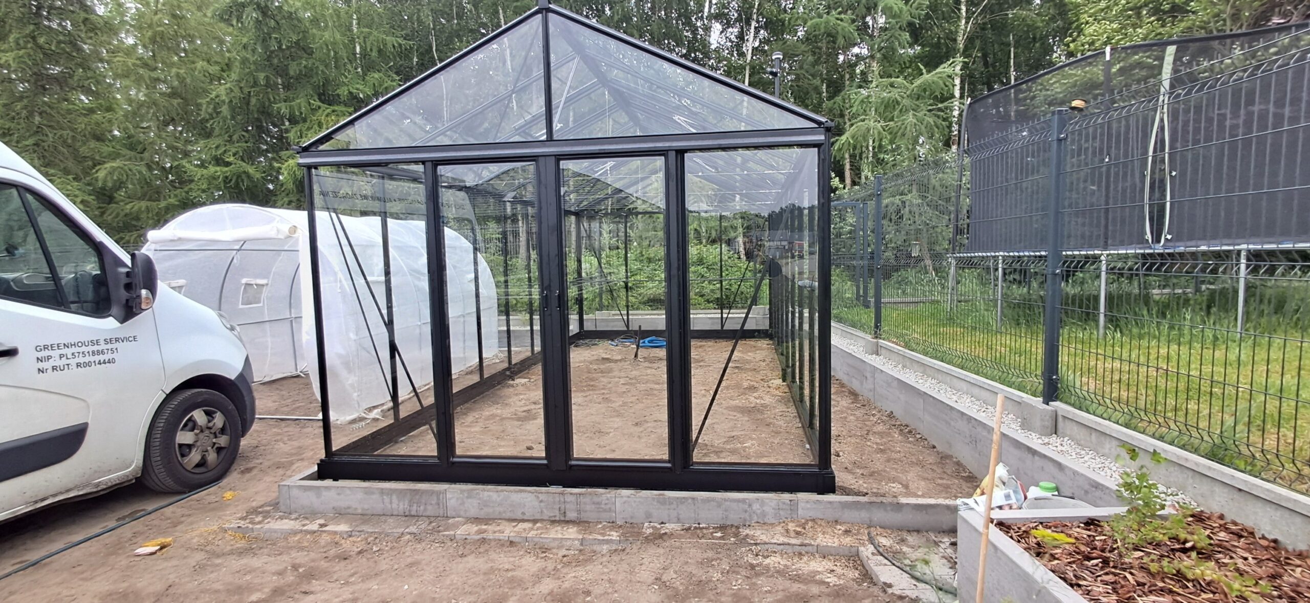 Montaż szklarni ogrodowej Euro Maxi o wymiarach 309cm x 604cm. Aluminiowa konstrukcja w kolorze RAL 9005 – czarny głęboki strukturalny została w całości pokryta szybą hartowaną 4mm. Na dachu zamontowano cztery okna z automatycznym mechanizmem otwierania. Na krótszej ścianie podwójne drzwi przesuwne o szerokości 2x70cm. Wewnątrz cztery rzędy linek do uprawy warzyw wysokopiennych oraz trzyelementowa półka o długości 309cm. Wysokość ścian to 201cm, a wysokość kalenicy 270cm. Miejsce montażu – Wieszowa w województwie śląskim.
