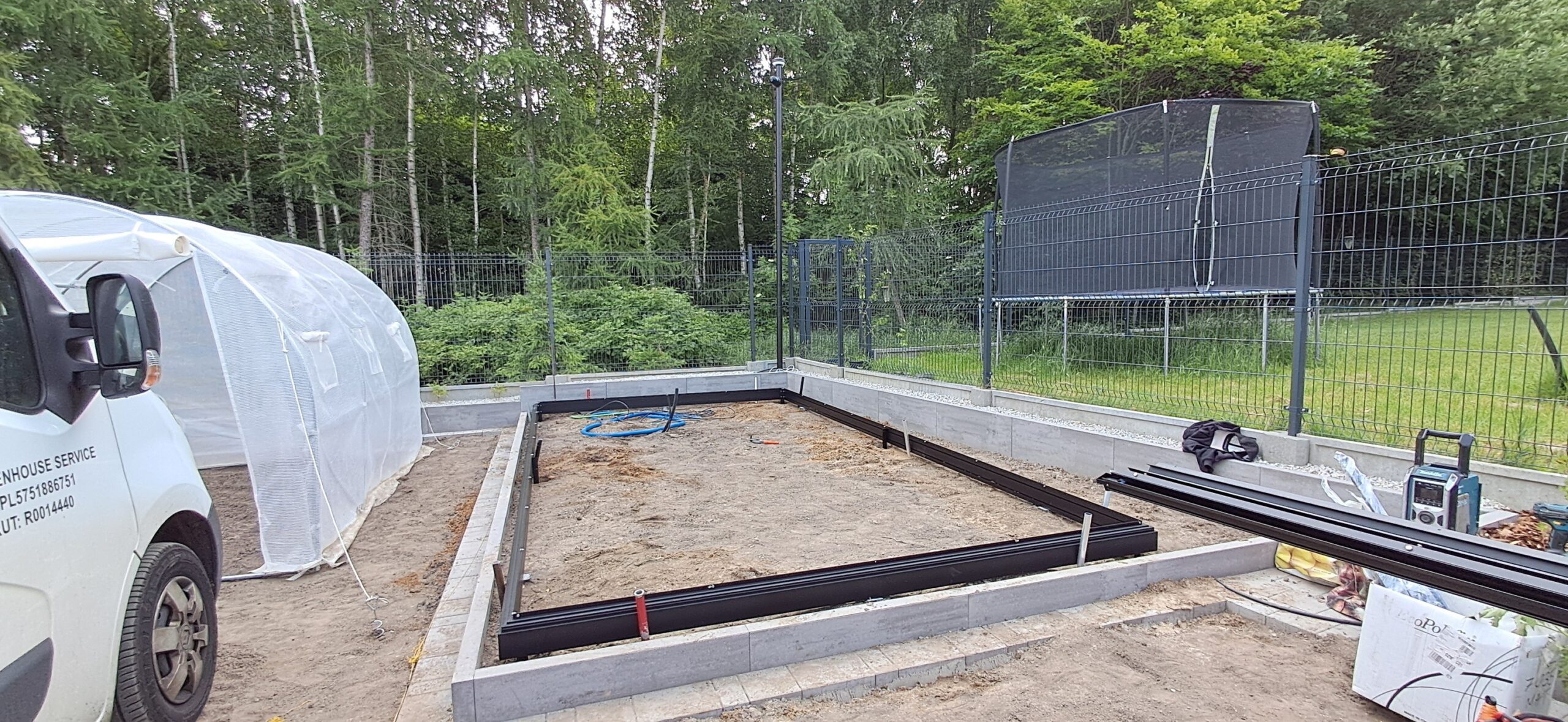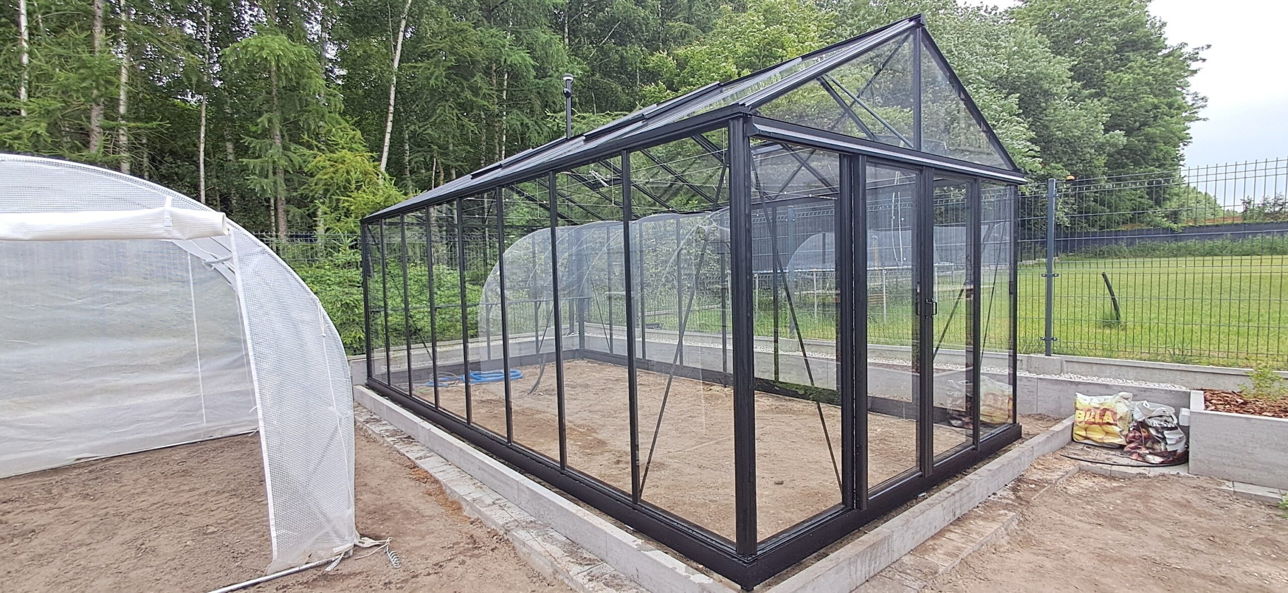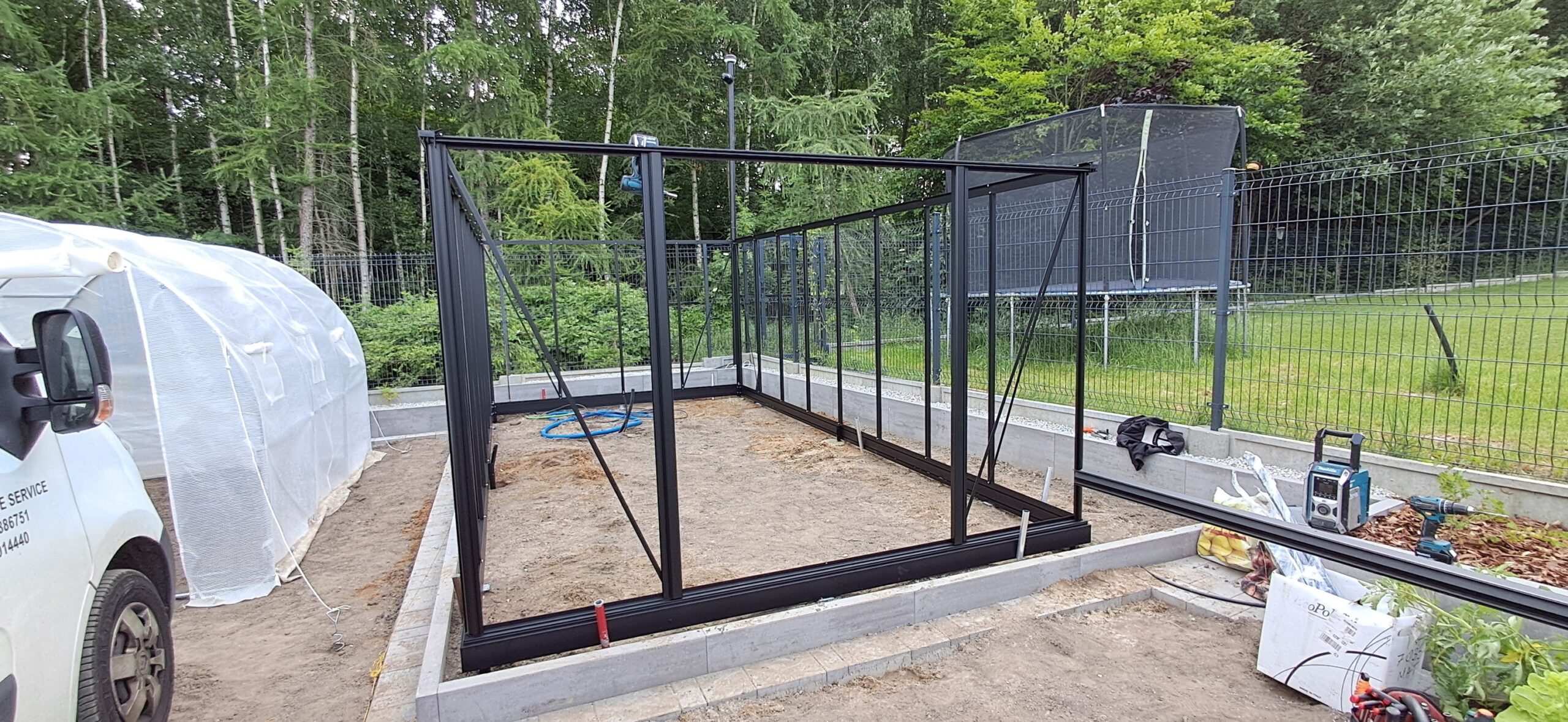 Montaż szklarni ogrodowej Euro Maxi o wymiarach 309cm x 604cm. Aluminiowa konstrukcja w kolorze RAL 9005 – czarny głęboki strukturalny została w całości pokryta szybą hartowaną 4mm. Na dachu zamontowano cztery okna z automatycznym mechanizmem otwierania. Na krótszej ścianie podwójne drzwi przesuwne o szerokości 2x70cm. Wewnątrz cztery rzędy linek do uprawy warzyw wysokopiennych oraz trzyelementowa półka o długości 309cm. Wysokość ścian to 201cm, a wysokość kalenicy 270cm. Miejsce montażu – Wieszowa w województwie śląskim.