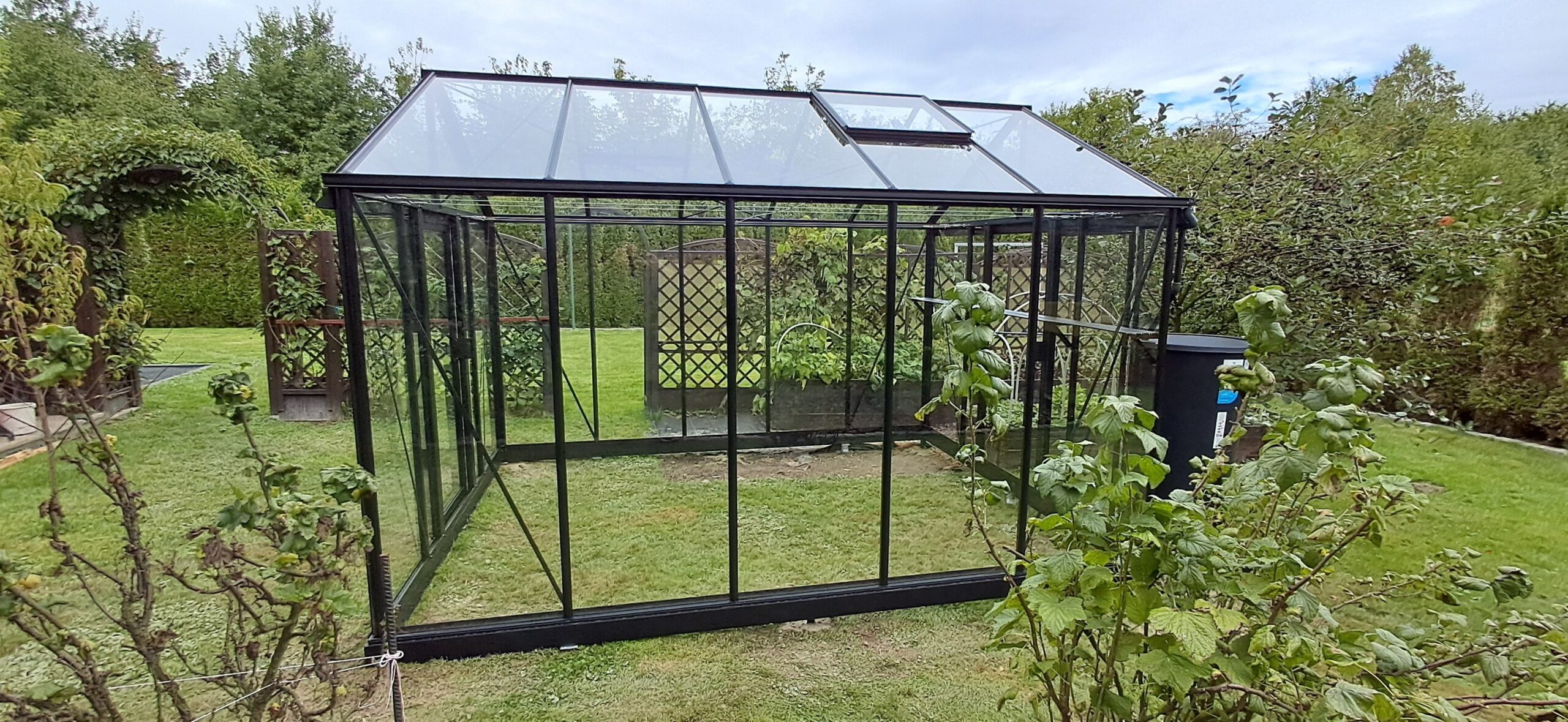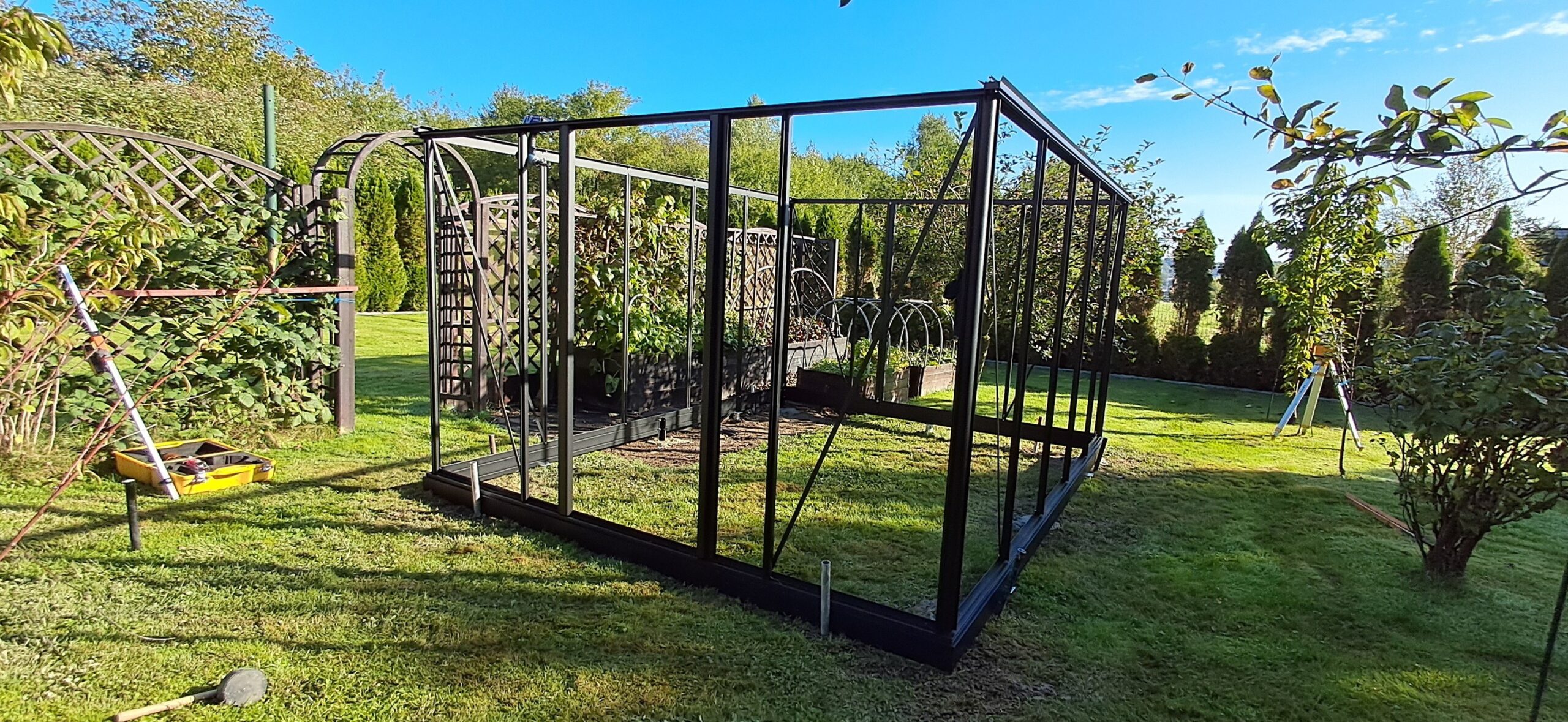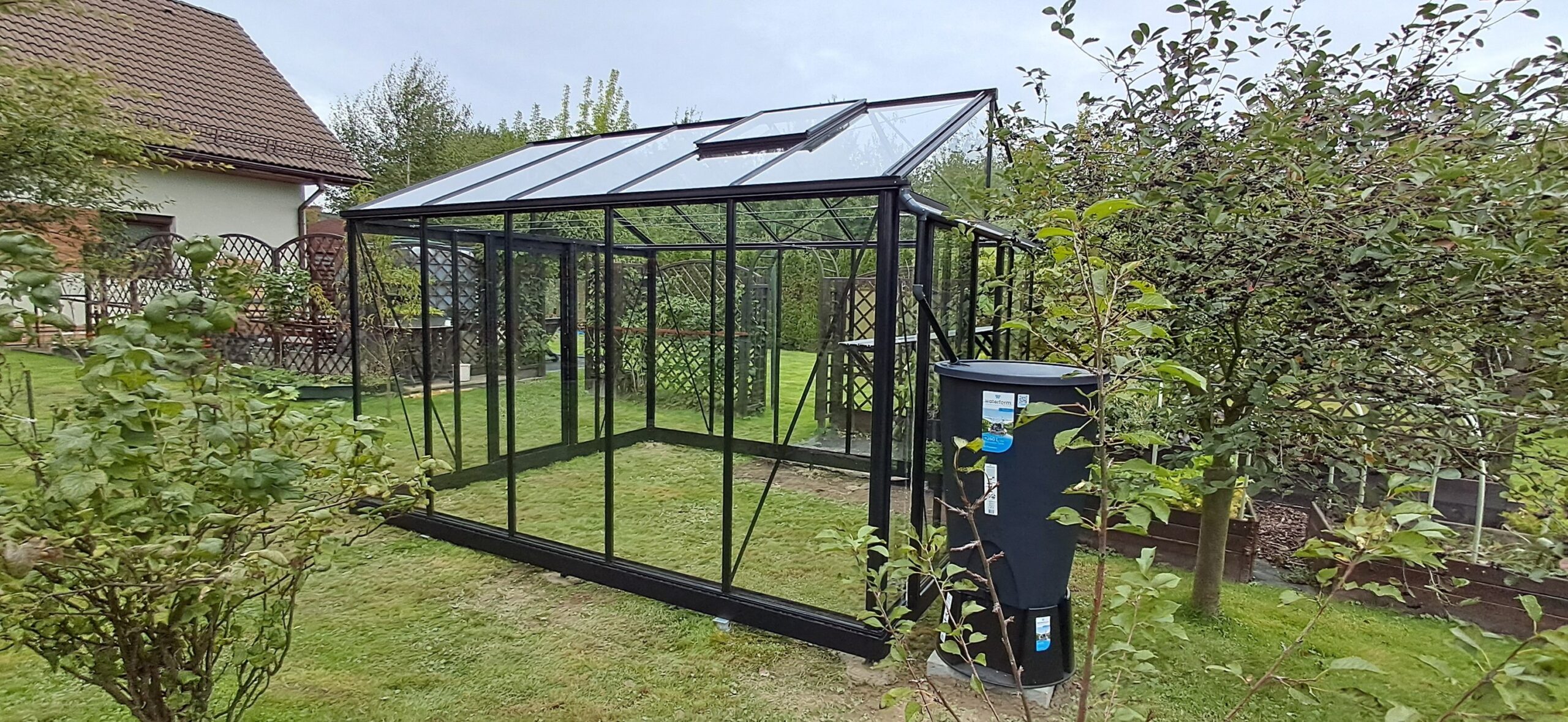 Montaż szklarni ogrodowej Euro Maxi o wymiarach 309cm x 380cm. Aluminiowa konstrukcja w kolorze RAL 9005 – czarny głęboki strukturalny została w całości pokryta szybą hartowaną 4mm. Na dachu zamontowano dwa okna z automatycznym mechanizmem otwierania. Na obu krótszych ścianach pojedyncze drzwi przesuwne o szerokości 84cm. Wewnątrz cztery rzędy linek do uprawy warzyw wysokopiennych oraz dwuelementowa półka o długości 309cm. Woda deszczowa odprowadzana jest do zbiornika o pojemności 260L za pomocą systemu połączonych rur spustowych. Wysokość ścian to 201cm, a wysokość kalenicy 270cm. Miejsce montażu – Wodzisław Śląski w województwie śląskim.