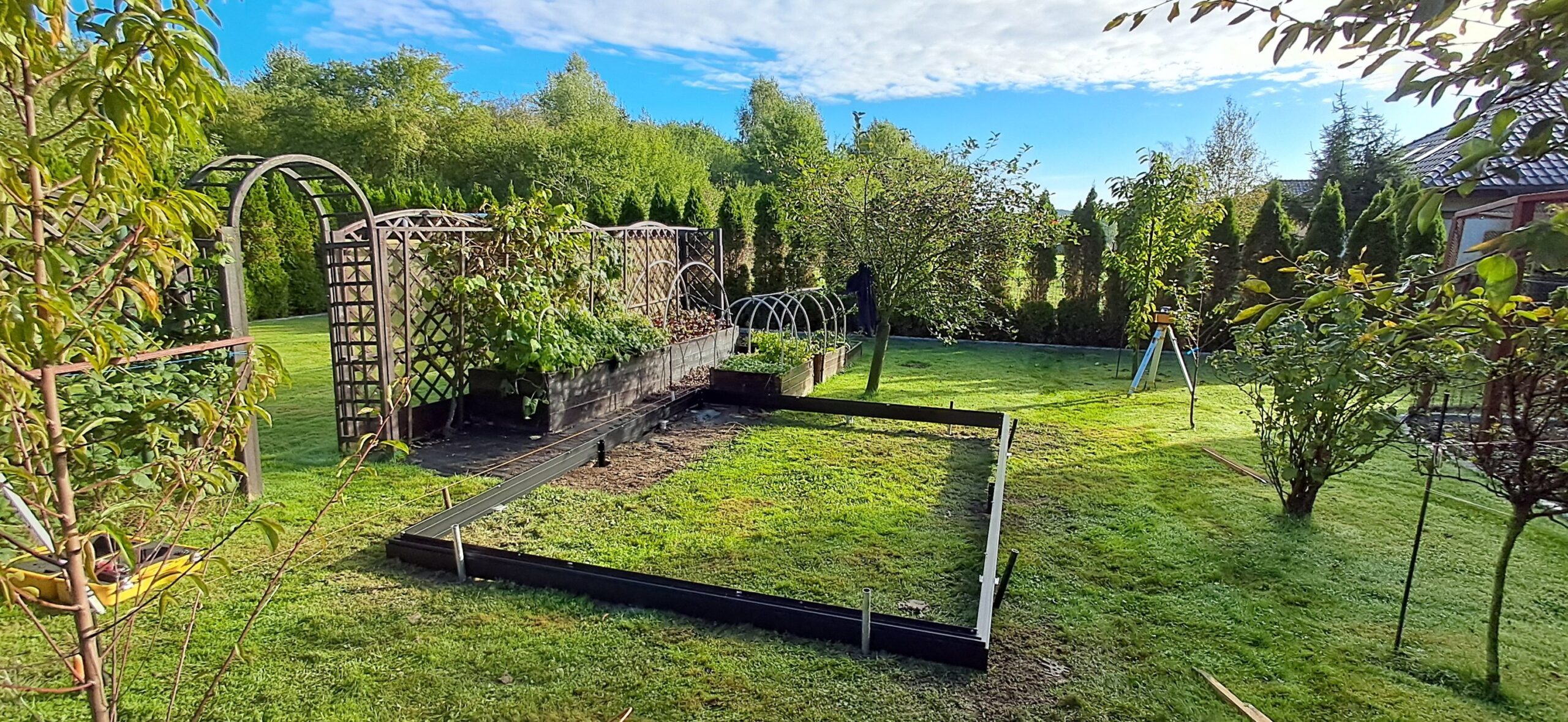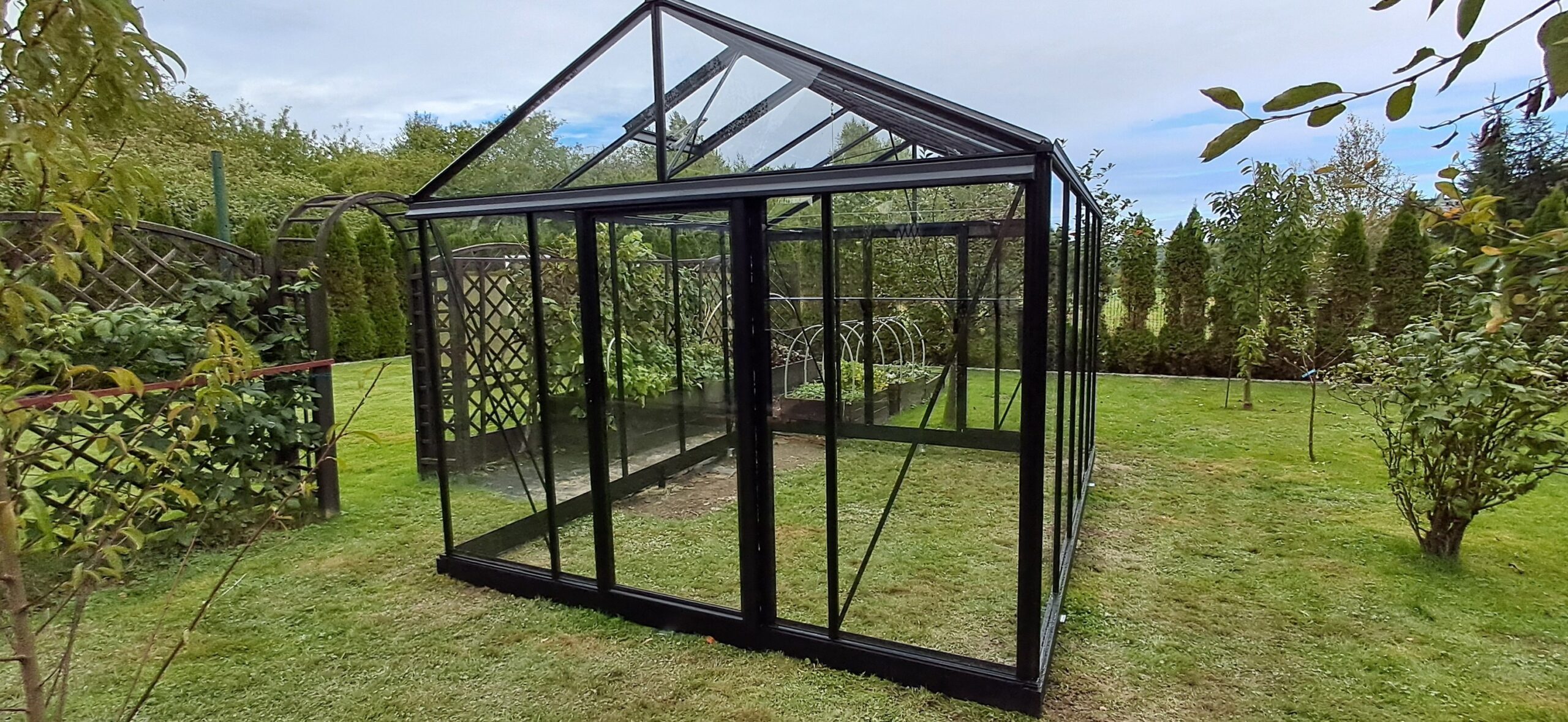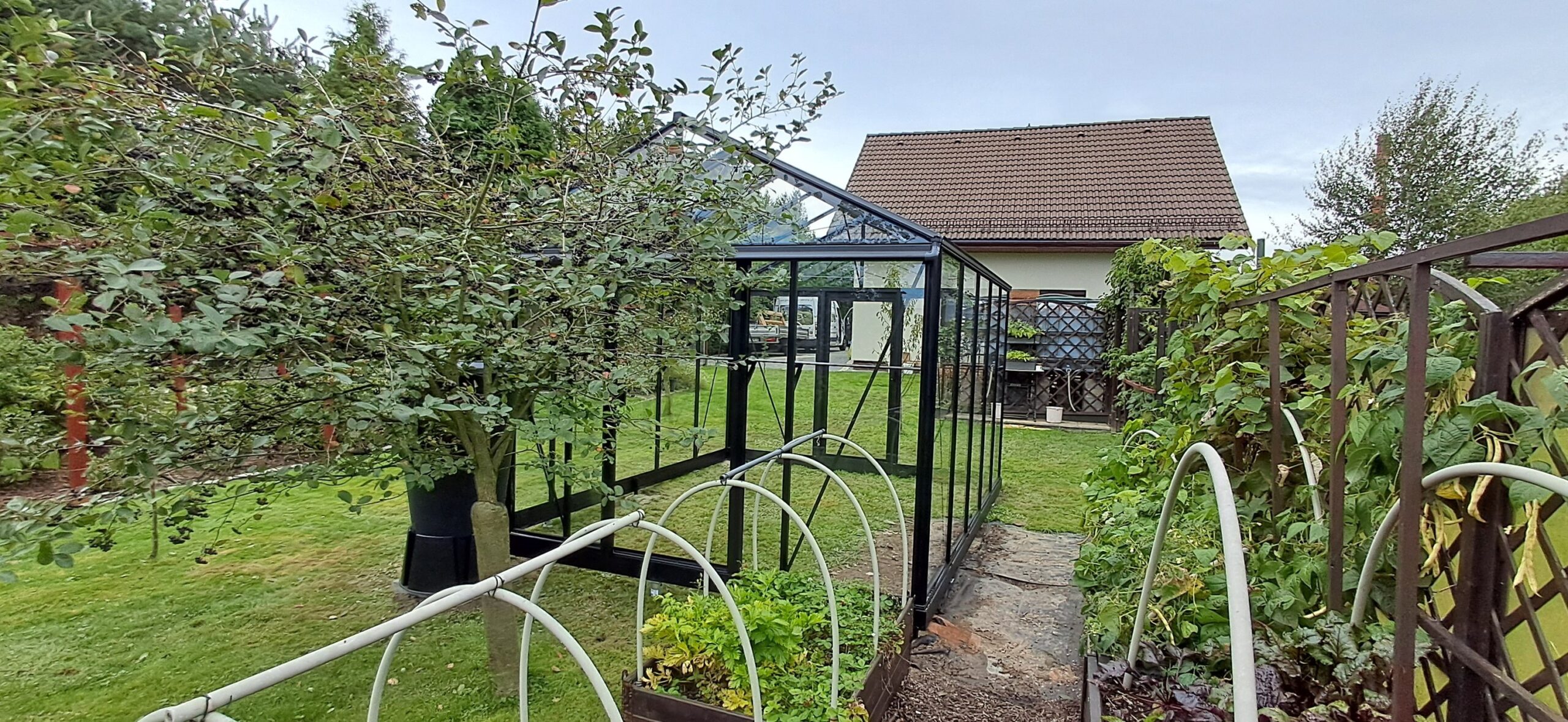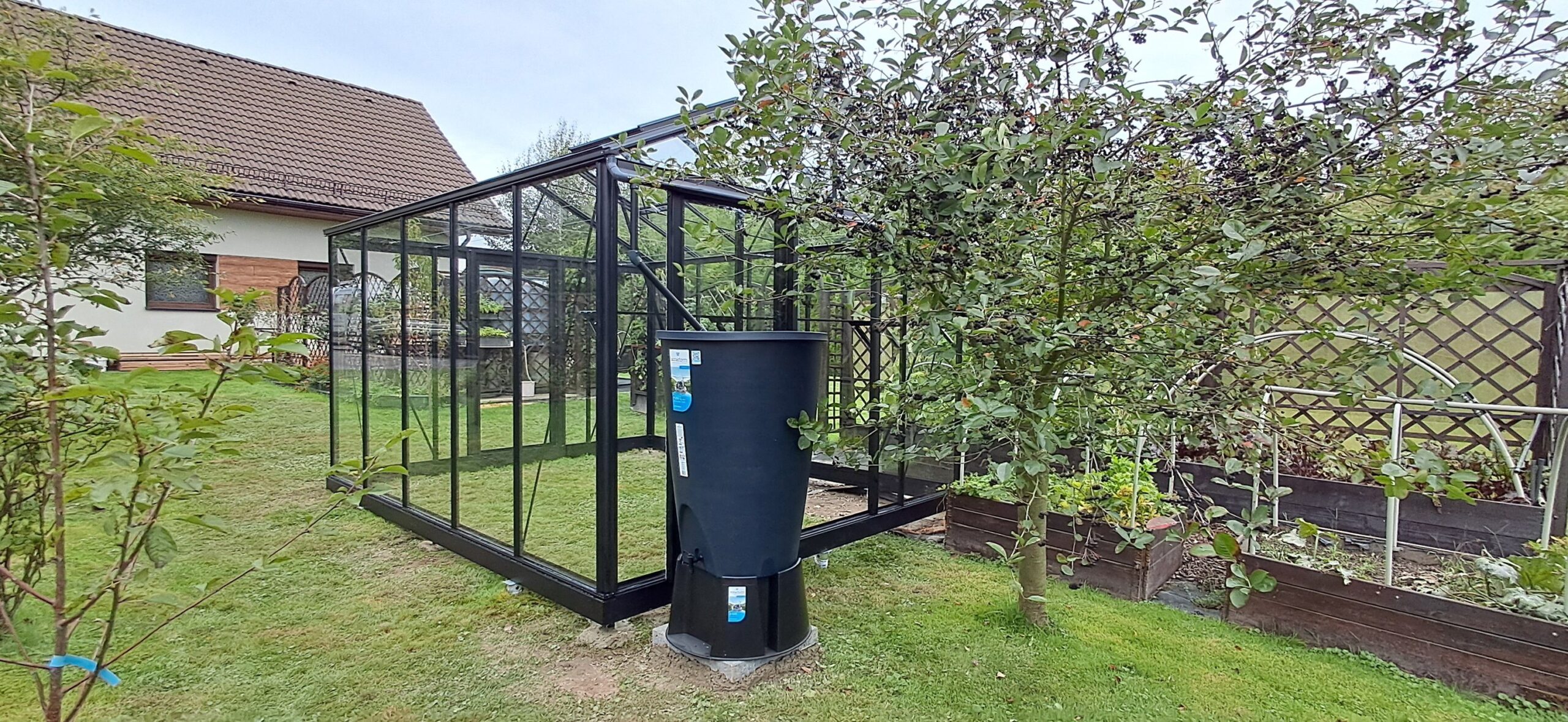 Montaż szklarni ogrodowej Euro Maxi o wymiarach 309cm x 380cm. Aluminiowa konstrukcja w kolorze RAL 9005 – czarny głęboki strukturalny została w całości pokryta szybą hartowaną 4mm. Na dachu zamontowano dwa okna z automatycznym mechanizmem otwierania. Na obu krótszych ścianach pojedyncze drzwi przesuwne o szerokości 84cm. Wewnątrz cztery rzędy linek do uprawy warzyw wysokopiennych oraz dwuelementowa półka o długości 309cm. Woda deszczowa odprowadzana jest do zbiornika o pojemności 260L za pomocą systemu połączonych rur spustowych. Wysokość ścian to 201cm, a wysokość kalenicy 270cm. Miejsce montażu – Wodzisław Śląski w województwie śląskim.