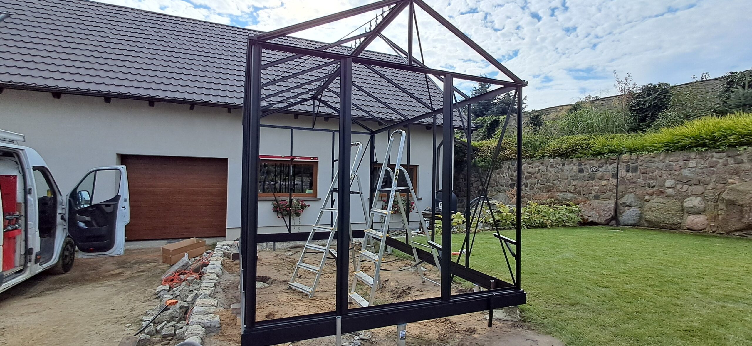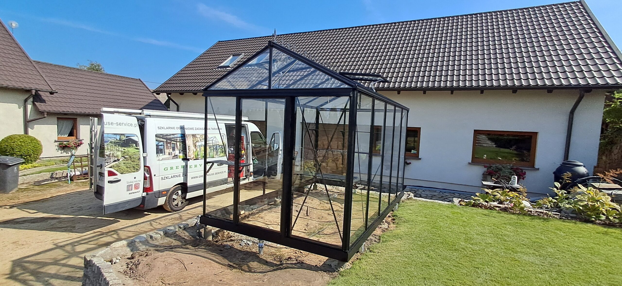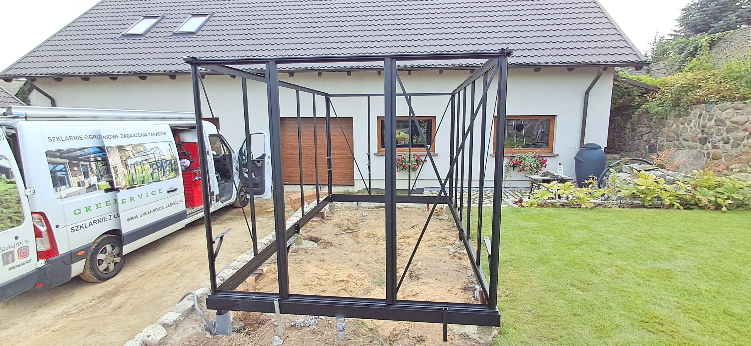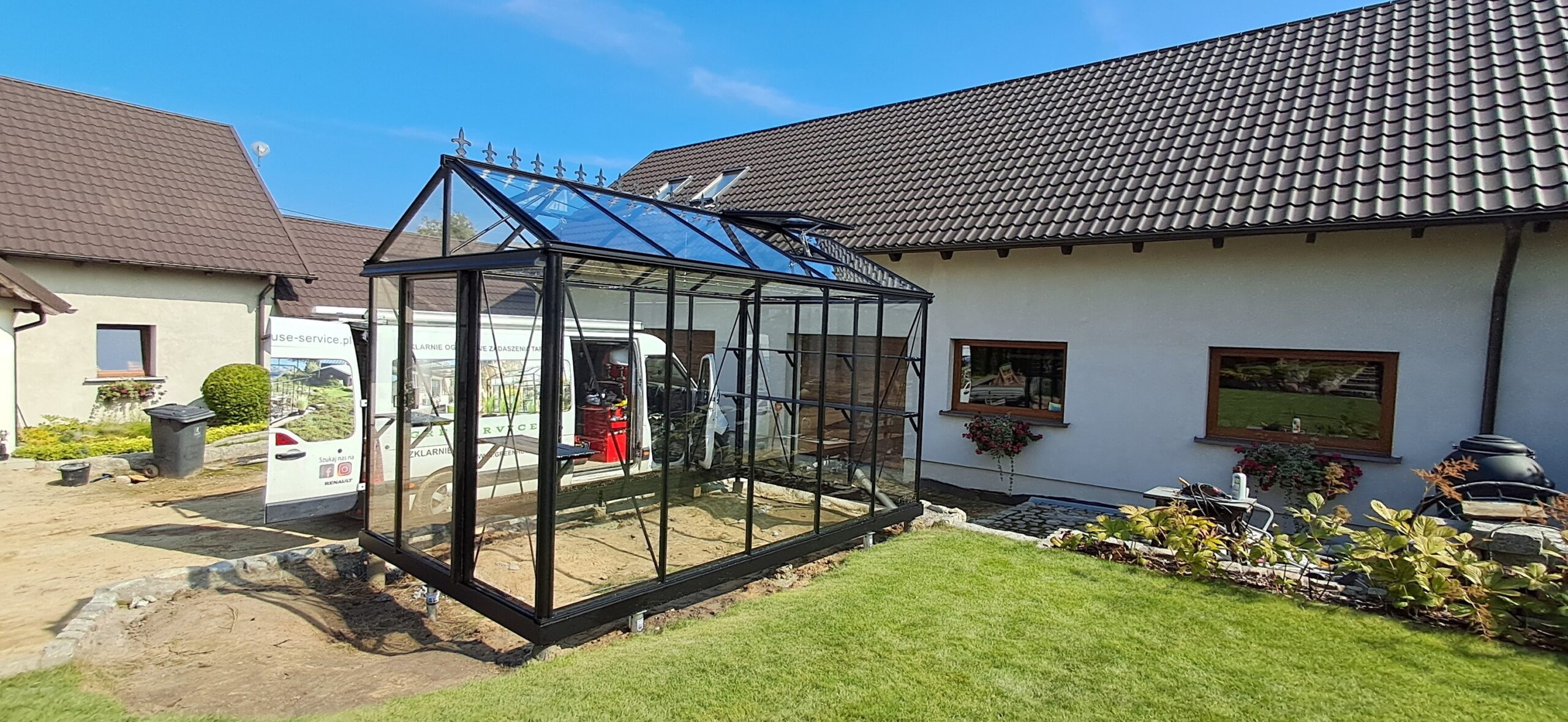 Montaż szklarni ogrodowej Euro Maxi o wymiarach 236cm x 380cm. Aluminiowa konstrukcja w kolorze RAL 9005 – czarny głęboki strukturalny została w całości pokryta szybą hartowaną 4mm. Na dachu zamontowano dwa okna z automatycznym mechanizmem otwierania. Na krótszej ścianie pojedyncze drzwi przesuwne o szerokości 84cm. Na kalenicy zdobienie szczytu w wiktoriańskim stylu. Wewnątrz dwie trzyelementowe półki o długości 236cm, dwie trzyelementowe półki o długości 80cm oraz cztery rzędy linek do uprawy warzyw wysokopiennych. Wysokość ścian to 201cm, a wysokość kalenicy 256cm. Miejsce montażu – Winna w województwie wielkopolskim.