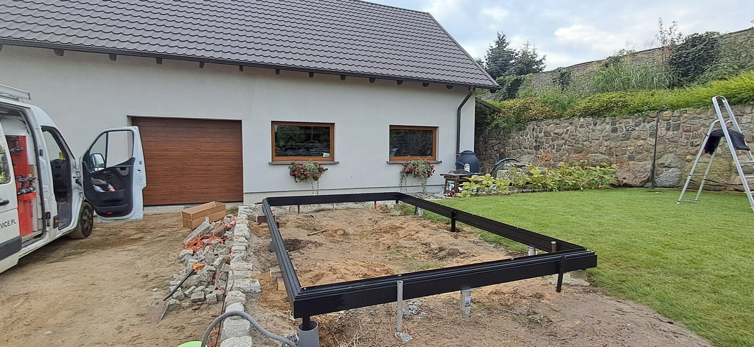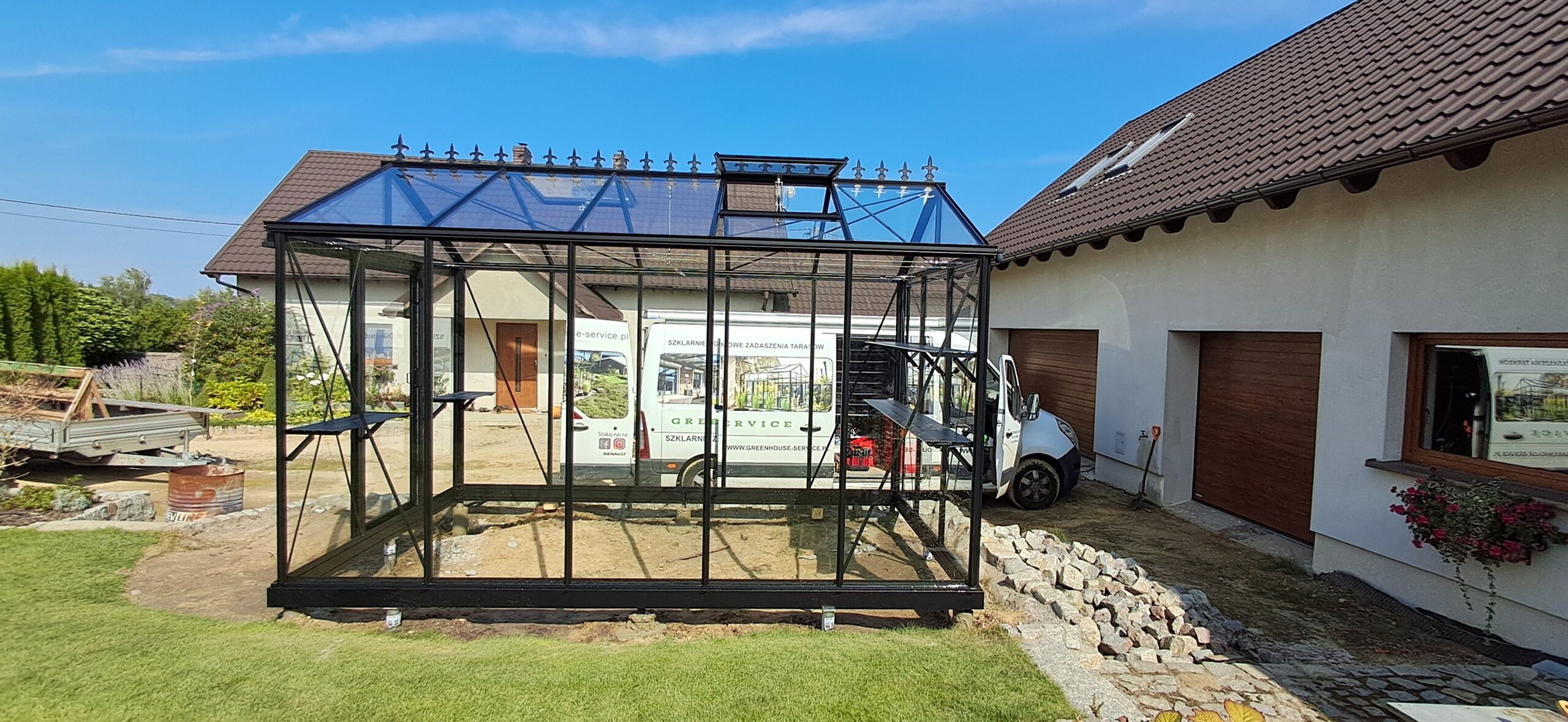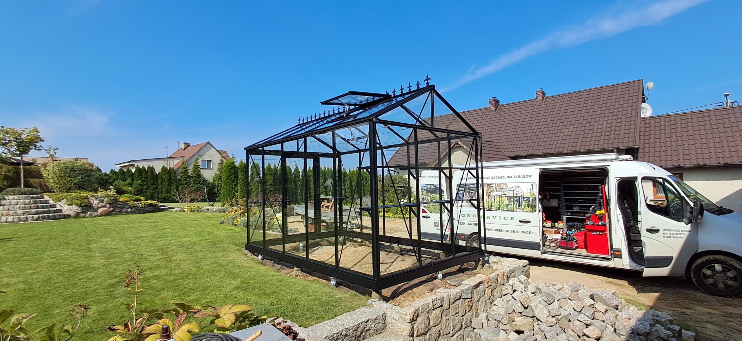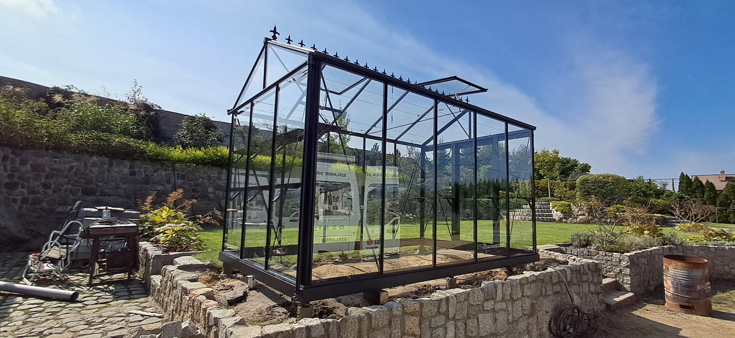 Montaż szklarni ogrodowej Euro Maxi o wymiarach 236cm x 380cm. Aluminiowa konstrukcja w kolorze RAL 9005 – czarny głęboki strukturalny została w całości pokryta szybą hartowaną 4mm. Na dachu zamontowano dwa okna z automatycznym mechanizmem otwierania. Na krótszej ścianie pojedyncze drzwi przesuwne o szerokości 84cm. Na kalenicy zdobienie szczytu w wiktoriańskim stylu. Wewnątrz dwie trzyelementowe półki o długości 236cm, dwie trzyelementowe półki o długości 80cm oraz cztery rzędy linek do uprawy warzyw wysokopiennych. Wysokość ścian to 201cm, a wysokość kalenicy 256cm. Miejsce montażu – Winna w województwie wielkopolskim.