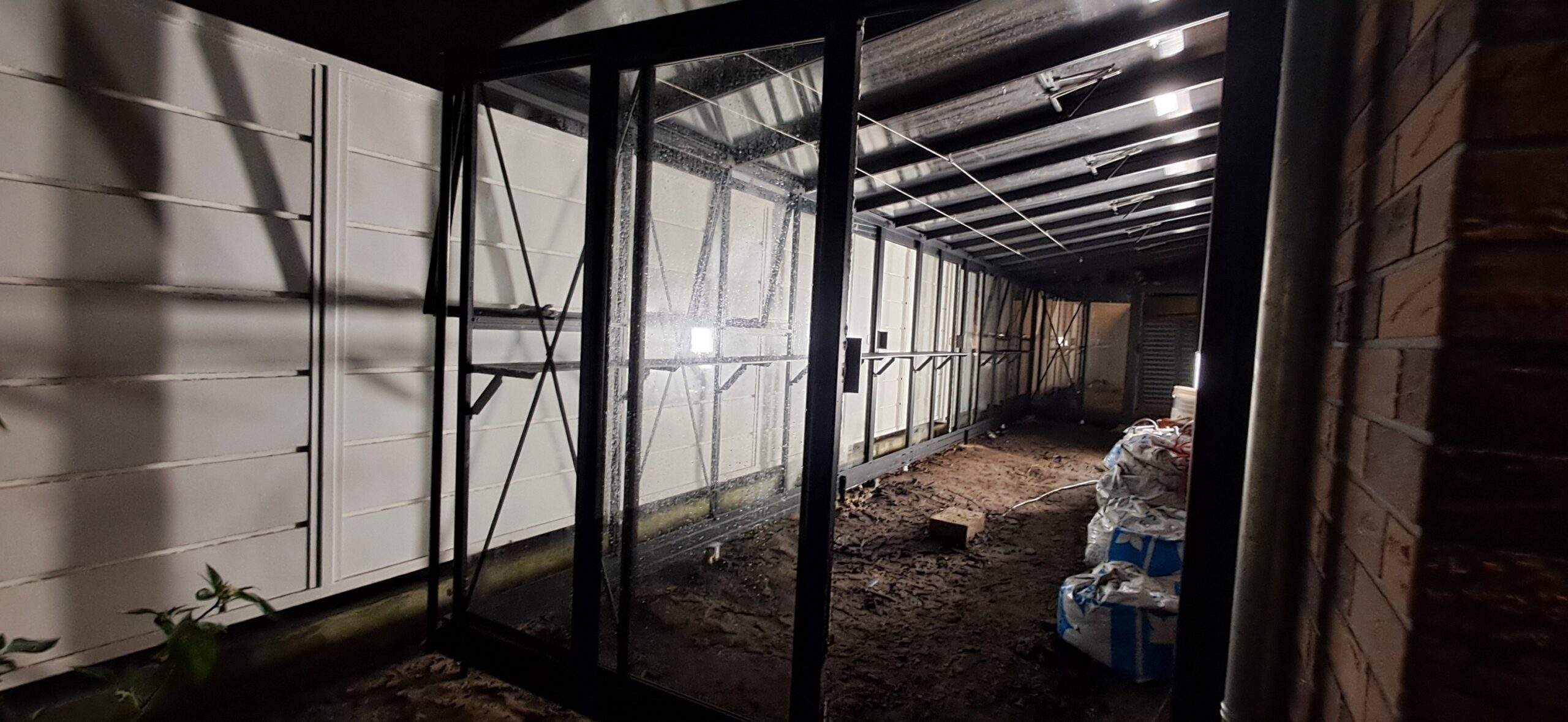 Montaż szklarni przyściennej Euro Muurserre o wymiarach 233cm x 977cm. Aluminiowa konstrukcja w kolorze RAL 9005 – czarny głęboki strukturalny została na dachu pokryta poliwęglanem komorowym 8mm bezbarwnym, a na ścianach szybą hartowaną 4mm. Na dachu zamontowano pięć okien z automatycznym mechanizmem otwierania. Na obu krótszych ścianach pojedyncze drzwi przesuwne o szerokości 84cm. Na dłuższej ścianie dwie sztuki pojedynczych drzwi przesuwnych oraz cztery okna ścienne z mechanizmem otwierania AXA-FLEX. Wewnątrz dwa rzędy linek do uprawy warzyw wysokopiennych oraz dwie trzyelementowe półki o długości 236cm oraz 530cm. Wysokość ścian to 201cm, a wysokość kalenicy 252cm. Miejsce montażu – Poznań w województwie wielkopolskim.