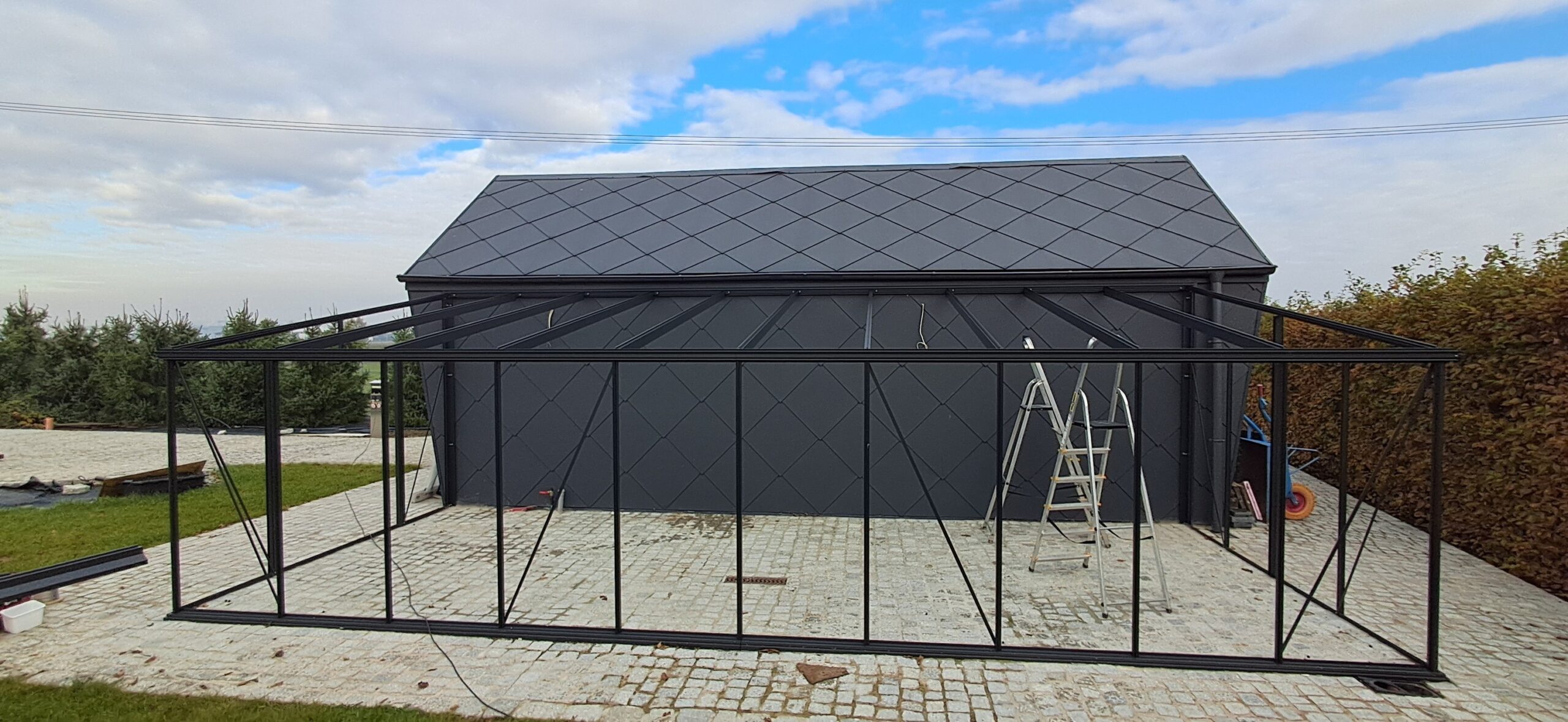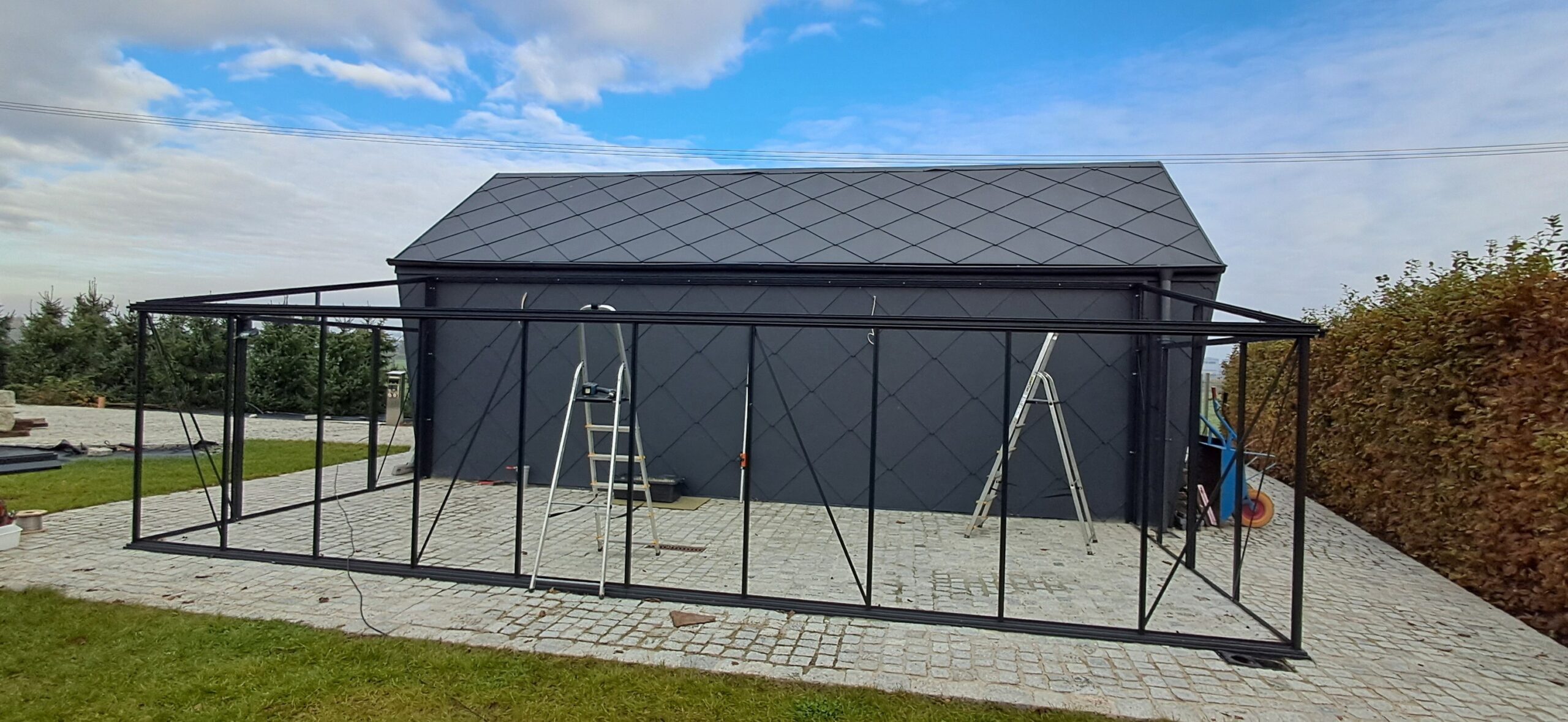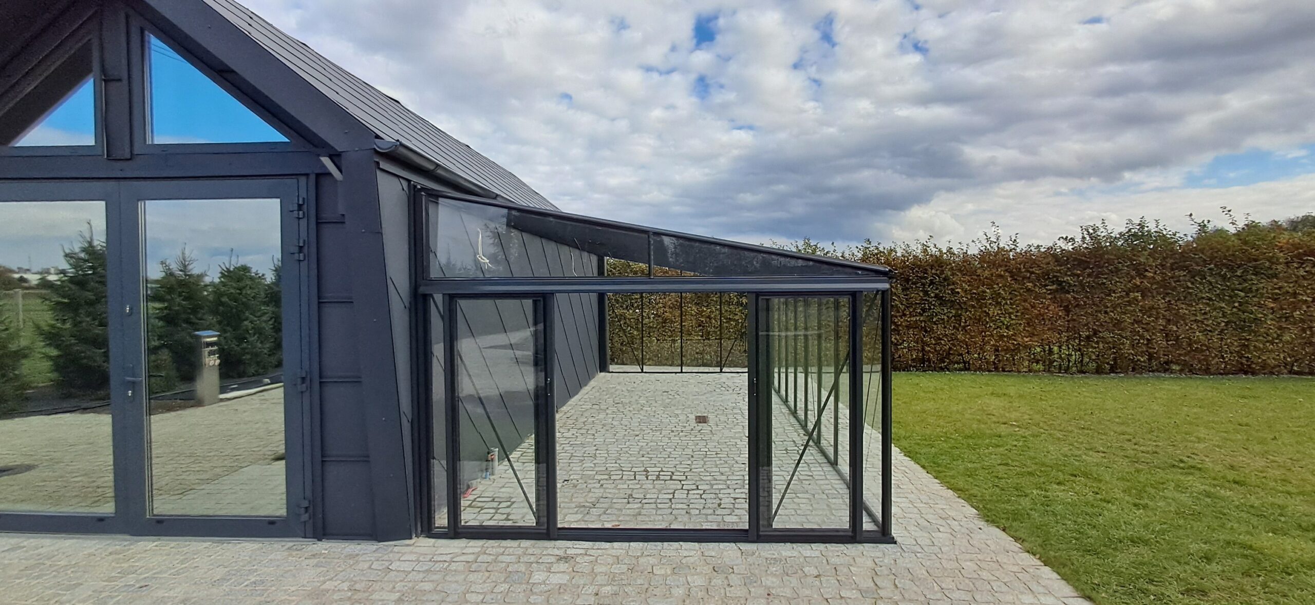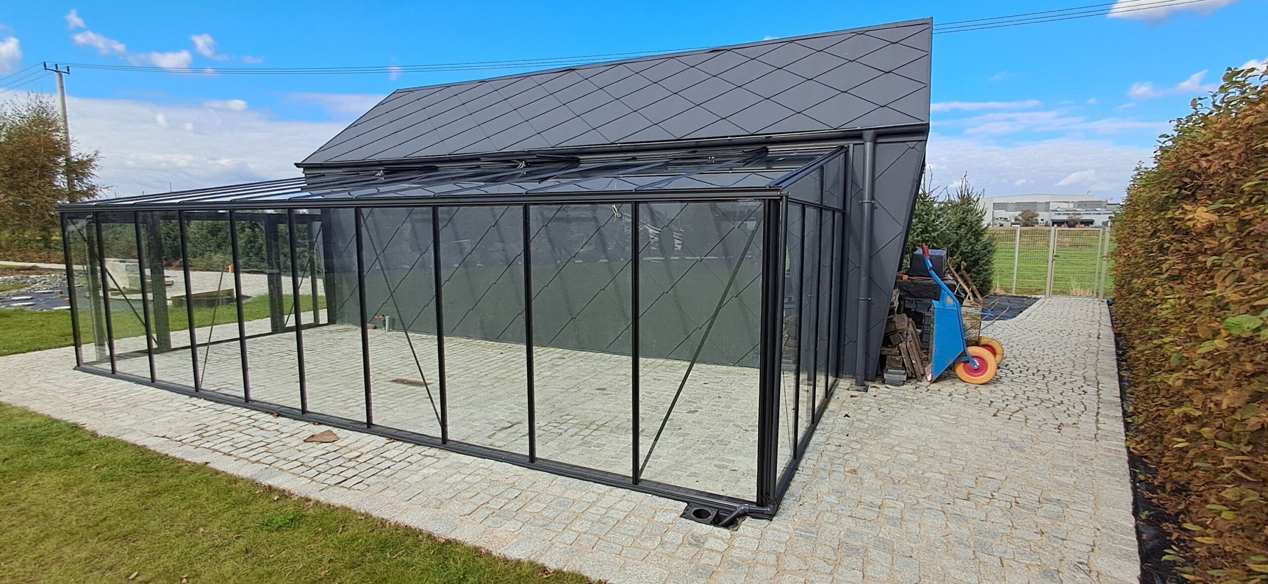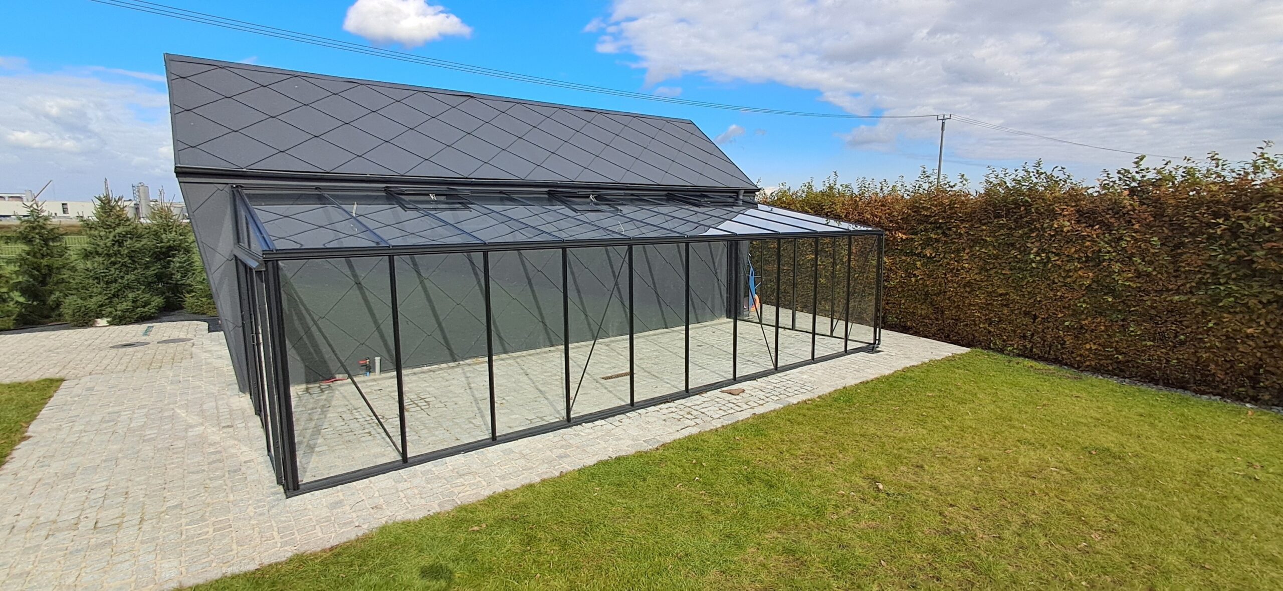 Montaż szklarni przyściennej Euro Muurserre o wymiarach 308cm x 753cm. Aluminiowa konstrukcja w kolorze RAL 7016 – szary antracytowy została na dachu pokryta szybą hartowaną 5mm, a na ścianach szybą hartowaną 4mm w pełnym wymiarze. Na dachu zamontowano trzy okna z automatycznym mechanizmem otwierania. Na krótszej ścianie podwójne drzwi przesuwne o szerokości 2x70cm. Wysokość ścian to 181cm, a wysokość kalenicy 241cm. Miejsce montażu – Tychy w województwie śląskim.
